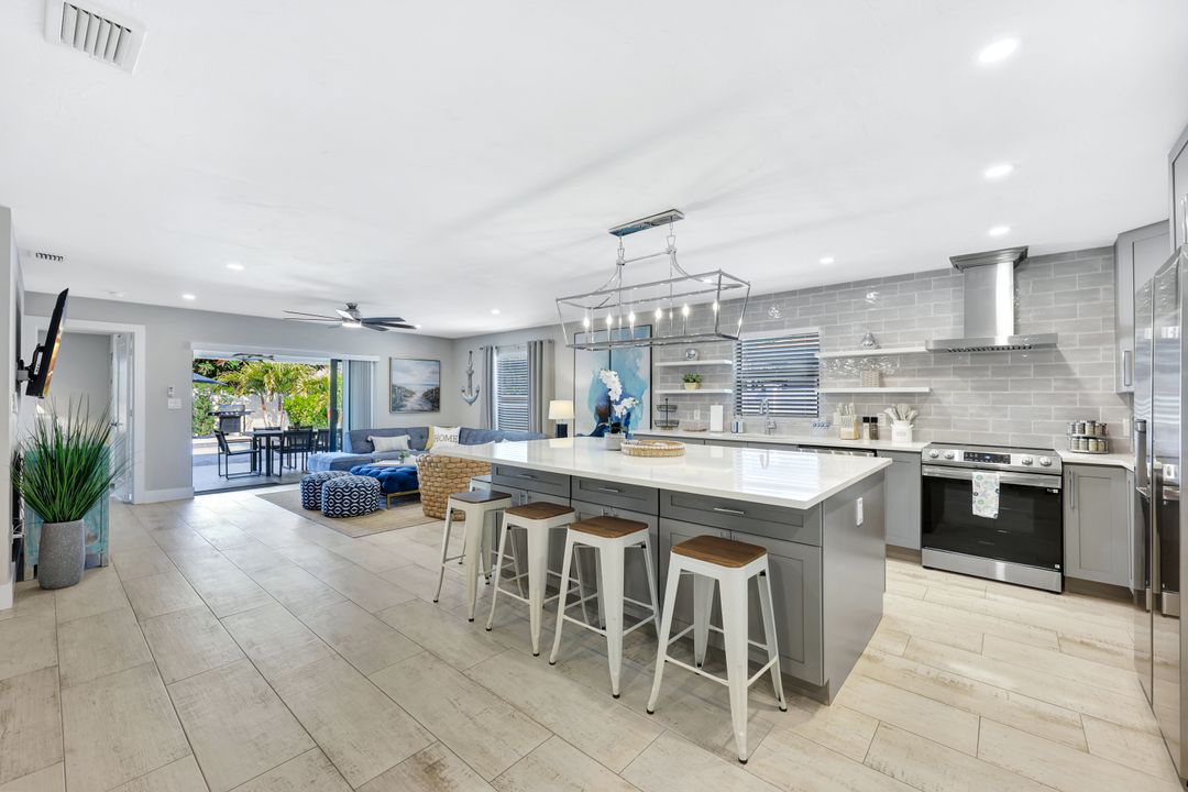 Spectacular completely updated and renovated pool home in sought after Naples Park. Only the finest quality materials, finishes & superior workmanship with attention to every detail were used to create this home like no other currently on the market: Newer roof, high end impact windows and doors, electrical, plumbing, HVAC & epoxy garage floor. Tile flooring throughout the front to back through and through open concept living space with custom designed modern all wood cabinets in the kitchen & bathrooms with dovetail drawers, soft close doors & drawers hardware, a gourmet chef inspired kitchen with oversized counter height island bar & all new kitchen appliances that make this perfect for entertaining guest. The living area spills out to the under roof covered lanai & the new stone paver deck and heated pool that still leaves room for a fenced-in yard for your pets. Meticulously planned landscaping surrounds the home. Take a stroll or bike ride down to Vanderbilt Beach, Wiggins Pass State Park, upscale shopping and dining at Mercato or other nearby entertainment opportunities. NO HOA constraints or leasing limitations, positioning this property as an ideal vacation rental, second home or a full time residence. This retreat in paradise awaits you!