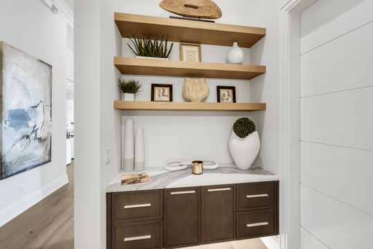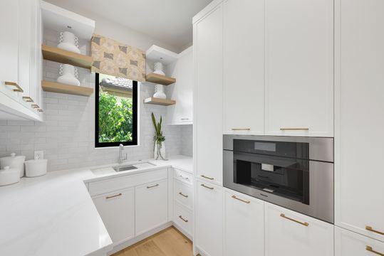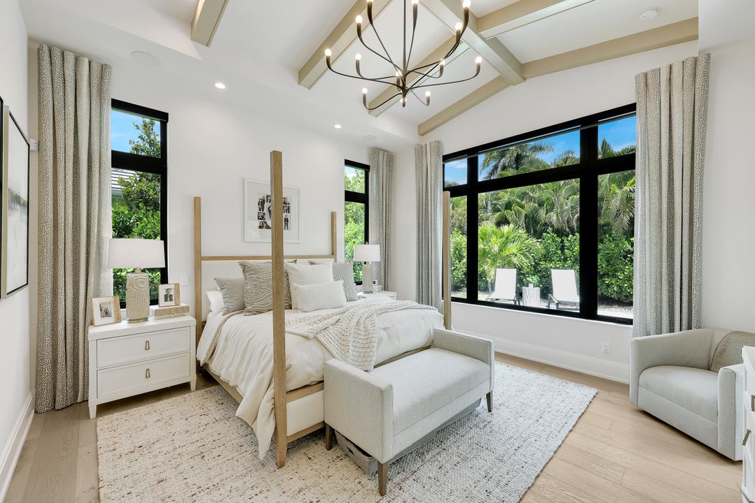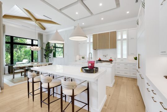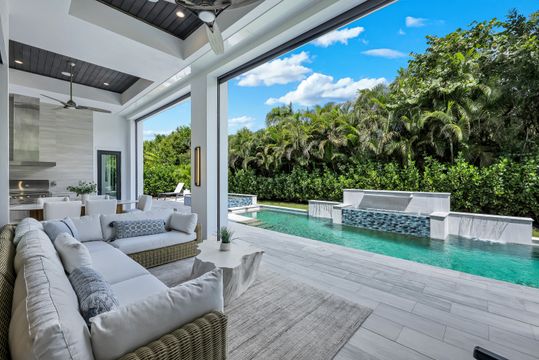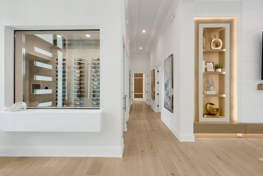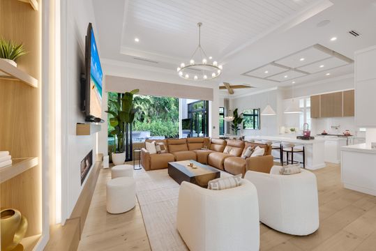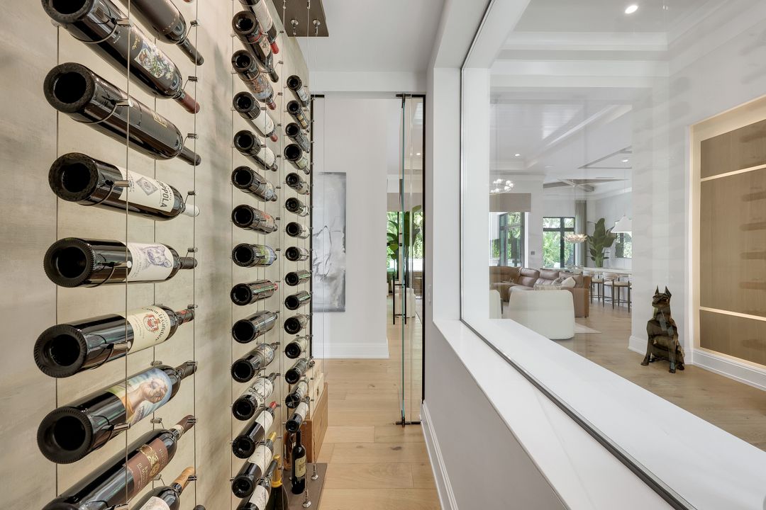 From the moment one enters, the home reveals a mastery of craftsmanship. A custom climate-controlled wine room, soaring detailed ceilings, bespoke millwork, wide-plank European white oak flooring, and curated designer lighting create an ambiance that is both sophisticated and inviting. The great room, anchored by dramatic architectural detailing, floor to ceiling sliders and a statement fireplace—flows effortlessly to the outdoors, dissolving the boundaries between interior refinement and resort-style living. Smart home technology, integrated AV and lighting, advanced security systems, automated shades and a whole-house generator provide modern convenience and peace of mind without compromise.