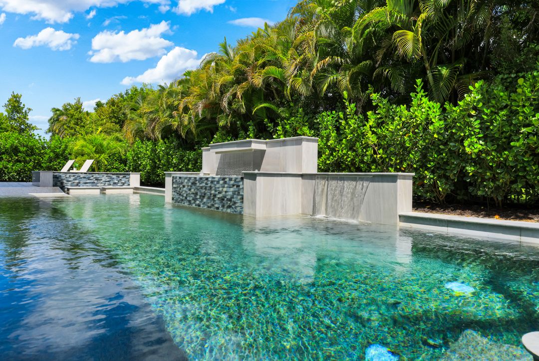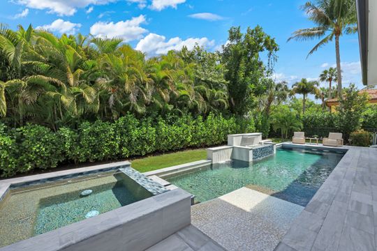 Outdoors, the residence transforms into a private resort. A spectacular saltwater pool with an integrated spa and swim-up seating is surrounded by expansive entertaining areas, lush landscaping, and a fully equipped outdoor kitchen. Motorized screens and hurricane shutters blend seamlessly into the architecture, allowing for year-round enjoyment at the touch of a button. Set at 12 feet (per elevation certificate) in Zone X on a generous .32-acre homesite, the property offers elevation, privacy, and space, while a circular drive and split three-car garage complete the estate experience.