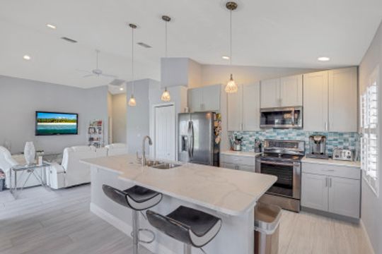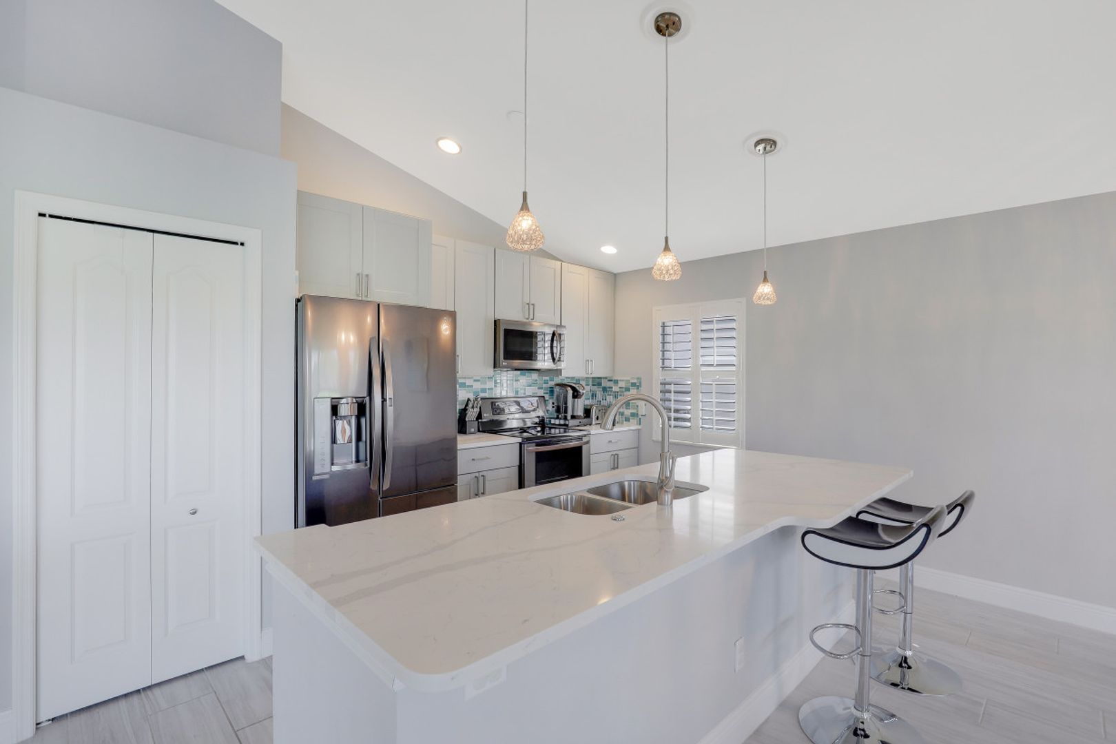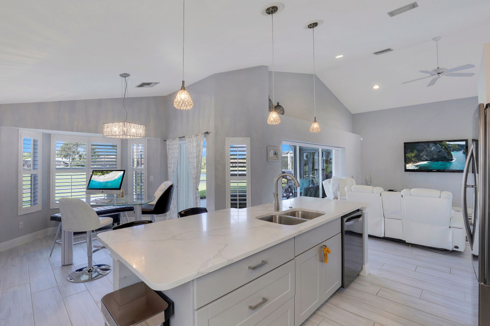 If you are looking for freshly updated coastal contemporary interior look no further. Located in Indian Wells Golf Villas of Lely Resort, this three bedroom two bath home has been completely remodeled from head to toe. Featuring freshly painted interior and exterior, new modern tile flooring throughout and plantation shutters. Large living space looks out to lake and golf course views! Completely remodeled kitchen is equipped with shaker cabinetry, stainless steel appliances, and a large island with quartz countertops. Spa Like master bathroom includes his and her vanities, beautiful walk-in shower and tub. Entertaining guests is made easy with your large screen lanai with a covered sitting area, which is the perfect place to watch the sun set. Lely Resort has world renown amenities and stunning golf courses. Perfectly nestled in between the white sandy beaches of Marco island and the night life that downtown Naples offers. Don’t miss out on owning this piece of paradise!