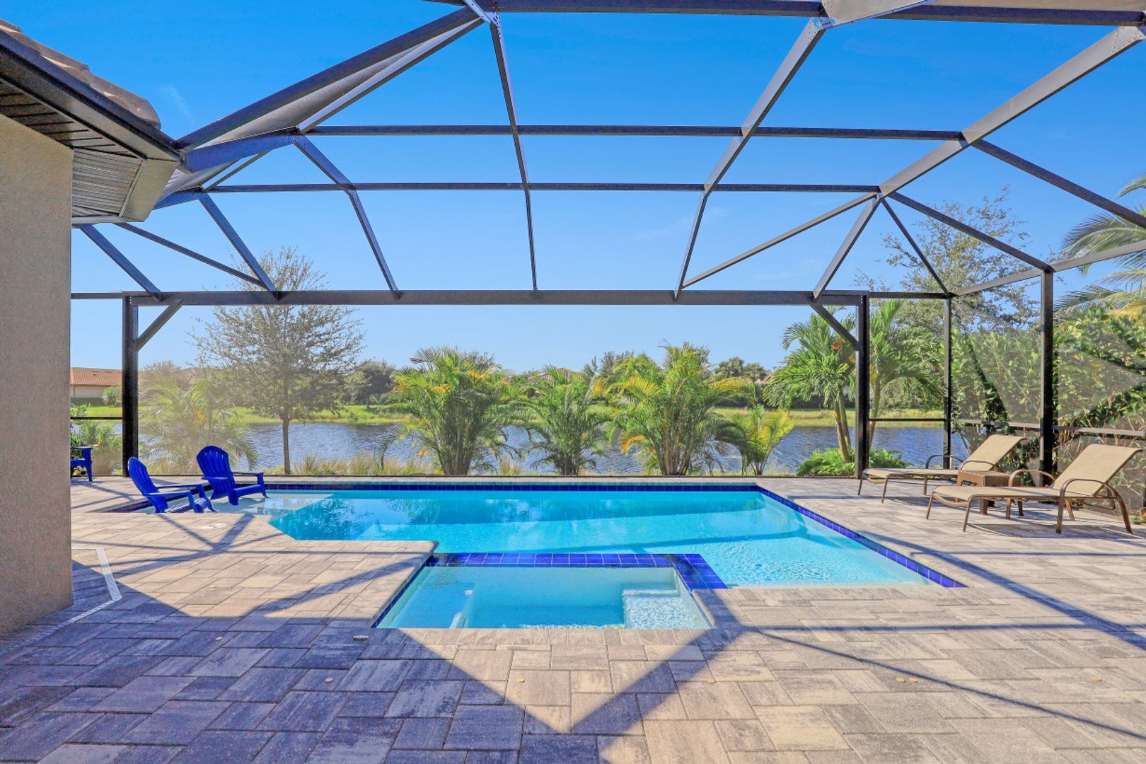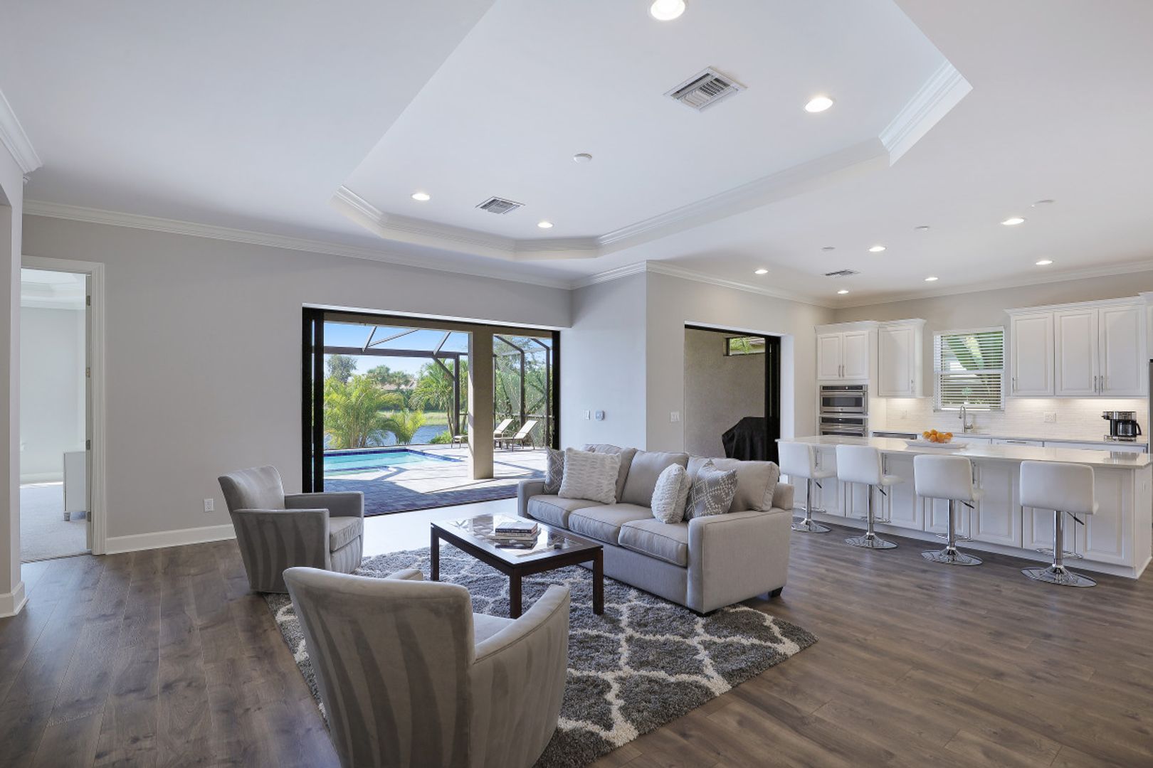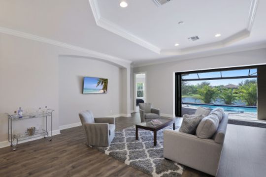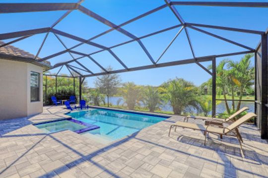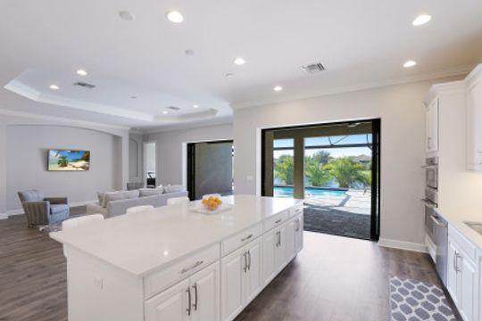 Start living a vacation lifestyle in Esplanade! This well appointed "Palazzio" offers 3 Bedrooms, Den, 3 full baths, & 2976 Sq Ft under air. Situated on a highly desired lake front lot with SOUTHERN EXPOSURE - this home is light and bright all day long! The double door entry leads you to an open floorplan with wood look floors & a generous Kitchen including a massive center island, Level V cabinets & Quartz countertops, & GE Cafe Appliances including wall oven, hood, & GAS cooktop. Two sets of pocket sliding glass doors lead you to the covered lanai complete with a GAS heated pool/spa/sunshelf, picture window screen enclosure, & outdoor kitchen preplumb. Storm ready with IMPACT WINDOWS/DOORS! Esplanade at Hacienda Lakes is a gated community that provides something for everyone: a 6,500 sq ft amenity center with fitness center, a movement room, multi-purpose activities room, resort-style pool & spa area with lap lanes, a resistance pool, covered lanai, cabanas, and a fire pit. There is also a special events lawn, tot lot, dog park, tennis court, 4 pickleball courts, and 2 bocce courts. LOW HOA Fees of $965/quarter incl lawn care! Just 18 min from Beaches/5th Ave/3rd St/Marco Island.