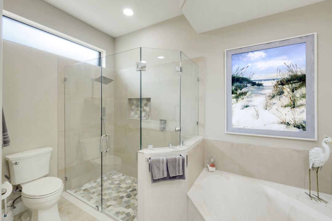 This beautifully updated single-family home offers peaceful water views, modern improvements and the privacy that comes with a detached residence in a gated community. Situated on high elevation in the preferred X-zone, this home has approximately 1,600 square feet of living space, 3 bedrooms, 2 bathrooms, and a 2-car garage, delivering an ideal balance of comfort, functionality, and low-maintenance living in a highly desirable North Naples location. The thoughtfully designed floor plan showcases vaulted ceilings and an open-concept main living area filled with natural light, creating an inviting atmosphere well suited for both everyday living and entertaining. The kitchen has been enhanced with brand-new LG appliances offering both style and performance, while updated lighting and fixtures throughout the home contribute to a clean, contemporary feel. The primary suite provides a relaxing retreat overlooking the tranquil water view and features a renovated bathroom with quality finishes and attention to detail. A second renovated bathroom enhances comfort for guests and family, while two additional bedrooms provide flexibility for a home office, den, or guest accommodations. Recent upgrades provide exceptional peace of mind, including a new roof installed in 2023, a Lennox air conditioning system added in 2024, electric storm shutters on both the front door and rear doors of the home, plus an Anderson storm door for added protection. Interior improvements include new laminate flooring in the bedrooms, fresh paint, upgraded 5-inch base molding, plantation shutters, and electric silhouette shades in the living room. The laundry area features a new LG washer and dryer and the garage has been enhanced with a mini-split air conditioning system, built-in Kobalt storage cabinets, and a garage door opener with battery backup and remote access capability. Outdoor living is equally appealing, with a screened lanai that overlooks the peaceful water view and provides a comfortable space to relax or entertain. Additional enhancements such as new landscaping with stone accents and outdoor lanai shades. Residents of Ibis Cove enjoy low HOA fees that include cable and internet, along with access to resort-style amenities including a heated pool and spa, fitness center, tennis/pickleball courts, playground and scenic walking paths. Conveniently located near shopping, dining, entertainment, and the renowned white-sand beaches of Southwest Florida, this move-in ready single-family home with water views in the X-zone presents an outstanding opportunity to enjoy the best of North Naples living.