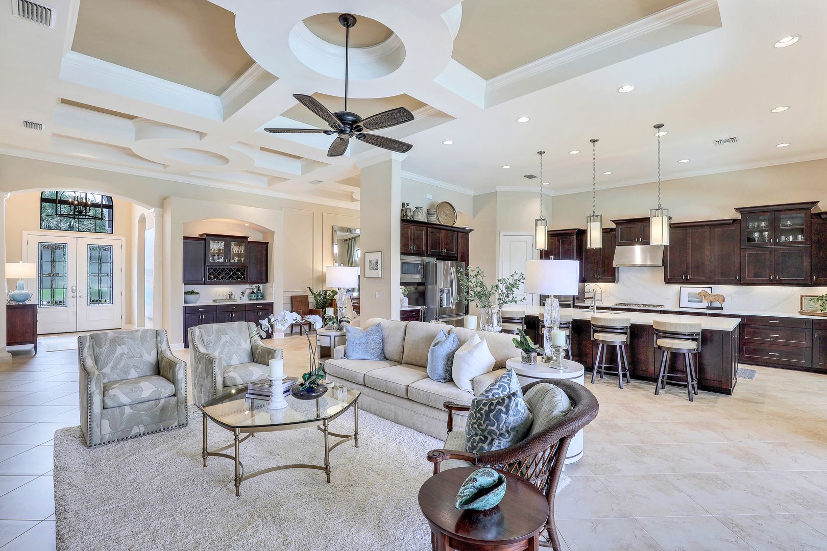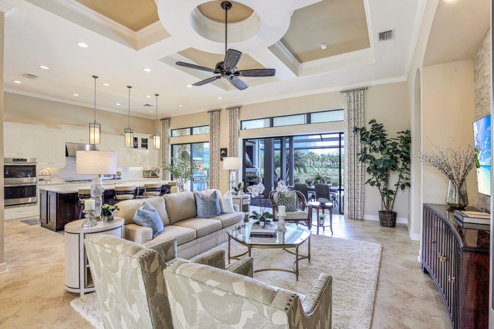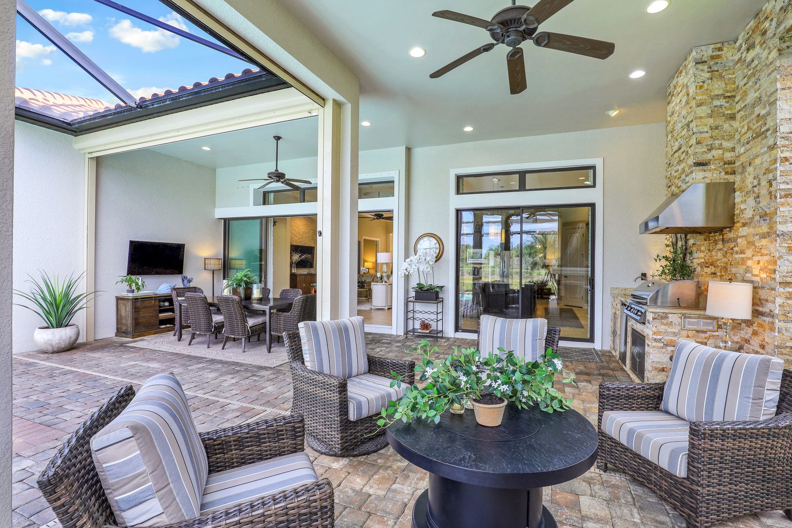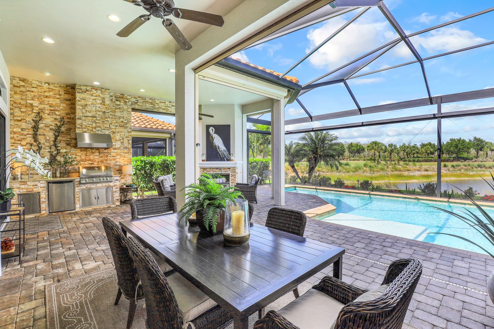 LIVE A VACATION LIFESTYLE IN ESPLANADE! Step inside this full golf membership included “Francesco" and be greeted with 12' ceilings throughout, impressive coffered ceiling details, tile & wood floors throughout, and spacious kitchen complete with GAS cooktop, double wall ovens, and NEW Calacatta Gold quartz countertops & full quartz backsplash! Two sets of sliding glass doors lead you to the extended covered lanai featuring a GAS heated pool/spa/sunshelf, outdoor kitchen, and GAS fireplace overlooking the lake & golf course with no other roof tops insight! Other features include: plantation shutters; fresh exterior paint; electric roll down shutters on the lanai; dry bar; stone wall detail on the lanai; windows galore including transom windows; diagonal tile floors; crown molding; double impact glass front doors; 8’ interior doors; custom window treatments; upgraded light fixtures; wood shaker cabinetry with dovetail construction; and more! Esplanade is a true "Lifestyle Community" with something for everyone: Resort Pool complete with cabanas and beach entrance; 6 tennis courts; 4 bocce balls courts; 4 pickleball courts; Koquina Day Spa offering hair, nail, facial, and spa treatments; Techno Gym with Aerobics Room; Gated Dog Park; Poolside Bahama Bar; 14 miles of bike/walking trails; 18 hole private golf course (Can use your own cart); 15,000 Sq Ft Culinary Center featuring restaurant, bars, wine tasting room, wine lockers, & Starbucks style cafe!