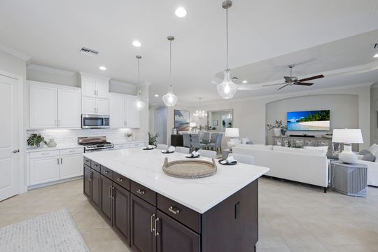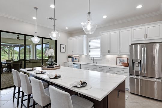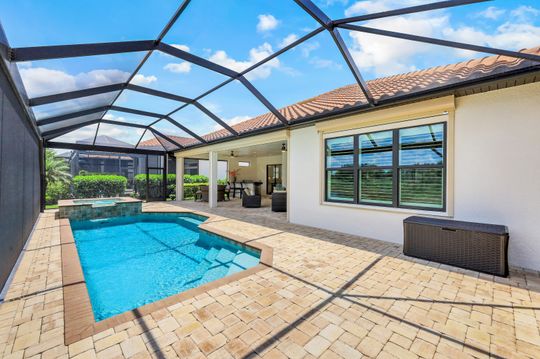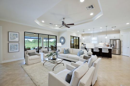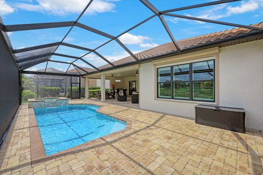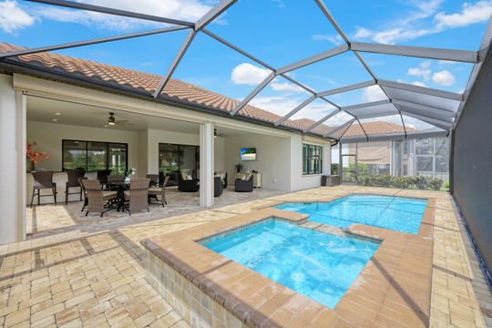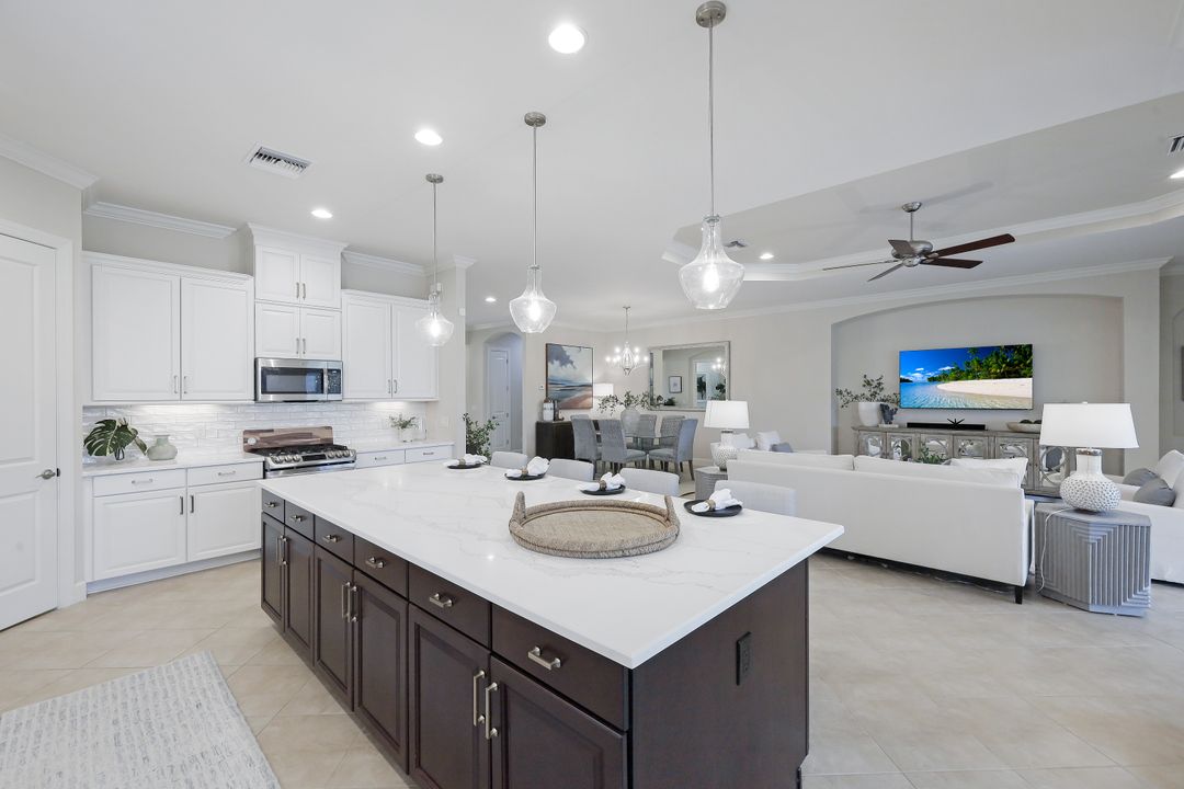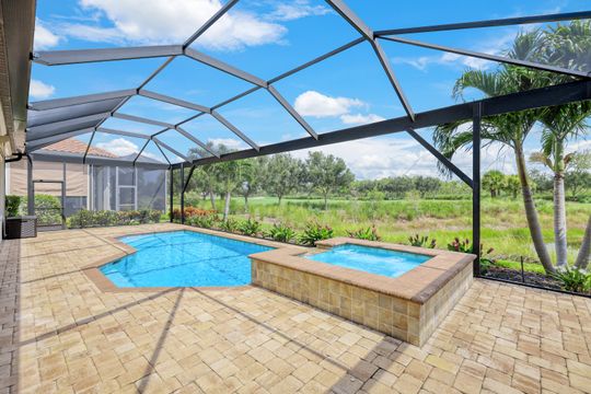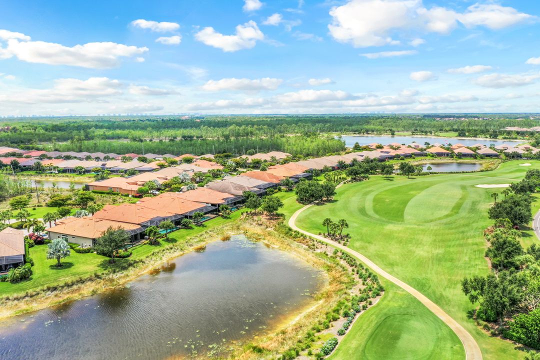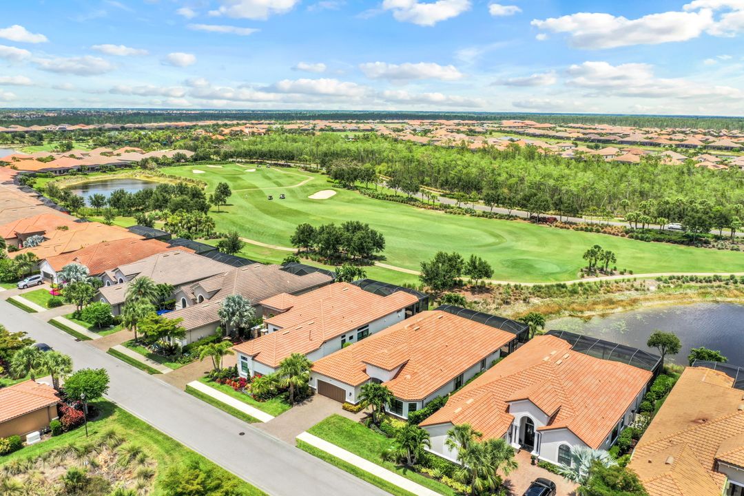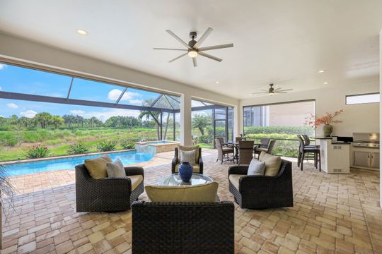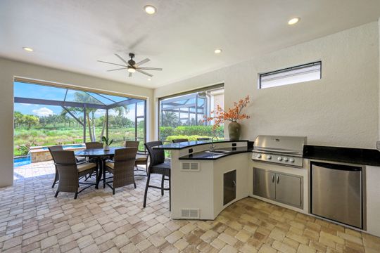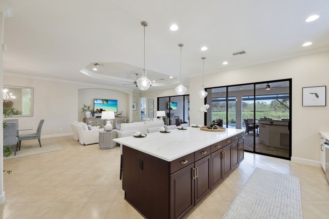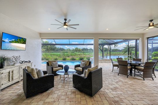 Situated at the end of the cul-de-sac & just steps away from the club, this "Palazzio" (3+Den/3BA) offers an open floorplan with generously sized rooms throughout. Two sets of sliding glass doors lead you to the extended covered lanai featuring a GAS heated pool/spa & outdoor kitchen all overlooking the lake & golf course. Other features include: new Calcutta Fantasy quartz countertops in the kitchen and baths; fresh exterior paint; electric roll down shutters; IMPACT WINDOWS/DOORS; plantation shutters throughout; diagonal tile floors & new luxury LVP flooring in the bedrooms/den; crown molding; closet built-ins; finished garage flooring; picture window screen cage; and more! GOLF MEMBERSHIP INCLUDED! Furniture/decor available. Esplanade is a true "Lifestyle Community" with something for everyone: Resort Pool complete with cabanas; 6 tennis courts; 4 bocce balls courts; 4 pickleball courts; Koquina Day Spa offering hair, nail, facial, and spa treatments; Techno Gym with Aerobics Room; 2 Dog Parks; Poolside Bahama Bar; 14 miles of bike/walking trails; 18 hole private golf course (Can use your own cart); 15,000 Sq Ft Culinary Center featuring restaurant, bars, wine tasting room, wine lockers, & Starbucks style cafe! Total dues just $2,932/qtr including lawn care, club, & GOLF!