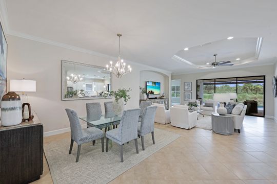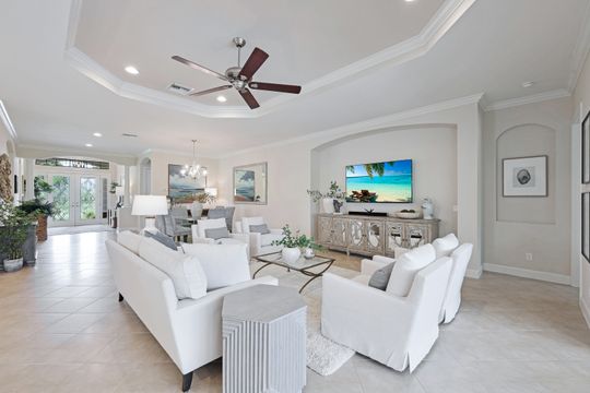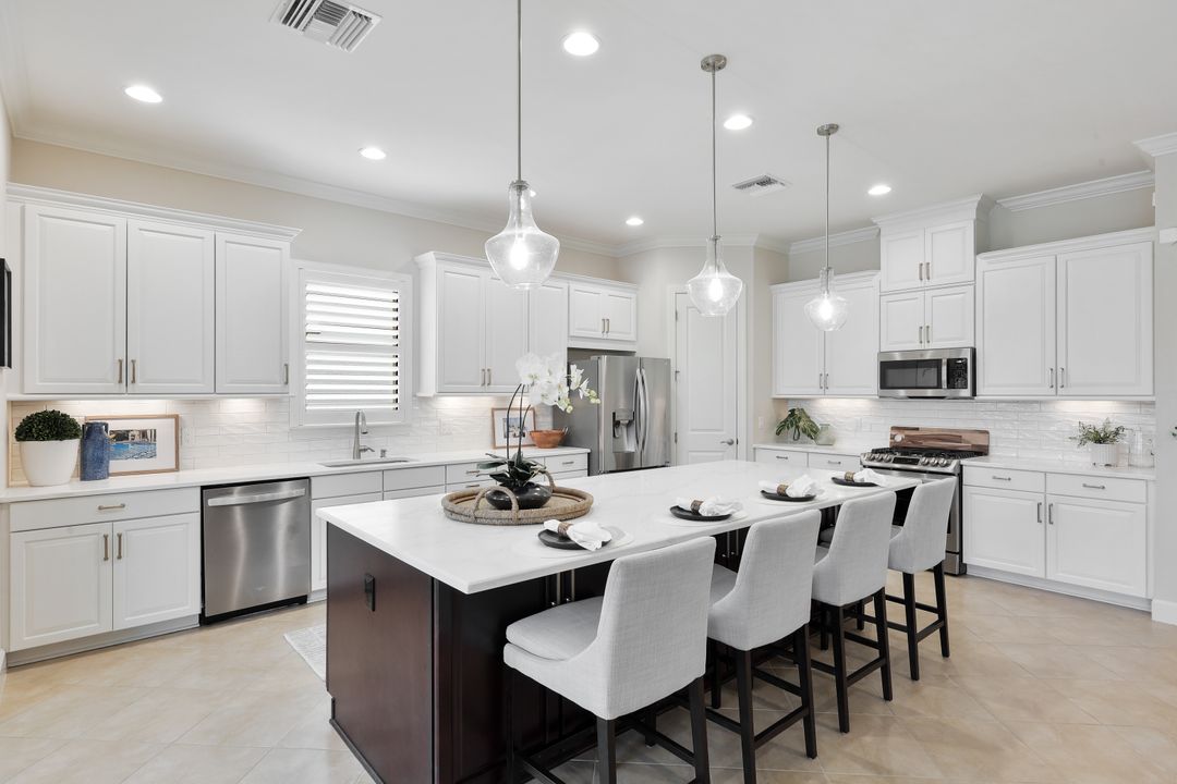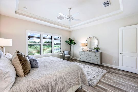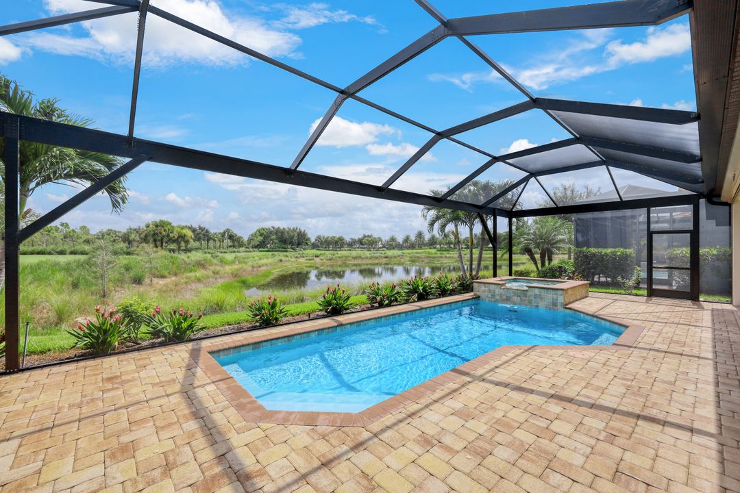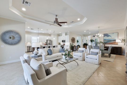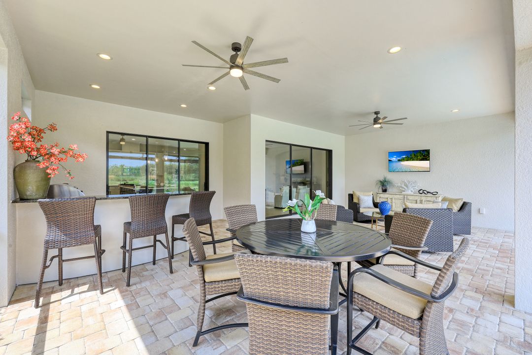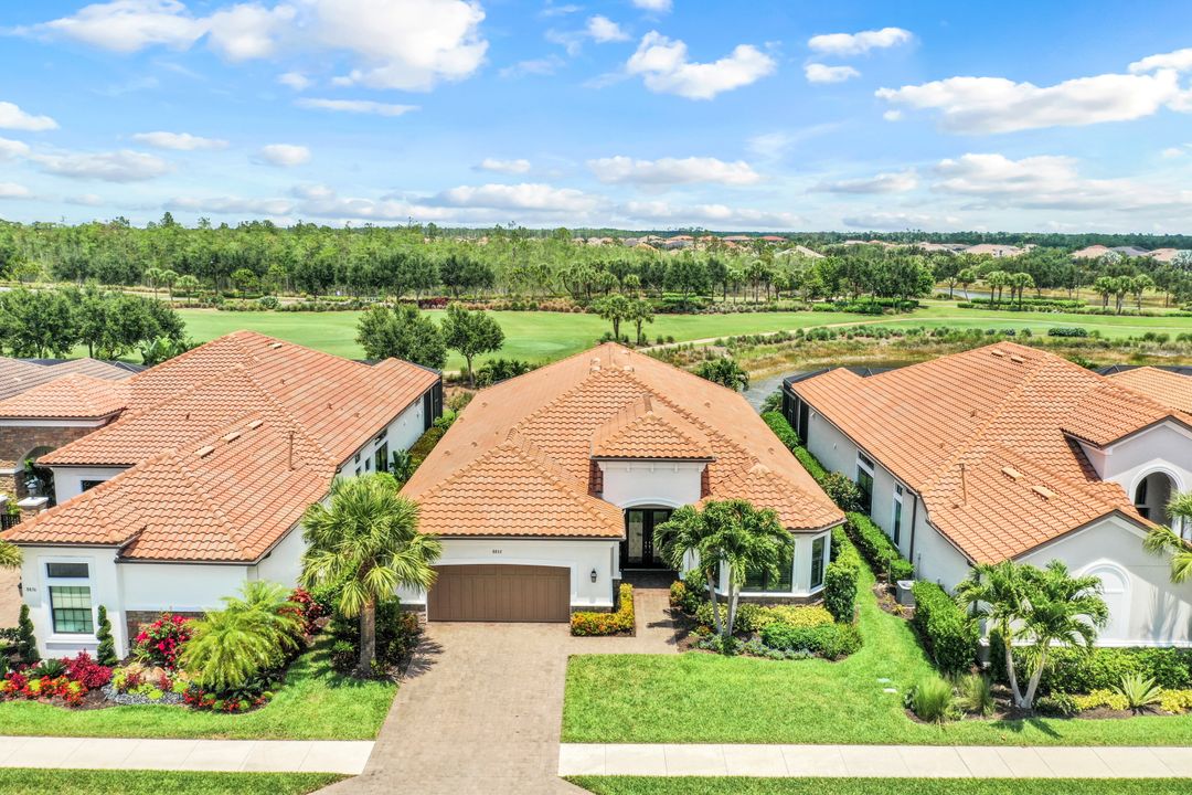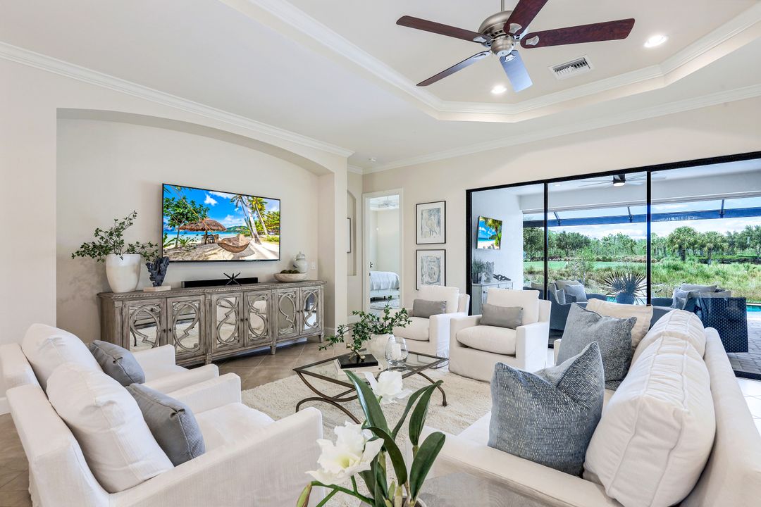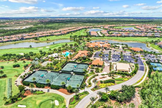 Situated at the end of the cul-de-sac & just steps away from the club, this "Palazzio" (3+Den/3BA) offers an open floorplan with generously sized rooms throughout. Two sets of sliding glass doors lead you to the extended covered lanai featuring a GAS heated pool/spa & outdoor kitchen all overlooking the lake & golf course. Other features include: new Calcutta Fantasy quartz countertops in the kitchen and baths; fresh exterior paint; electric roll down shutters; IMPACT WINDOWS/DOORS; plantation shutters throughout; diagonal tile floors & new luxury LVP flooring in the bedrooms/den; crown molding; closet built-ins; finished garage flooring; picture window screen cage; and more! GOLF MEMBERSHIP INCLUDED! Furniture/decor available. Esplanade is a true "Lifestyle Community" with something for everyone: Resort Pool complete with cabanas; 6 tennis courts; 4 bocce balls courts; 4 pickleball courts; Koquina Day Spa offering hair, nail, facial, and spa treatments; Techno Gym with Aerobics Room; 2 Dog Parks; Poolside Bahama Bar; 14 miles of bike/walking trails; 18 hole private golf course (Can use your own cart); 15,000 Sq Ft Culinary Center featuring restaurant, bars, wine tasting room, wine lockers, & Starbucks style cafe! Total dues just $2,932/qtr including lawn care, club, & GOLF!