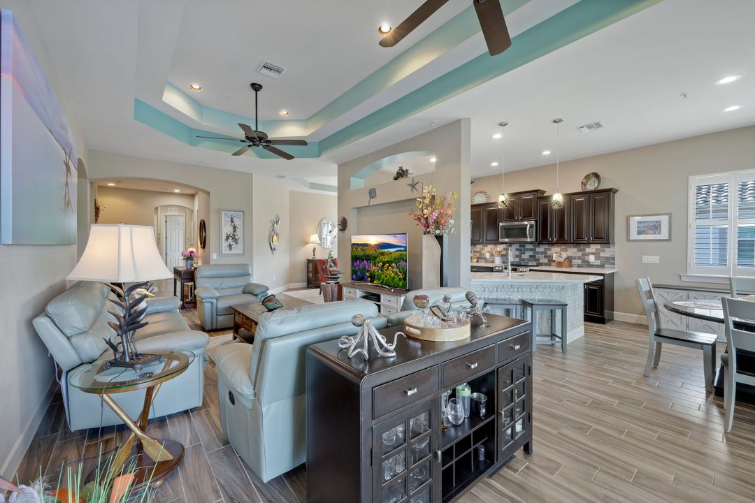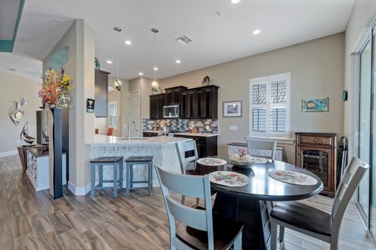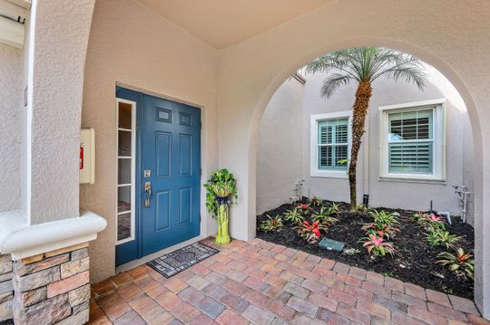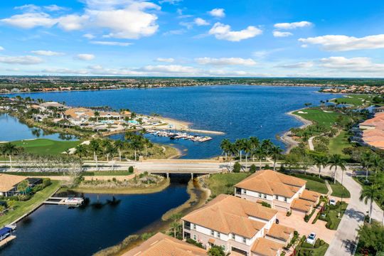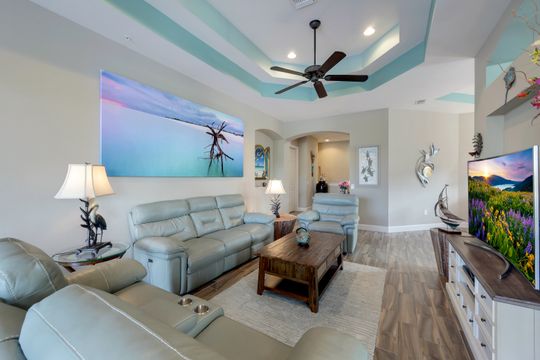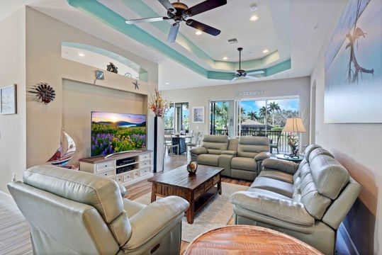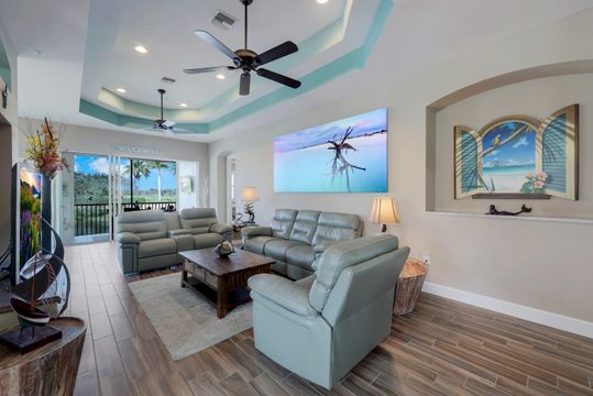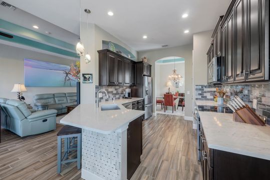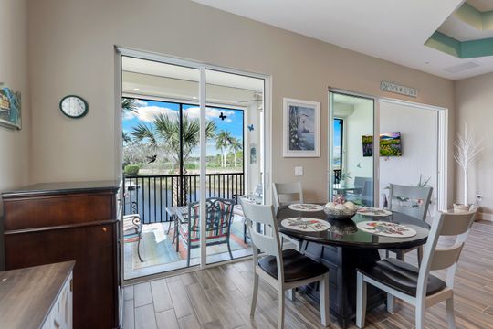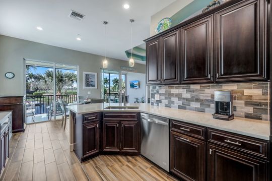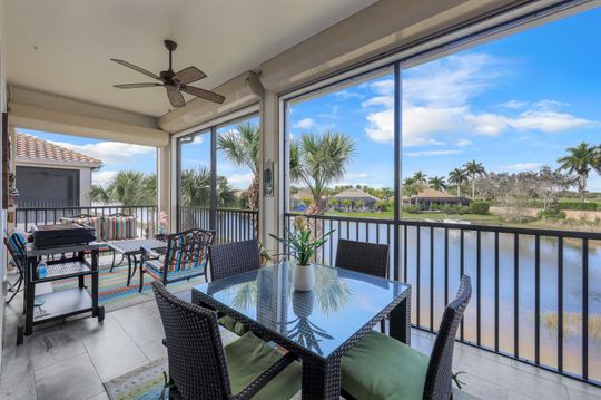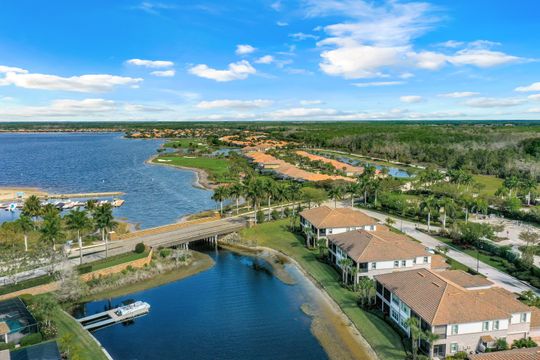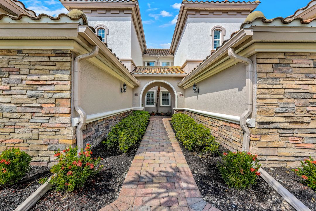ENJOY STUNNING SUNSETS, GOLF AND LAKE VIEWS FROM THIS PRISTINE COACH HOME! LIVE A VACATION LIFESTYLE IN A COUNTRY CLUB SETTING! This 2nd floor WESTERN EXPOSURE Coach Home is conveniently located within walking distance to the Beach Club and features 3 Bedrooms plus a Den/Home Office, 2.5 Baths and a 2 Car Garage. The updated kitchen is light and bright and has Quartz Countertops, Glass Backsplash, Espresso Cabinets and Stainless Steel Appliances. Fine Appointments/Special Features include, Plantation Shutters throughout, Wood Plank Tile in Great Room, Owners Suite, Den and Lanai plus more! For peace of mind during inclement weather, the whole house is protected with Electric Shutters on the back and Accordion Shutters on the sides. The Quarry is an amenity-rich gated lakefront community offering over 500 acres of lakes for boating, water skiing, paddle boarding, jet skiing, kayaking, and fishing. The NEWLY expanded resort style Beach Club includes Tennis, Pickleball, Bocce Ball, a Tiki Bar, Restaurant, Pool-Side food/drink service, a Wellness Center, and a full-time activities director. The Golf Lodge offers an 18 hole PGA Level Hurdzan-Frye Golf Course. GOLF (OPTIONAL)