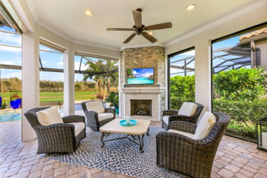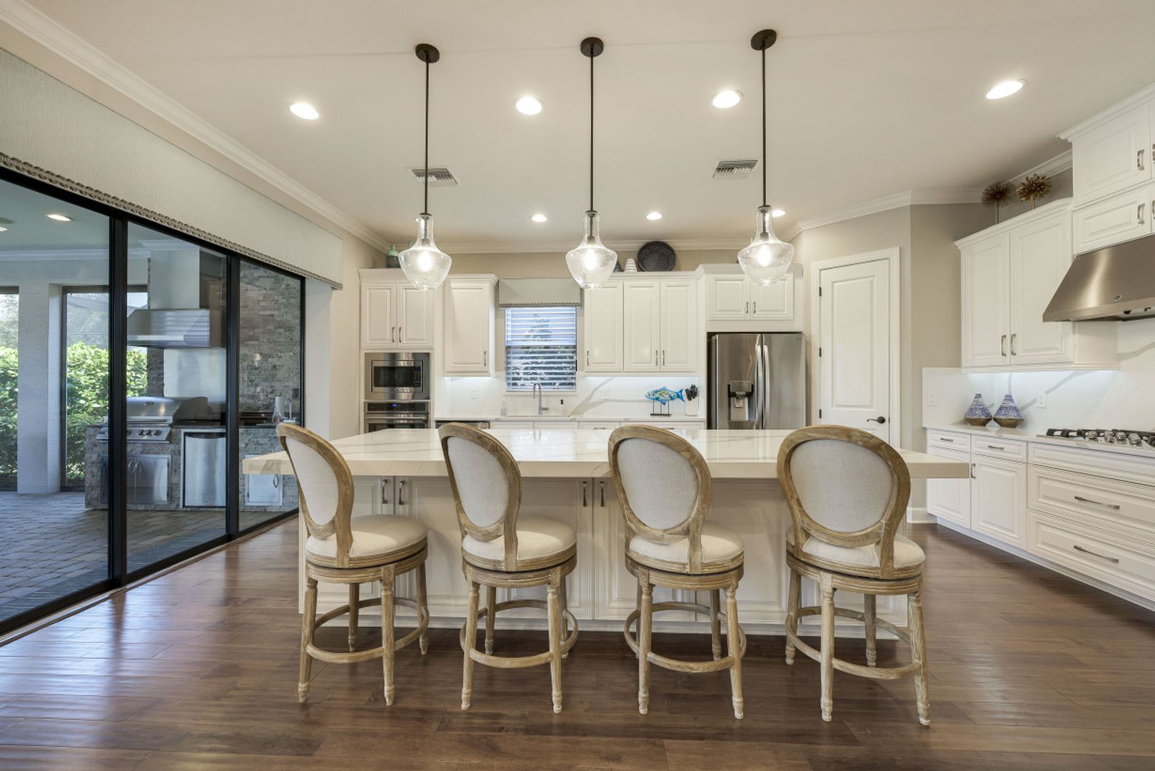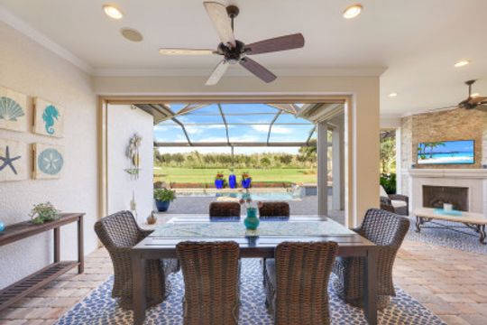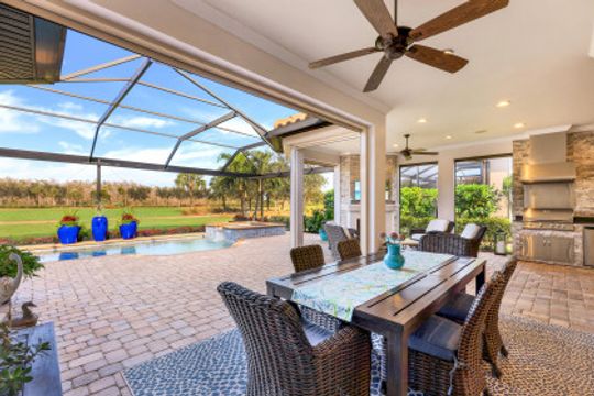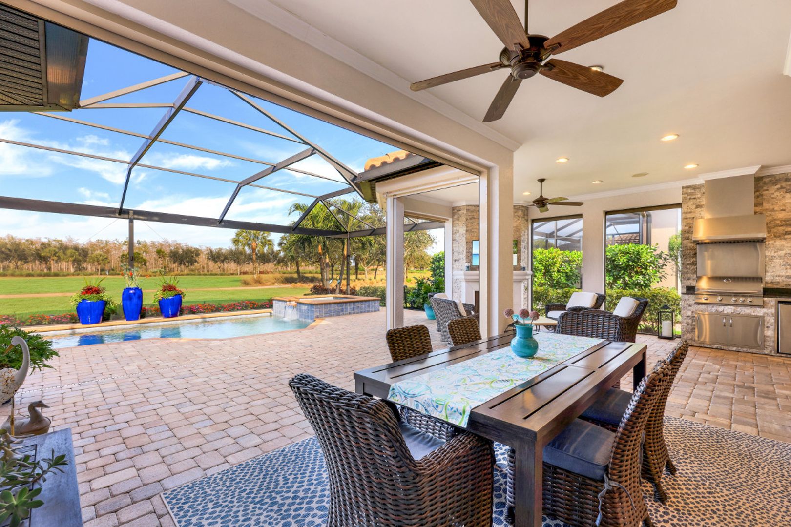 LIVE A VACATION LIFESTYLE IN ESPLANADE! Step inside this FULL GOLF MEMBERSHIP INCLUDED "Palazzio" and be greeted with an open great room style floorplan with two sets of pocket sliding glass doors to the extended lanai complete with outdoor kitchen, gas fireplace, electric roll down hurricane shutters, GAS heated pool/spa, and expansive golf course & preserve views with no roof tops in sight! A long list of special features include: solid engineered wood flooring; brand new sculpted carpets; double thick quartz countertops with full quartz backsplash; GAS range & wall oven; wine cooler; crown molding; designer trim & wallpaper accents; and more! Furniture/decor negotiable. Esplanade is a true "Lifestyle Community" with something for everyone: Resort Pool complete with cabanas and beach entrance; 6 tennis courts; 4 bocce balls courts; 4 pickleball courts; Koquina Day Spa offering hair, nail, facial, and spa treatments; Techno Gym with Aerobics Room; Gated Dog Park; Poolside Bahama Bar; 14 miles of bike/walking trails; 18 hole private golf course (Can use your own cart); 15,000 Sq Ft Culinary Center featuring restaurant, bars, wine tasting room, wine lockers, & Starbucks style cafe!