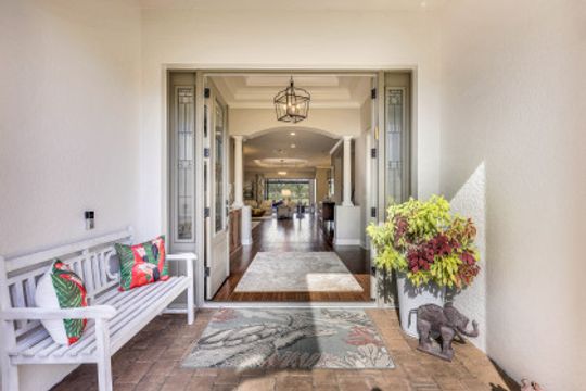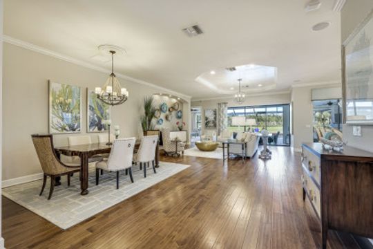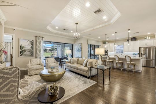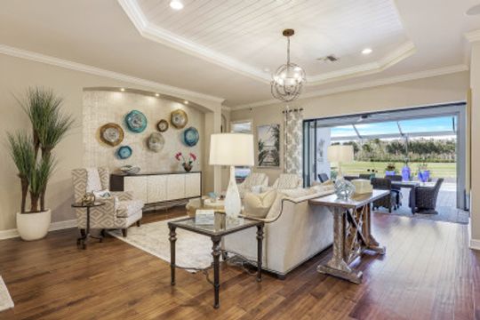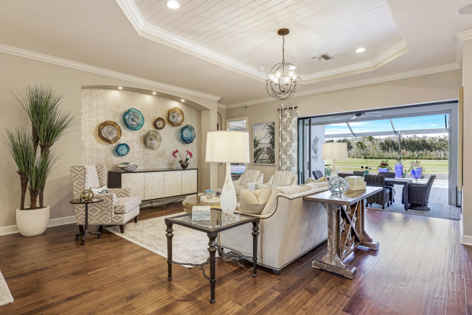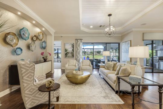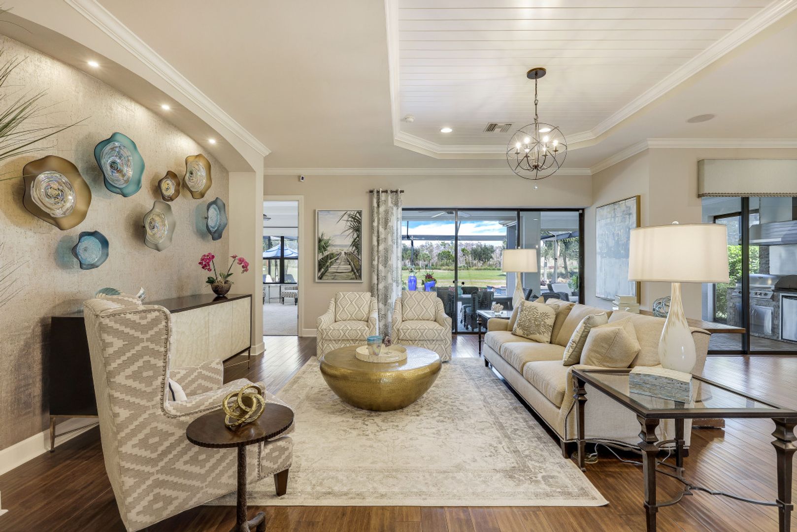 LIVE A VACATION LIFESTYLE IN ESPLANADE! Step inside this FULL GOLF MEMBERSHIP INCLUDED "Palazzio" and be greeted with an open great room style floorplan with two sets of pocket sliding glass doors to the extended lanai complete with outdoor kitchen, gas fireplace, electric roll down hurricane shutters, GAS heated pool/spa, and expansive golf course & preserve views with no roof tops in sight! A long list of special features include: solid engineered wood flooring; brand new sculpted carpets; double thick quartz countertops with full quartz backsplash; GAS range & wall oven; wine cooler; crown molding; designer trim & wallpaper accents; and more! Furniture/decor negotiable. Esplanade is a true "Lifestyle Community" with something for everyone: Resort Pool complete with cabanas and beach entrance; 6 tennis courts; 4 bocce balls courts; 4 pickleball courts; Koquina Day Spa offering hair, nail, facial, and spa treatments; Techno Gym with Aerobics Room; Gated Dog Park; Poolside Bahama Bar; 14 miles of bike/walking trails; 18 hole private golf course (Can use your own cart); 15,000 Sq Ft Culinary Center featuring restaurant, bars, wine tasting room, wine lockers, & Starbucks style cafe!