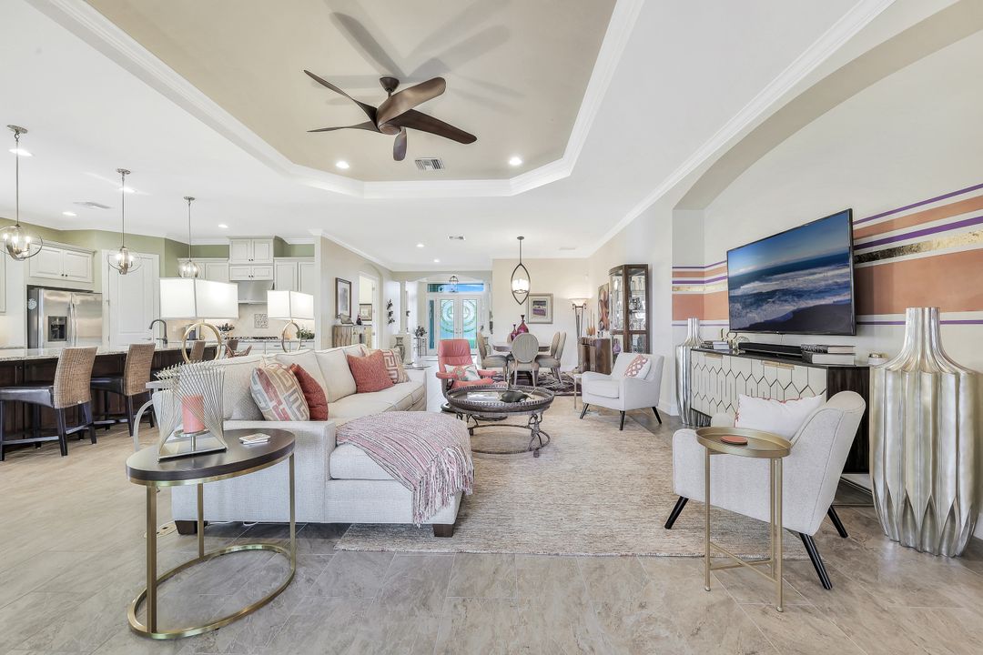 IT'S ALL ABOUT THE VIEW! FULL GOLF MEMBERSHIP INCLUDED! This spacious "Palazzio" (3+Den/3BA) offers expansive east facing lake & golf course views and is just steps away from the club! From the moment you walk in the door you are greeted with an open great room style floorplan with generously sized rooms and two sliding glass doors to the extended lanai with outdoor kitchen, & GAS heated pool/spa with picture window screen cage. A long list of special features include: HURRICANE IMPACT WINDOWS/DOORS; ELECTRIC ROLL DOWN SHUTTERS on the lanai; extended kitchen with GAS Cooktop, wall oven, two sinks, & beverage cooler; 12x24' tile floors; new LVP in the master bedroom; master closet cabinets; plantation shutters throughout; and more! Esplanade is a true "Lifestyle Community" with something for everyone: resort pool complete with cabanas & poolside "Bahama Bar"; tennis; pickleball; bocce; Koquina Day Spa; fitness center; dog parks; 14 miles of bike/walking trails; 18 hole private golf course; 15,000 Sq Ft clubhouse featuring restaurant, bar, wine tasting room, wine lockers, & Starbucks style cafe! TOTAL HOA fees just $1,042/month & includes landscaping, ALL club amenities, & golf dues.