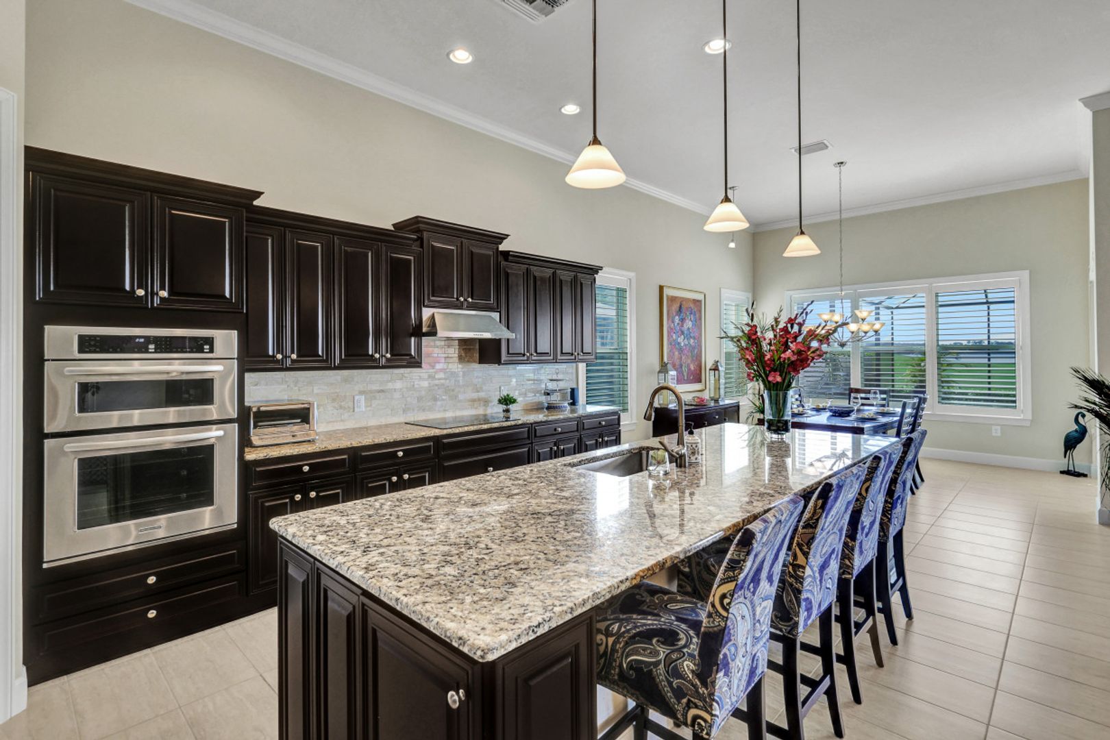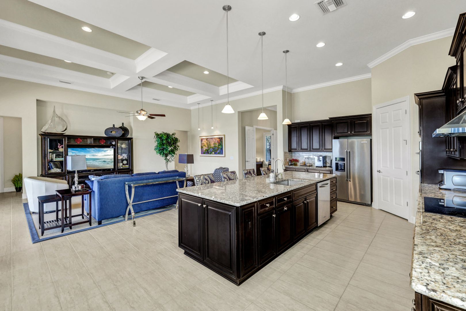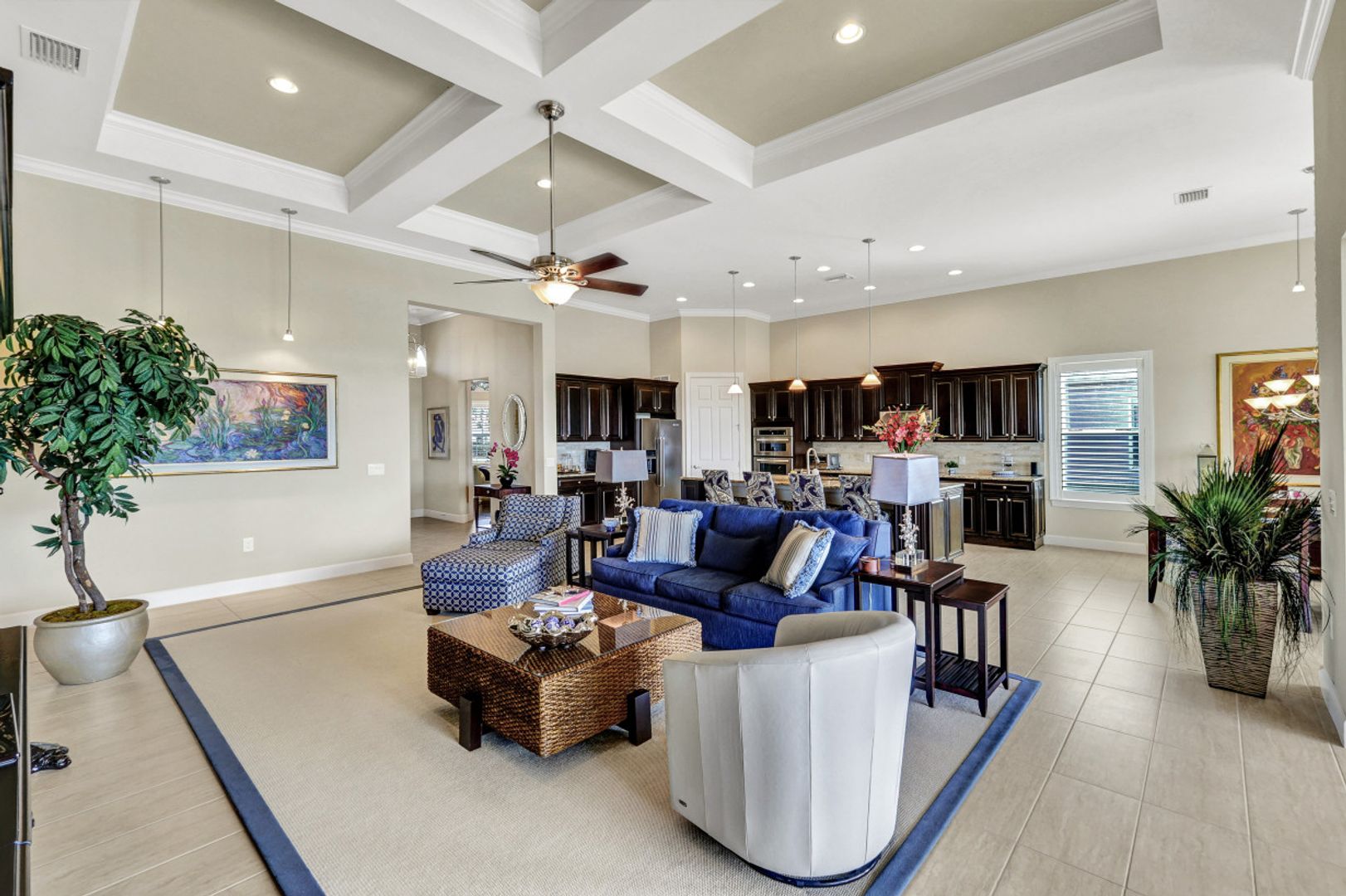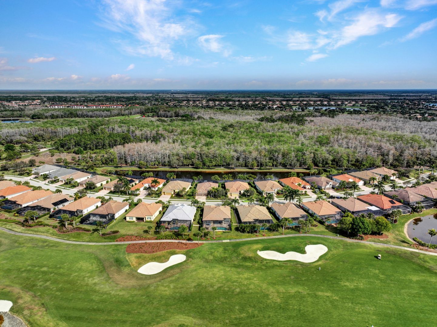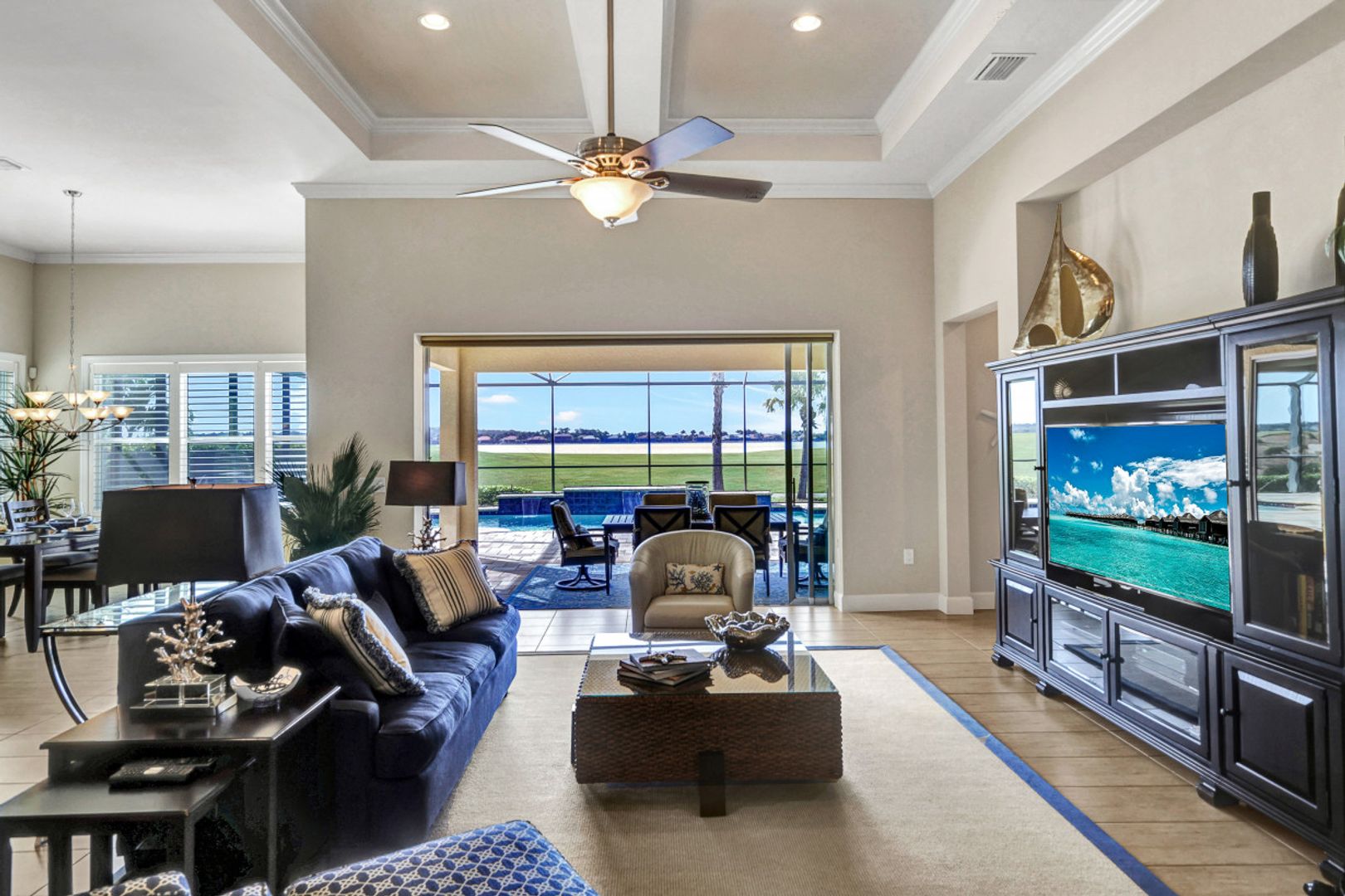 ENJOY THE STUNNING NAPLES SUNSETS OVER STONE LAKE! GORGEOUS GOLF AND WATER VIEWS! From the moment you walk into this beautiful residence you will be greeted by the soaring coffered ceilings in the great room to the sweeping lake and golf course views of the 3rd fairway. This popular Dartmouth Model boasts 3 generous corner bedrooms, 3 full bathrooms including 2 en-suites, a den/office, and a full 3 Car garage. The Open Floor plan is perfect for entertaining family and friends indoors and out with expansive sliding glass doors and a private pool. The spacious kitchen is a chef's delight featuring granite countertops, espresso cabinets with pull out shelves, oversized island, and upgraded stainless-steel appliances. Fine appointments/Special features include porcelain tile floors in the main living area, and hardwood floors in all bedrooms and den, 8 foot doors, crown moldings, 7 inch baseboards, plantation shutters, plus more!