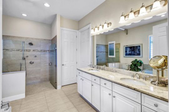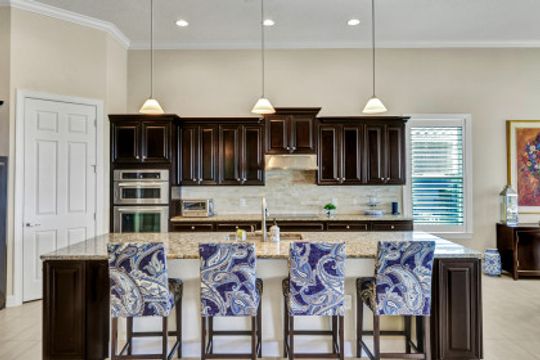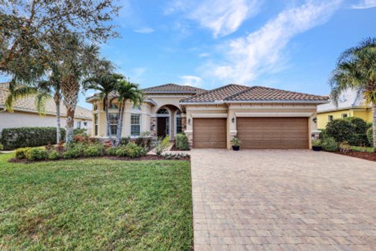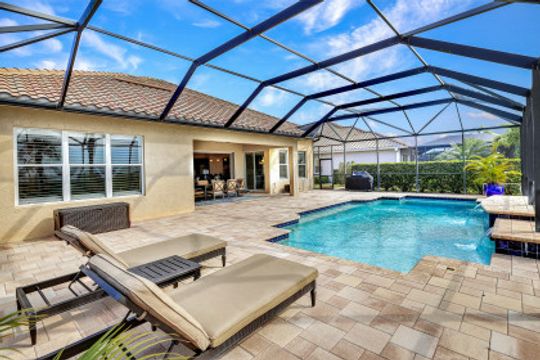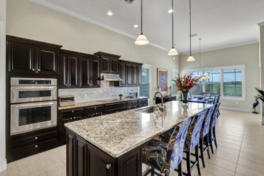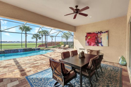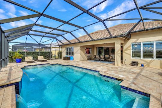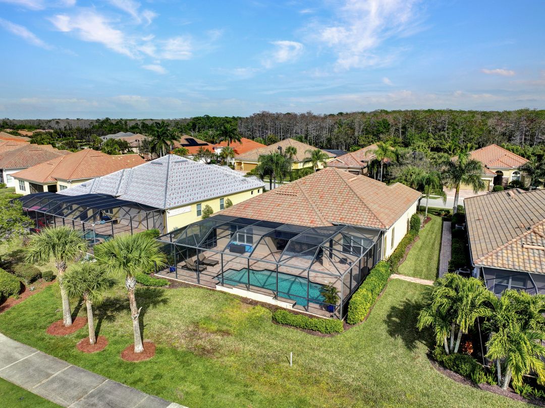 ENJOY THE STUNNING NAPLES SUNSETS OVER STONE LAKE! GORGEOUS GOLF AND WATER VIEWS! From the moment you walk into this beautiful residence you will be greeted by the soaring coffered ceilings in the great room to the sweeping lake and golf course views of the 3rd fairway. This popular Dartmouth Model boasts 3 generous corner bedrooms, 3 full bathrooms including 2 en-suites, a den/office, and a full 3 Car garage. The Open Floor plan is perfect for entertaining family and friends indoors and out with expansive sliding glass doors and a private pool. The spacious kitchen is a chef's delight featuring granite countertops, espresso cabinets with pull out shelves, oversized island, and upgraded stainless-steel appliances. Fine appointments/Special features include porcelain tile floors in the main living area, and hardwood floors in all bedrooms and den, 8 foot doors, crown moldings, 7 inch baseboards, plantation shutters, plus more!