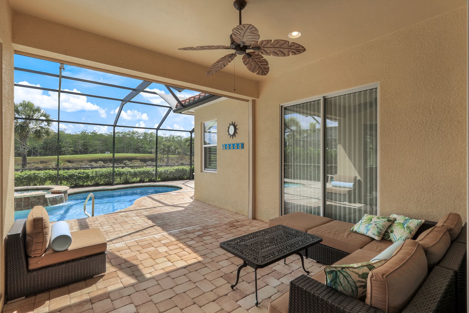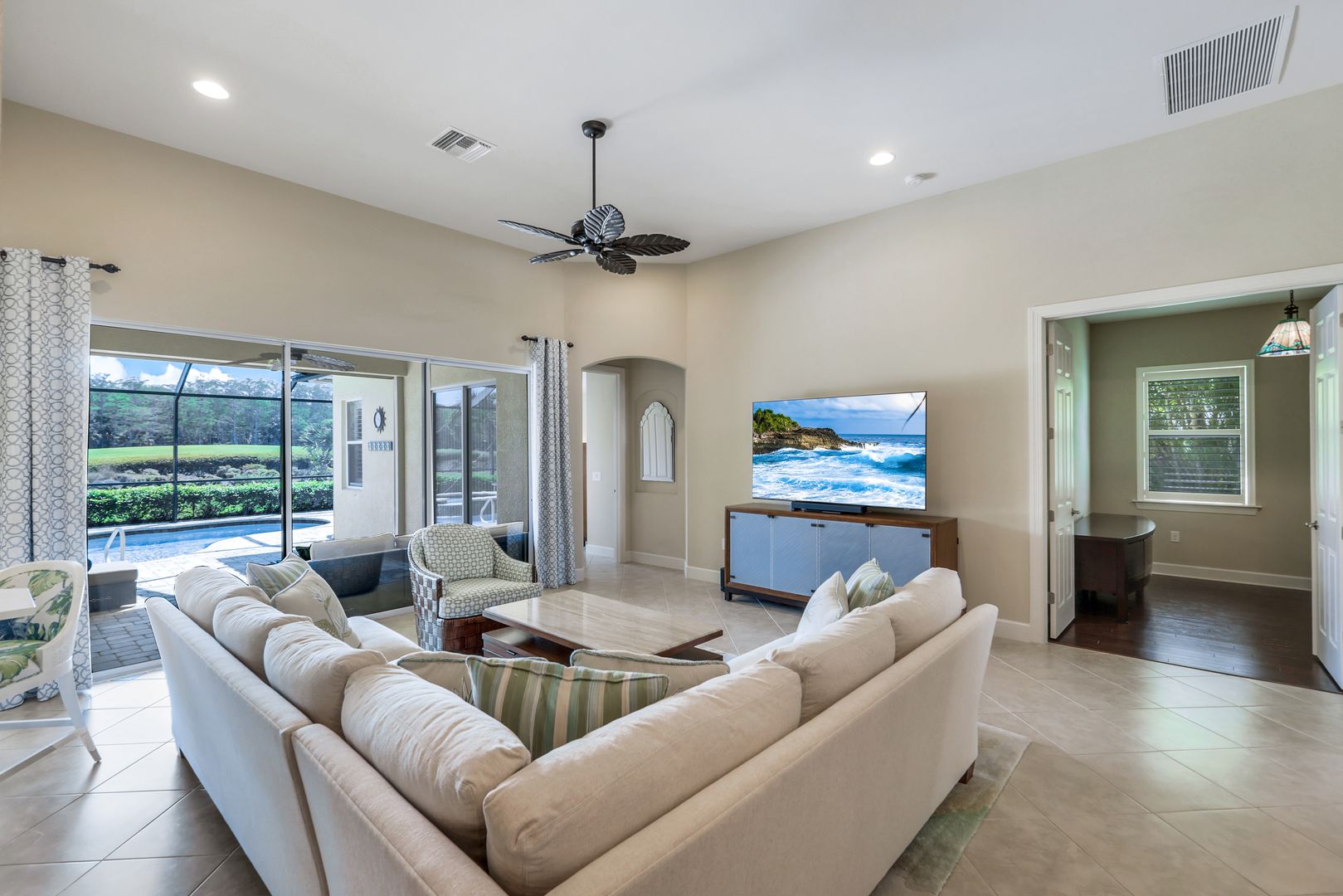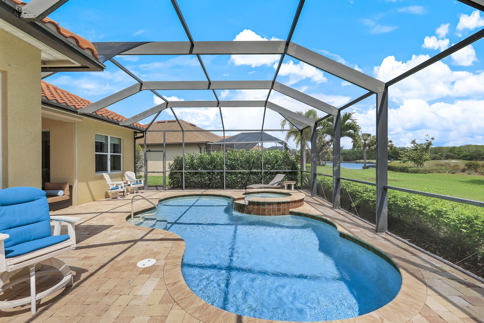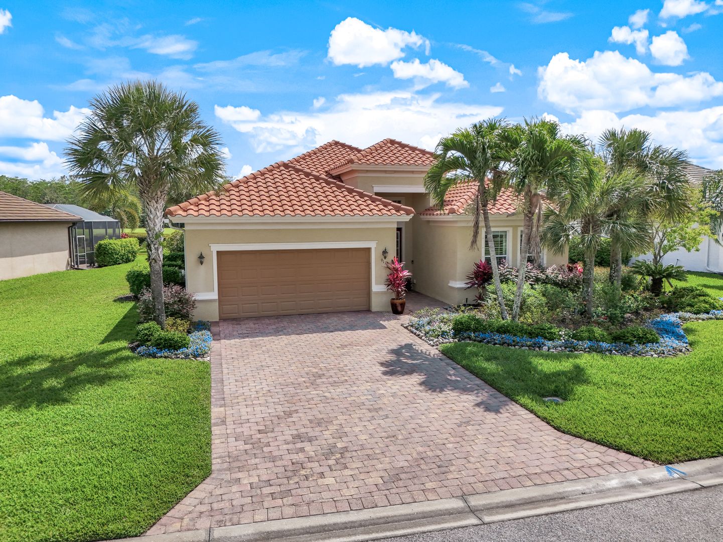 GORGEOUS, GOLF AND PRESERVE VIEWS! LIVE A VACATION LIFESTYLE IN AMENITY-RICH - THE QUARRY! This PRISTINE 2 bedroom, 2 bath plus den/home office or 3rd bedroom home sits on an oversized lot with stunning views of the 7th fairway and peaceful preserve. Fine appointments include an updated kitchen with quartz countertops, white cabinets, stainless steel appliances, plantation shutters, diagonal tile throughout with hardwood in the den, closet system in the main bedroom and an epoxy painted garage floor. The spacious lanai features a heated pool and spa and Storm Smart shutters. The Quarry is a an amenity rich gated lakefront community offering over 500 acres of lakes for boating, water skiing, paddle boarding, jet skiing, kayaking, and fishing.The NEWLY RENOVATED Beach Club includes Tennis, Pickleball, Bocce Ball, a Tiki Bar, Restaurant, Pool-Side food/drink service, a Wellness Center, and a full-time activities director.The Golf Lodge & Golf Club offers an 18 hole PGA Level Hurdzan-Frye Golf Course. GOLF (OPTIONAL)