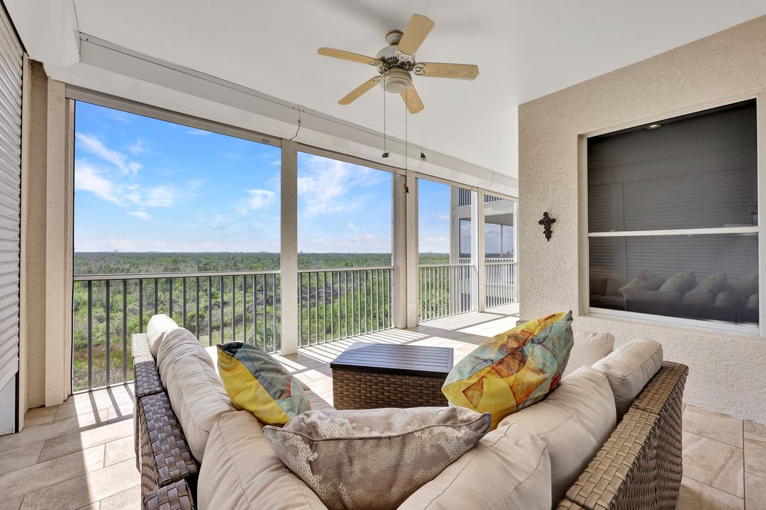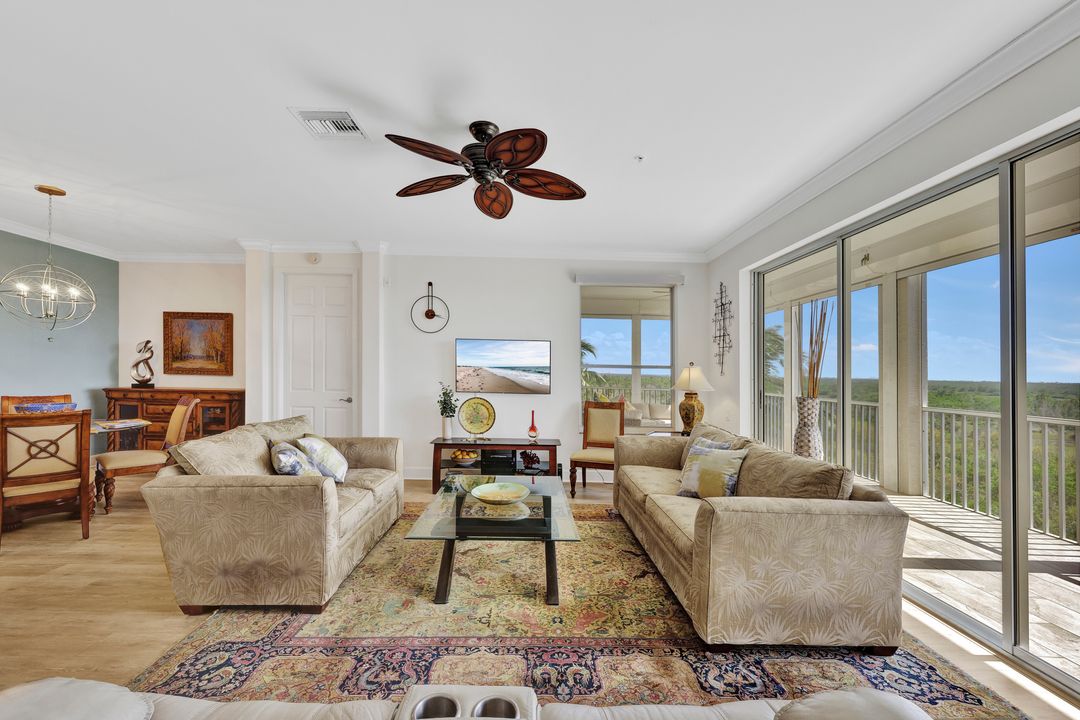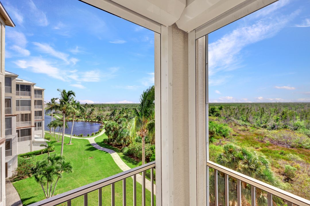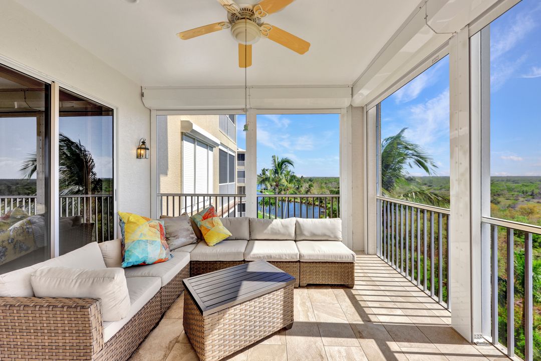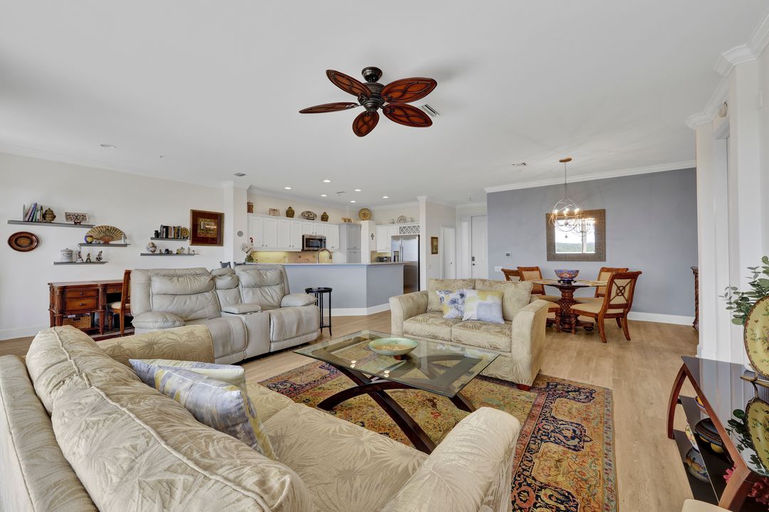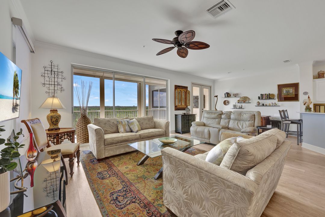 FULLY FURNISHED and ASSESSMENT PAID. As you step inside this 2/2, you will be greeted by the breathtaking views of the tropical nature preserve of Estero Bay and skyline from Fort Myers Beach to Bonita Springs. Large tiled lanai with no-see-um screens allows you to enjoy these surroundings. For your convenience and peace of mind, electric storm shutters are installed on the lanai and guest bedroom. Inside, luxury vinyl tile flooring flows seamlessly throughout the living, dining, kitchen, and laundry areas. The entire unit has been freshly painted and features crown molding that adds an elegant touch to every room. Brand New AC in 2023. The master bedroom boasts a spacious walk-in closet and an ensuite bathroom with a seamless glass shower with tiled enclosure, custom vanity storage and backlit mirrors. The second bedroom, with twin beds, also offers ample storage space with a generous closet. Kitchen features brand new SS appliances with quartz counter and custom cabinets, new faucet and instant hot water dispenser. Condo also has an underneath oversized garage and storage area. Pay as you Play Golf! Lexington Country Club has a range of amenities and is a 24-hr. gated community located within minutes of beaches, shopping and medical facilities.