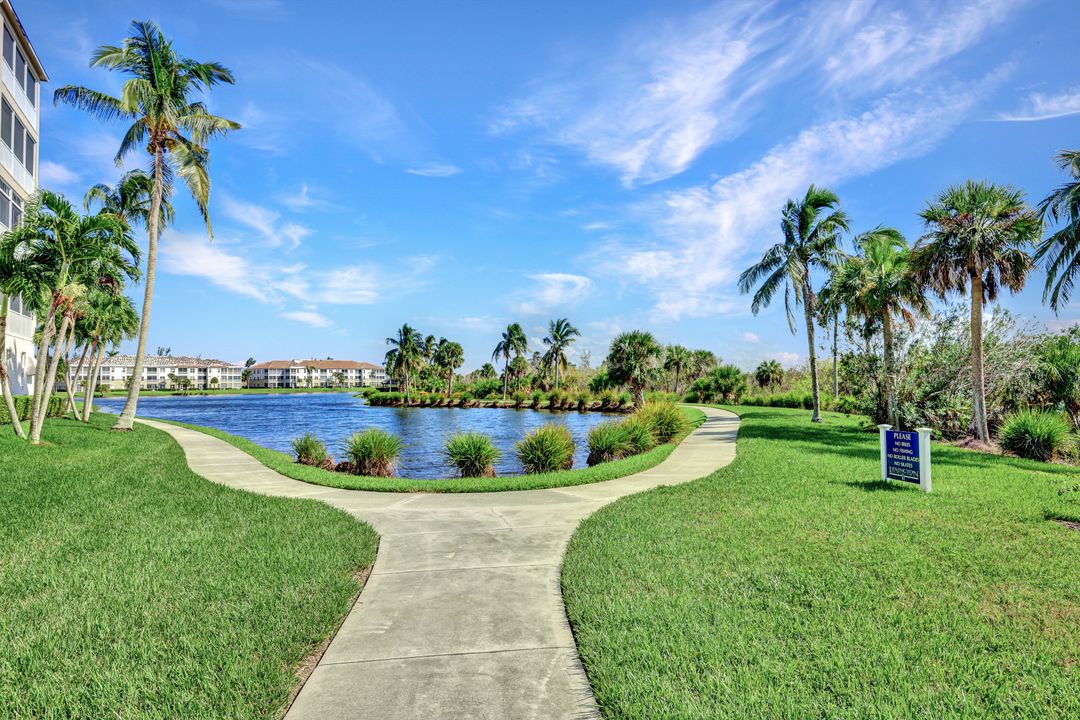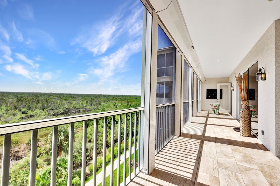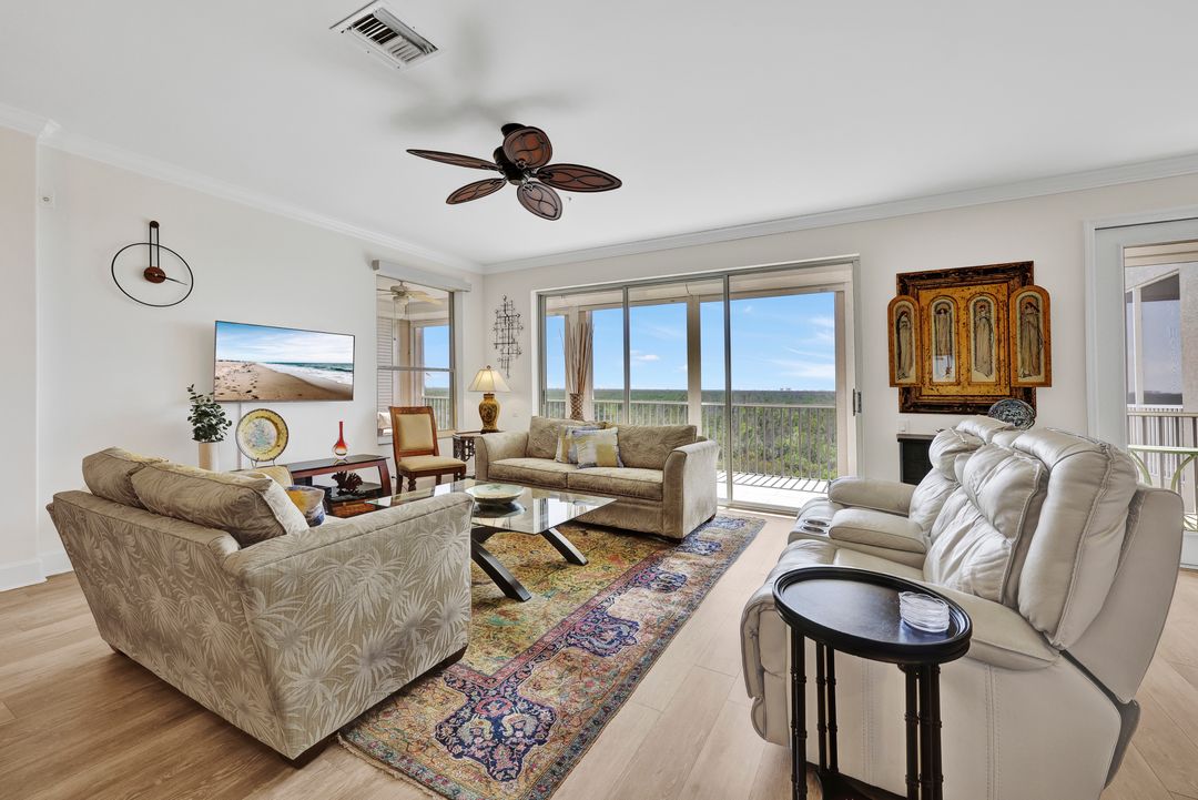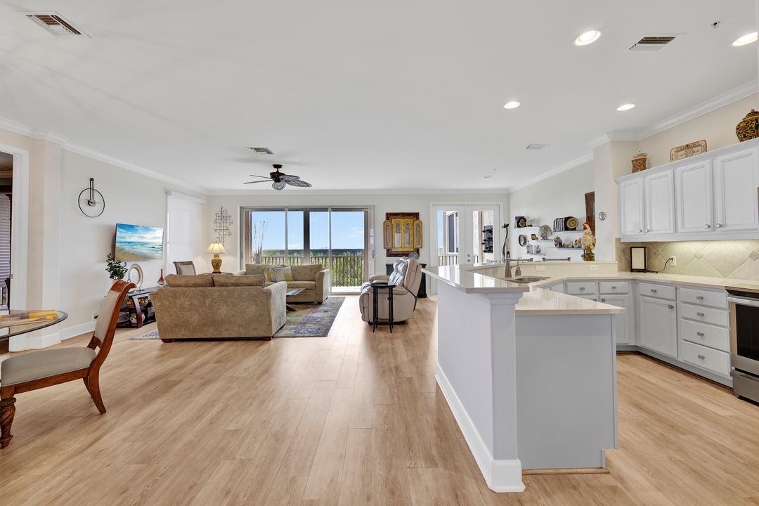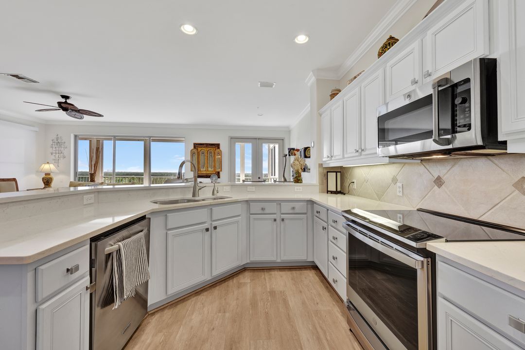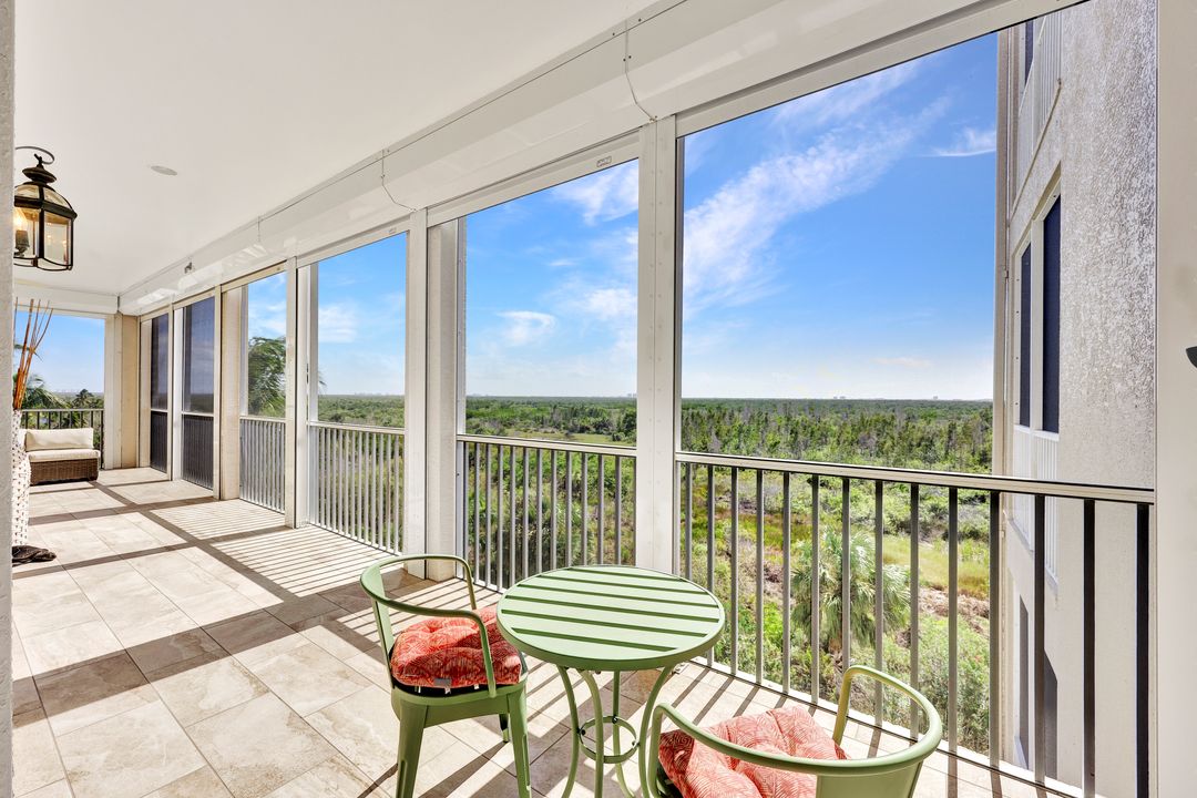 FULLY FURNISHED and ASSESSMENT PAID. As you step inside this 2/2, you will be greeted by the breathtaking views of the tropical nature preserve of Estero Bay and skyline from Fort Myers Beach to Bonita Springs. Large tiled lanai with no-see-um screens allows you to enjoy these surroundings. For your convenience and peace of mind, electric storm shutters are installed on the lanai and guest bedroom. Inside, luxury vinyl tile flooring flows seamlessly throughout the living, dining, kitchen, and laundry areas. The entire unit has been freshly painted and features crown molding that adds an elegant touch to every room. Brand New AC in 2023. The master bedroom boasts a spacious walk-in closet and an ensuite bathroom with a seamless glass shower with tiled enclosure, custom vanity storage and backlit mirrors. The second bedroom, with twin beds, also offers ample storage space with a generous closet. Kitchen features brand new SS appliances with quartz counter and custom cabinets, new faucet and instant hot water dispenser. Condo also has an underneath oversized garage and storage area. Pay as you Play Golf! Lexington Country Club has a range of amenities and is a 24-hr. gated community located within minutes of beaches, shopping and medical facilities.