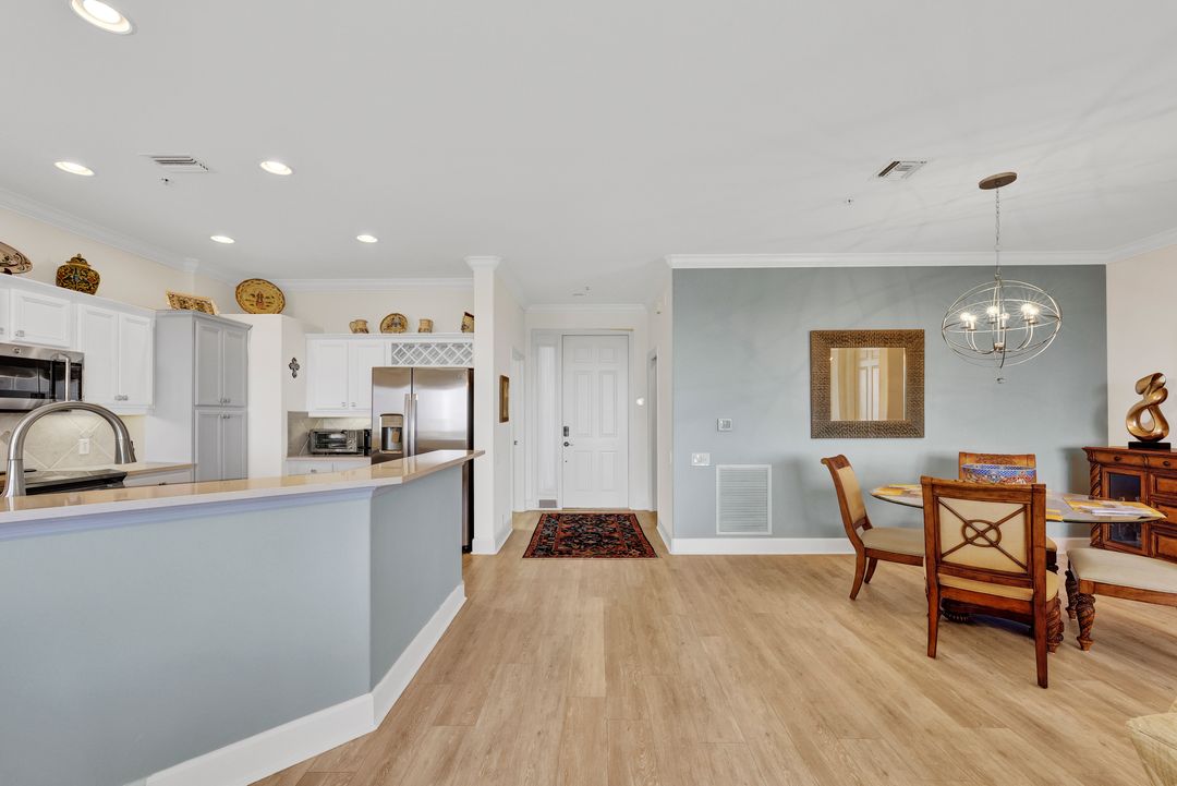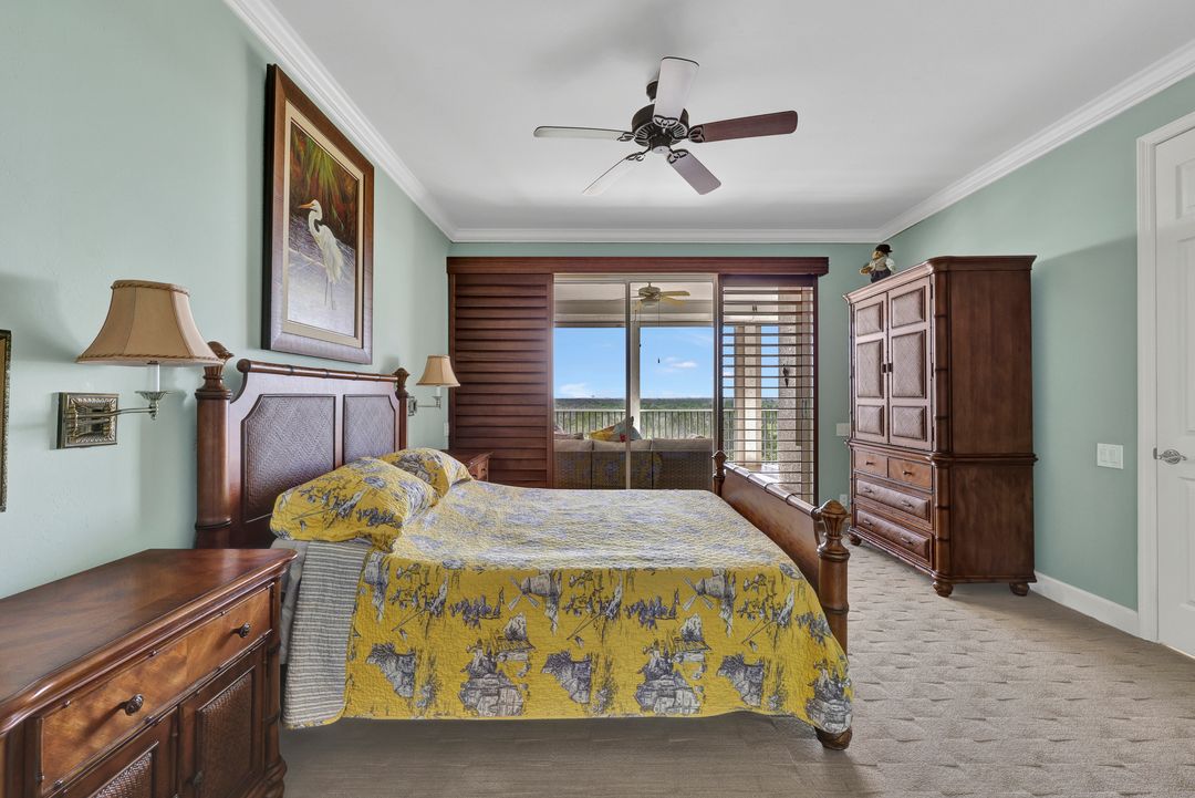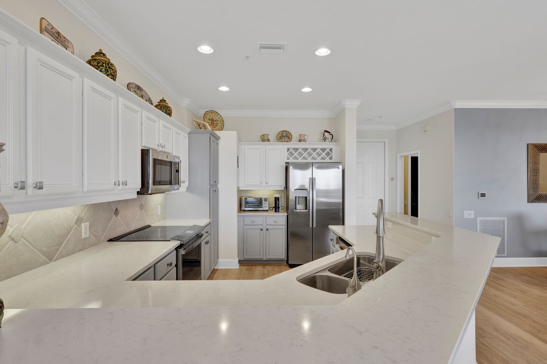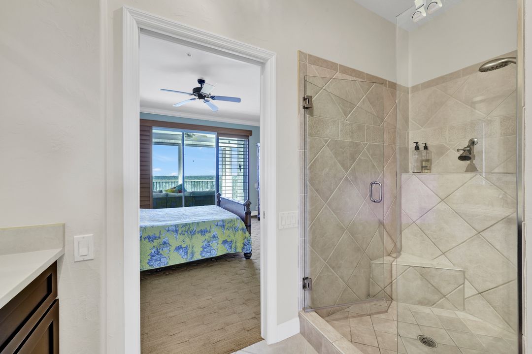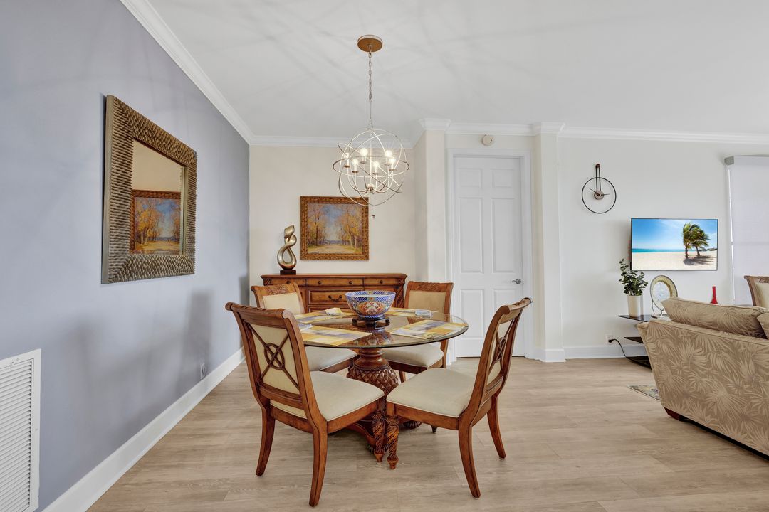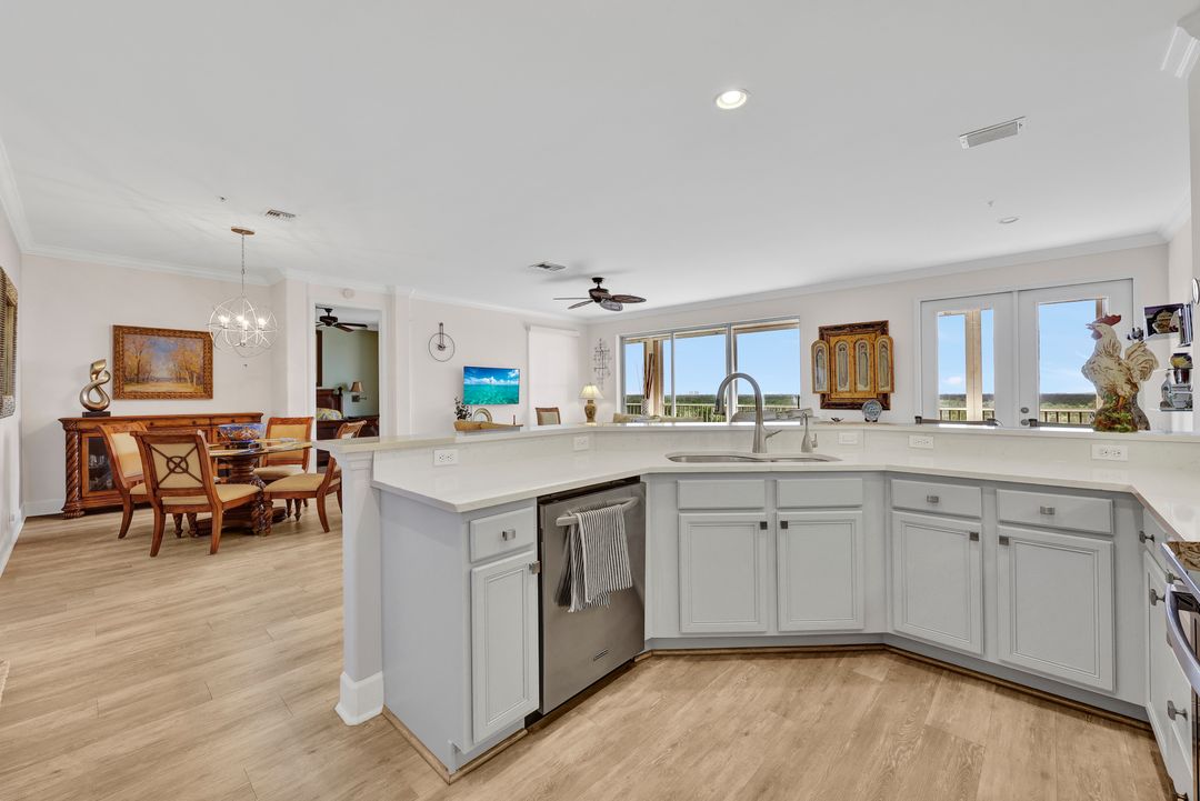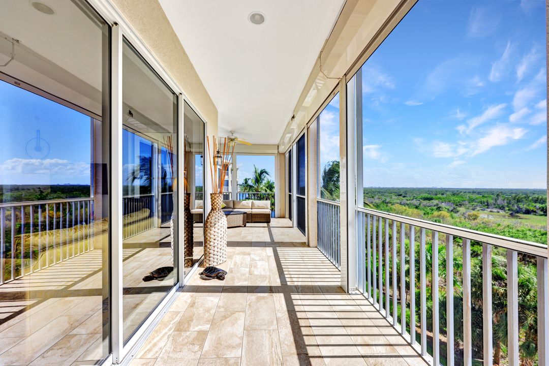 FULLY FURNISHED and ASSESSMENT PAID. As you step inside this 2/2, you will be greeted by the breathtaking views of the tropical nature preserve of Estero Bay and skyline from Fort Myers Beach to Bonita Springs. Large tiled lanai with no-see-um screens allows you to enjoy these surroundings. For your convenience and peace of mind, electric storm shutters are installed on the lanai and guest bedroom. Inside, luxury vinyl tile flooring flows seamlessly throughout the living, dining, kitchen, and laundry areas. The entire unit has been freshly painted and features crown molding that adds an elegant touch to every room. Brand New AC in 2023. The master bedroom boasts a spacious walk-in closet and an ensuite bathroom with a seamless glass shower with tiled enclosure, custom vanity storage and backlit mirrors. The second bedroom, with twin beds, also offers ample storage space with a generous closet. Kitchen features brand new SS appliances with quartz counter and custom cabinets, new faucet and instant hot water dispenser. Condo also has an underneath oversized garage and storage area. Pay as you Play Golf! Lexington Country Club has a range of amenities and is a 24-hr. gated community located within minutes of beaches, shopping and medical facilities.