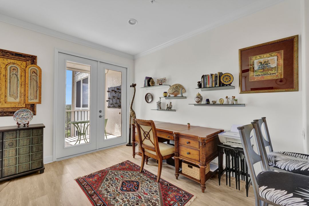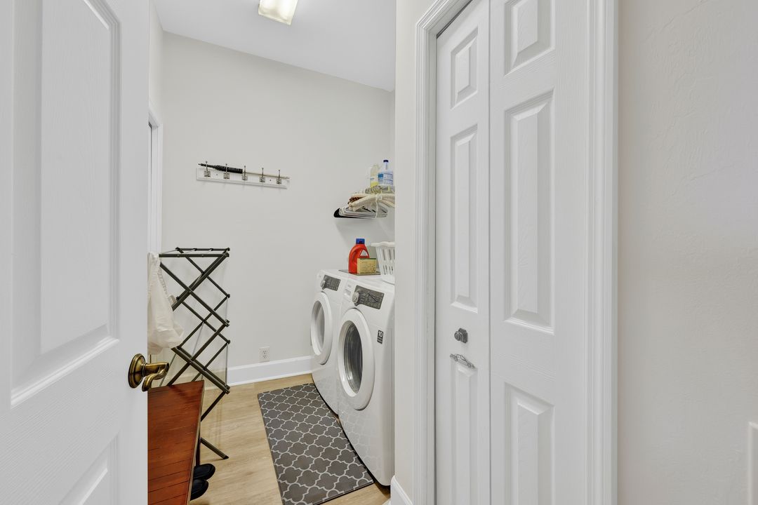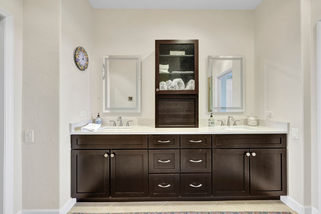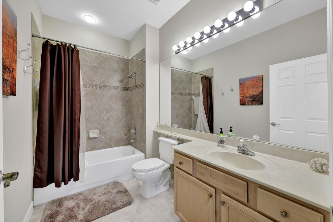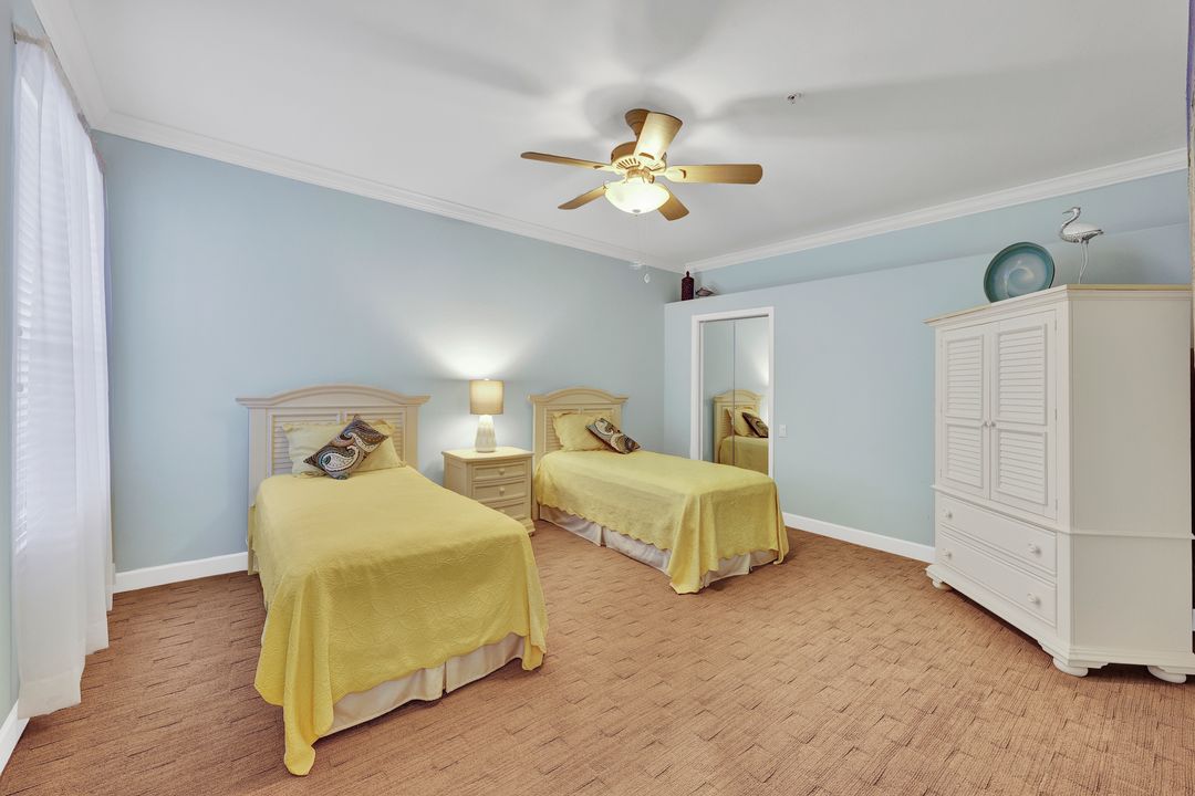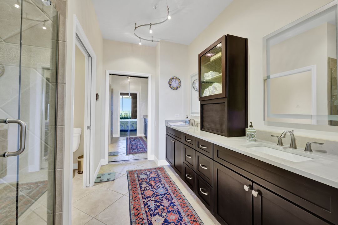 FULLY FURNISHED and ASSESSMENT PAID. As you step inside this 2/2, you will be greeted by the breathtaking views of the tropical nature preserve of Estero Bay and skyline from Fort Myers Beach to Bonita Springs. Large tiled lanai with no-see-um screens allows you to enjoy these surroundings. For your convenience and peace of mind, electric storm shutters are installed on the lanai and guest bedroom. Inside, luxury vinyl tile flooring flows seamlessly throughout the living, dining, kitchen, and laundry areas. The entire unit has been freshly painted and features crown molding that adds an elegant touch to every room. Brand New AC in 2023. The master bedroom boasts a spacious walk-in closet and an ensuite bathroom with a seamless glass shower with tiled enclosure, custom vanity storage and backlit mirrors. The second bedroom, with twin beds, also offers ample storage space with a generous closet. Kitchen features brand new SS appliances with quartz counter and custom cabinets, new faucet and instant hot water dispenser. Condo also has an underneath oversized garage and storage area. Pay as you Play Golf! Lexington Country Club has a range of amenities and is a 24-hr. gated community located within minutes of beaches, shopping and medical facilities.