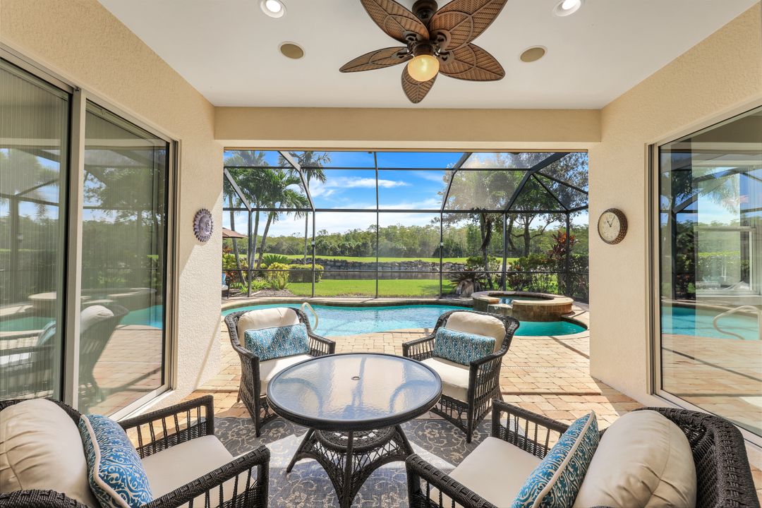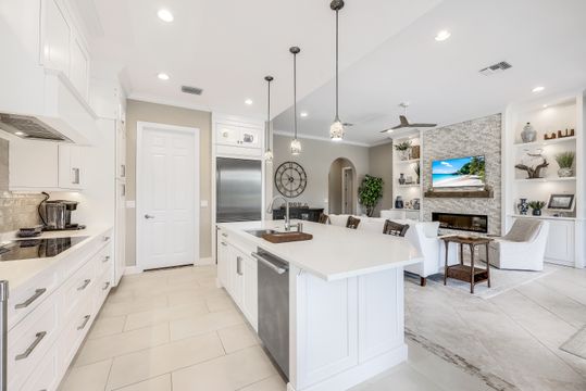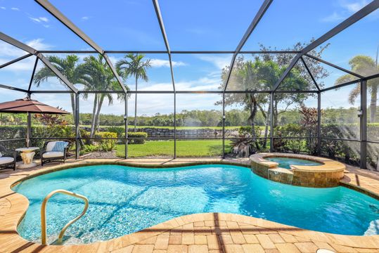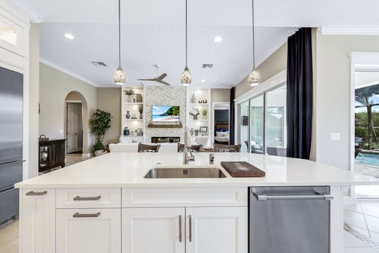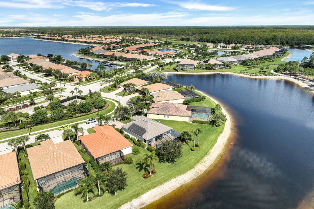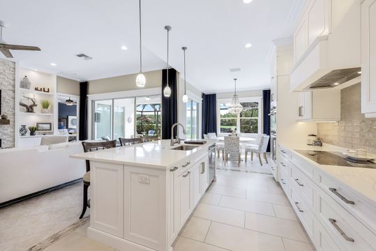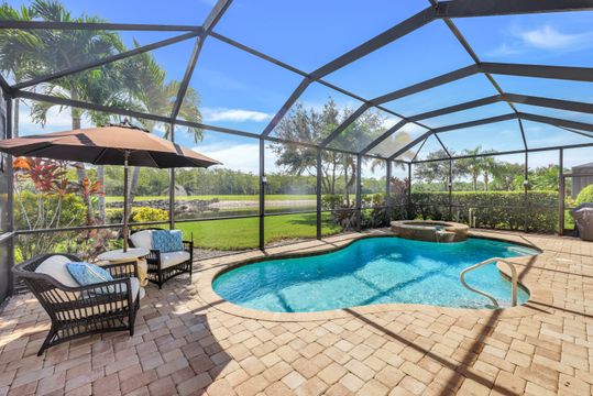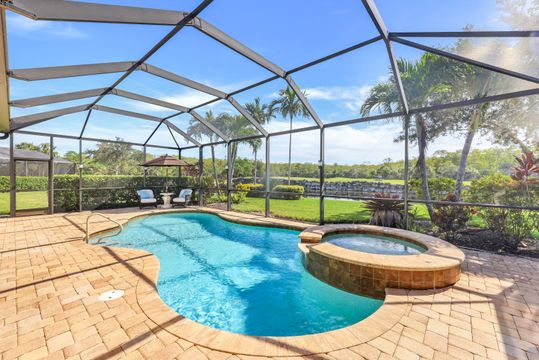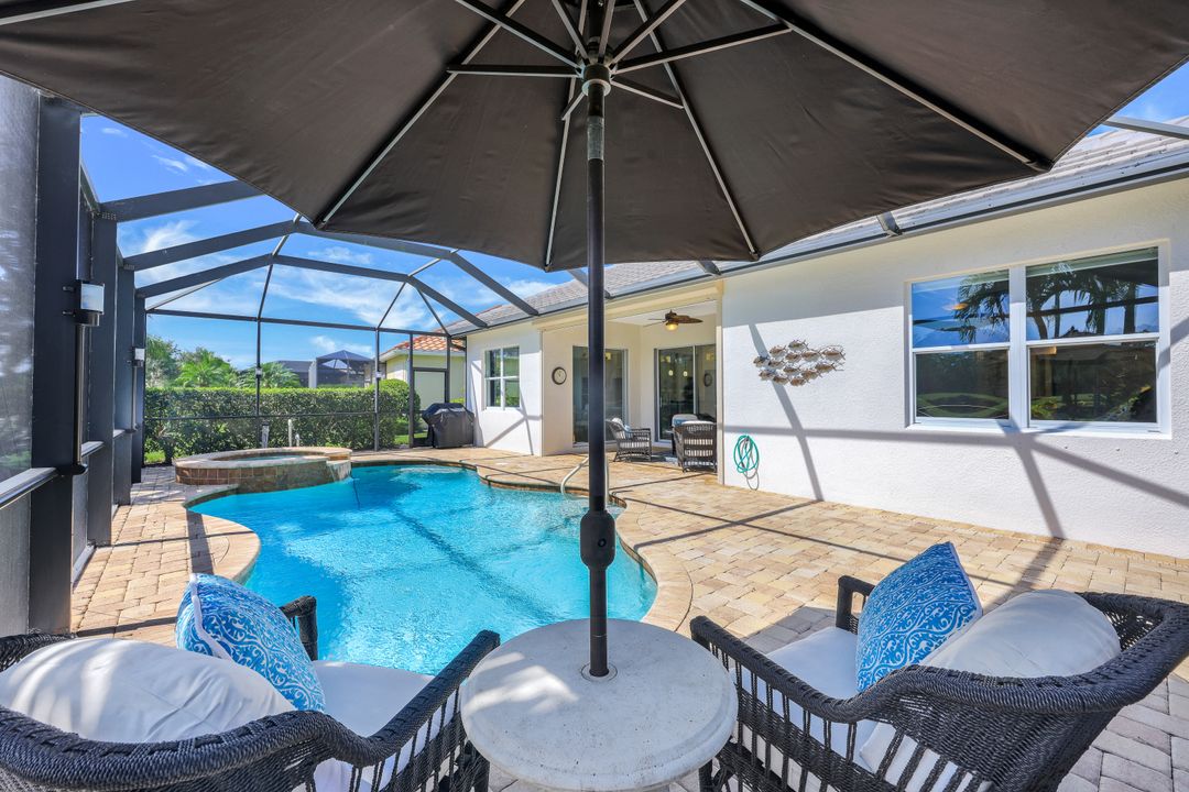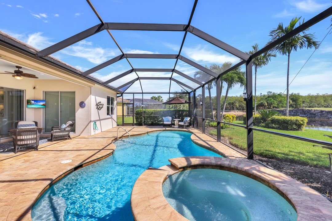 LIVE A VACATION LIFESTYLE IN THE QUARRY! This HIGH END 2+Den, 2 Bath home is situated on a spacious pie shaped lot with sunrise views overlooking the lake, rock wall, golf course, and preserve! A long list of features include: CUSTOM KITCHEN incl Thermador appliances (induction cooktop) & Sub Zero refrigerator; BRAND NEW ROOF; NEW Solar panels for pool heating; WHOLE HOUSE GENERATOR incl 500 buried tank; BRAND NEW AC; remodeled master bath w/ walk in shower; custom wall built in; fresh exterior paint; electric hurricane screen; and more! The Quarry is a lakefront community offering something for everyone: Boating, Golf, Tennis, Pickleball, Bocce Ball, Tiki Bar, Restaurant, Pool-Side Food/Drink Service, Gym, Social Activities, and more! The Quarry offers a lifestyle like no other including the BRAND NEW "Lake Lodge & Beach Club", over 500 acres of navigable lakes (boat slips available for lease), & a private 18 hole Golf Club (Not Mandatory). An impressive $18M renovation & expansion of the Lake Lodge & Beach Club is set to be completed by Dec 2023. HOA dues include access to ALL community amenities within The Quarry (with the exception of The Golf Lodge/Membership required).