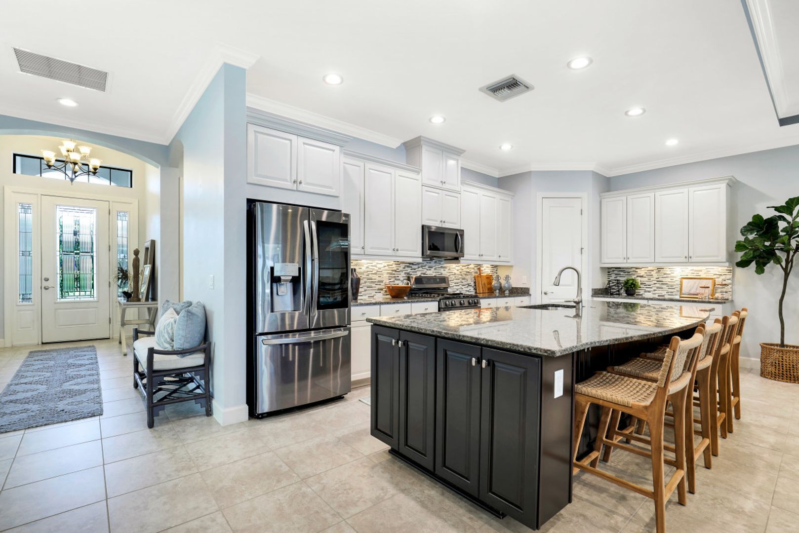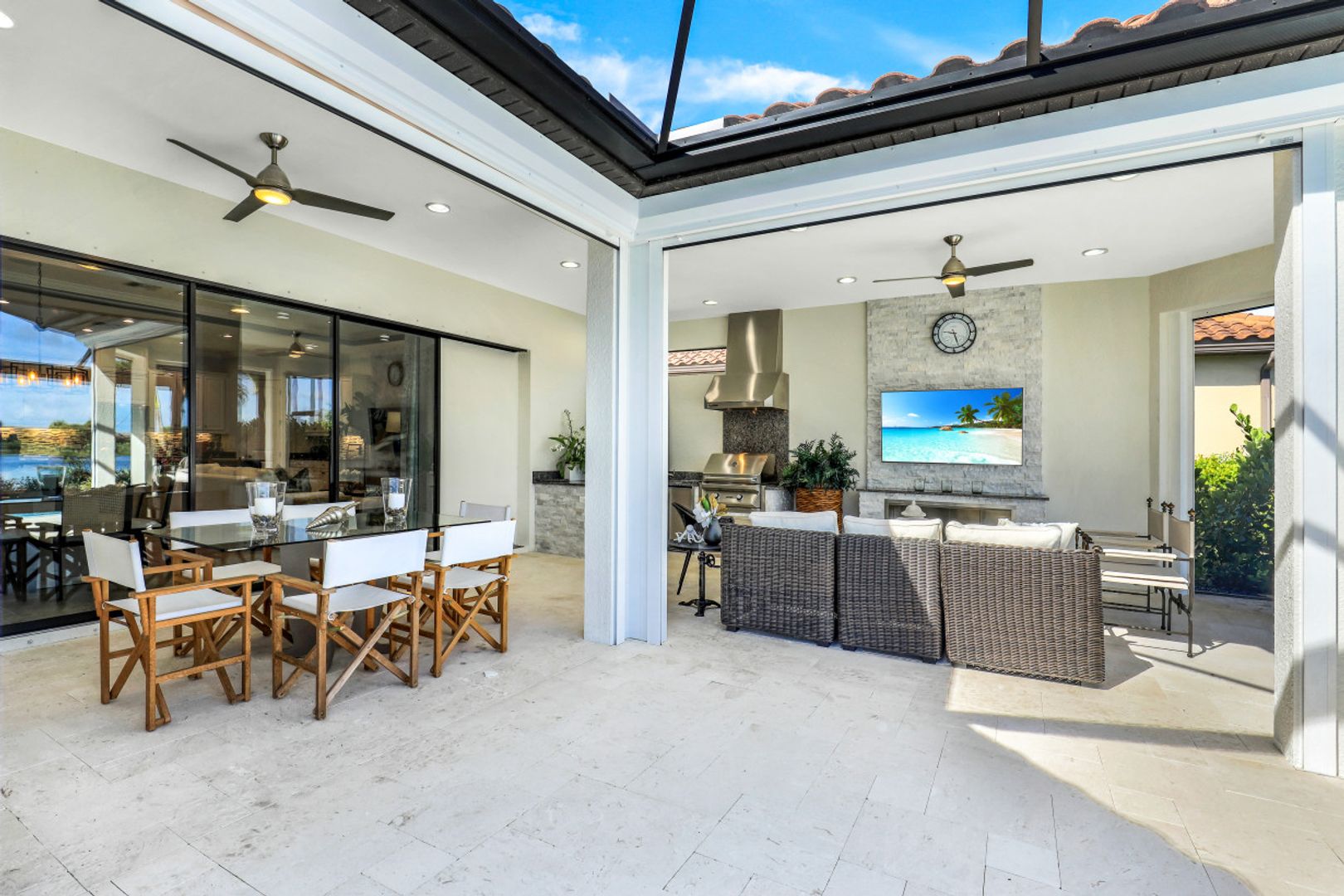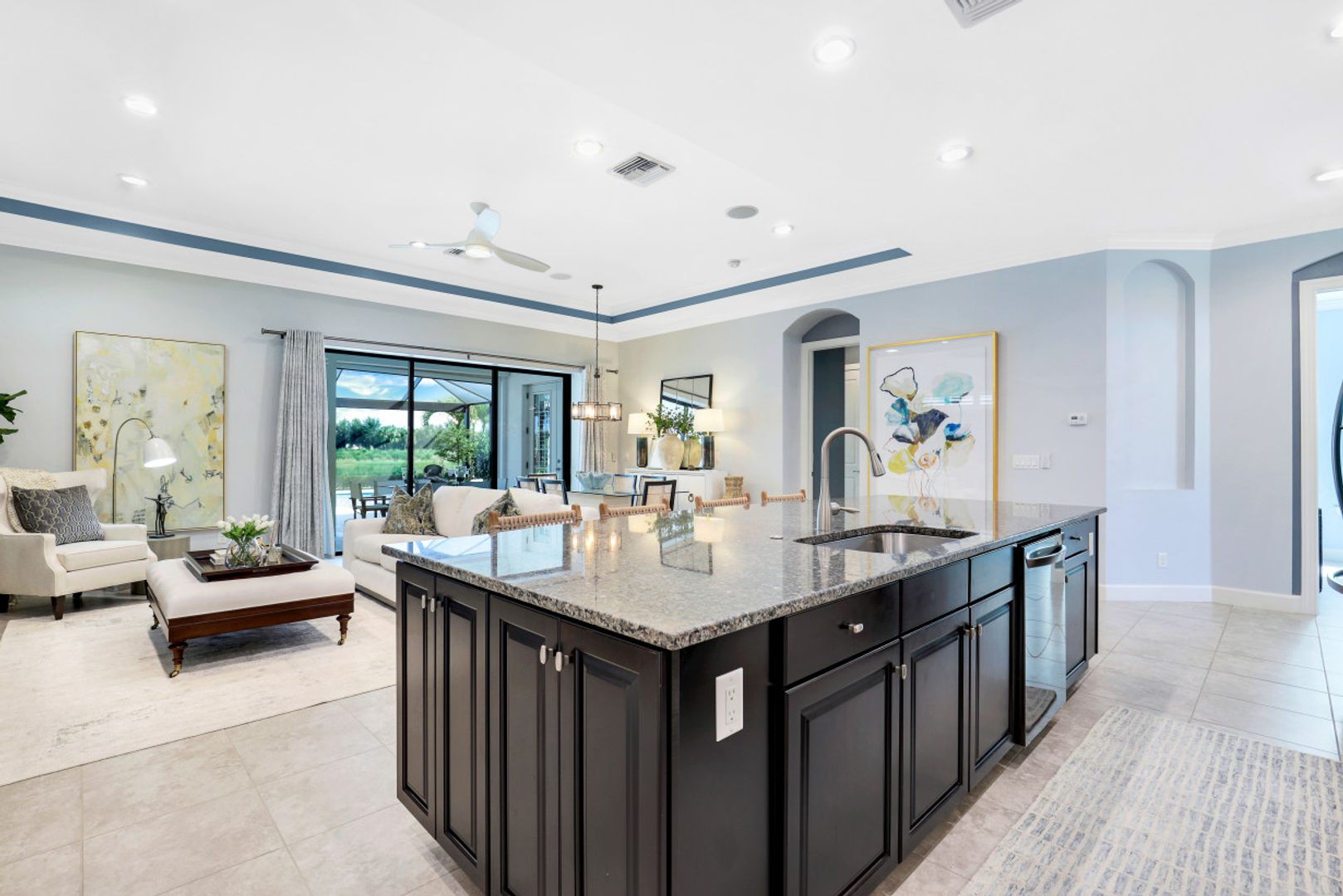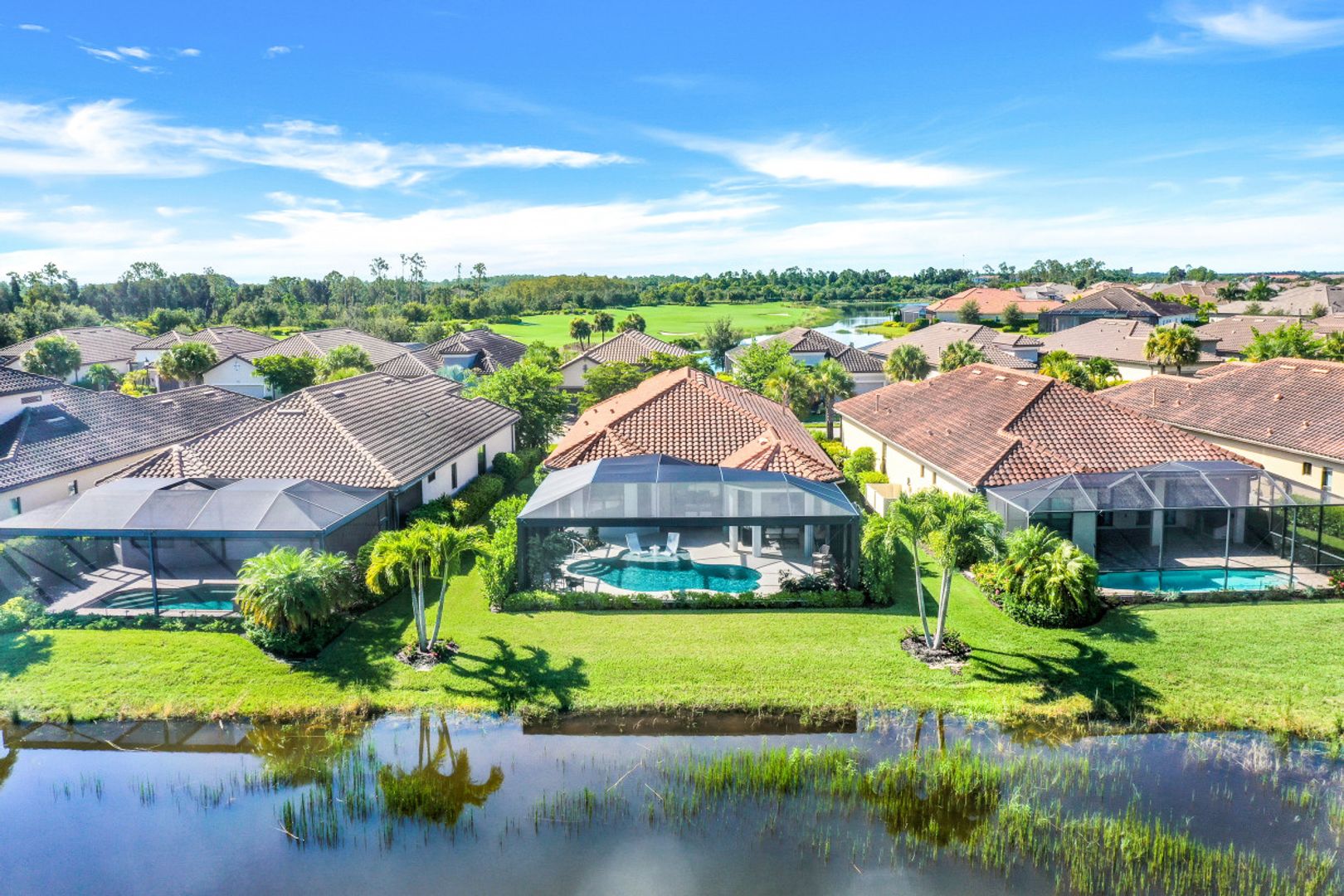This FULL GOLF MEMBERSHIP "Piceno" is situated on one of the best lots in the neighborhood overlooking the lake and golf course. Inside, you will find an open great room style floorplan complete with pocket sliding glass doors to the lanai and oversized kitchen complete a massive 6’x14’ island and NEW LG black stainless appliances including GAS range. The Master Suite is located in the rear of the home with bay window overlooking the pool area, french doors to the lanai, his & her walk in closets, and spa like bath with dual sinks, walk in shower, and soaking tub. Completed just last year, the expanded screened-in lanai is an entertainer’s dream with shellstone decking, custom heated pool with sunshelf & bubbler, outdoor kitchen complete with grill, hood, ice maker, & two beer taps, and entertainment wall with TV & fireplace. Other fine appointments include electric roll down shutters, AC garage, fresh exterior paint, crown molding throughout, plantation shutters, tile & wood floors throughout, NEW tankless gas hot water heater, and more! Esplanade G&CC is a true "Lifestyle Community" with something for everyone: Resort Pool complete with cabanas and beach entrance; 6 tennis courts; 4 bocce balls courts; 4 pickleball courts; Koquina Day Spa offering hair, nail, facial, and spa treatments; Techno Gym with Aerobics Room; Gated Dog Park; Poolside Bahama Bar; 14 miles of bike/walking trails; 18 hole private golf course (can use private cart); 15,000 Sq Ft Culinary Center featuring restaurant, bars, wine tasting room, wine lockers, & Starbucks style cafe! DUES $10,616/yr includes landscaping, all club amenities, & full golf privileges.