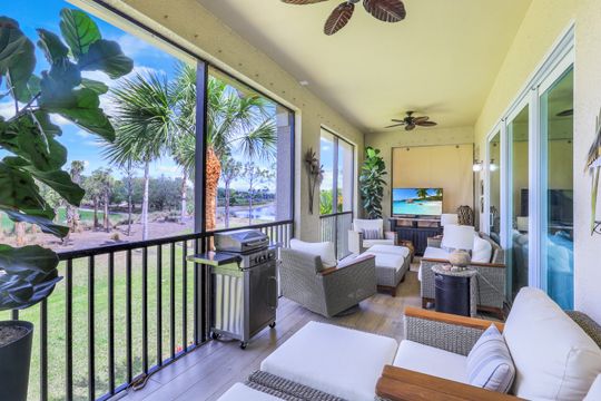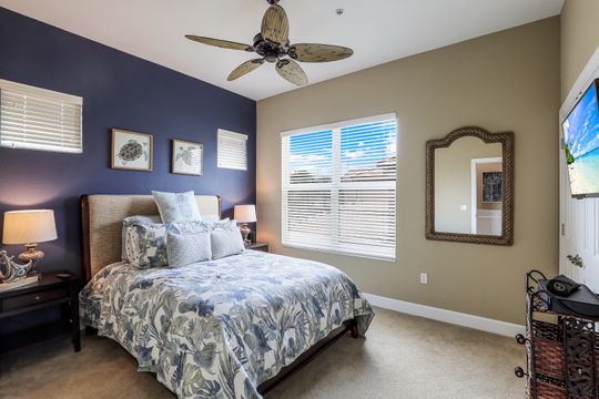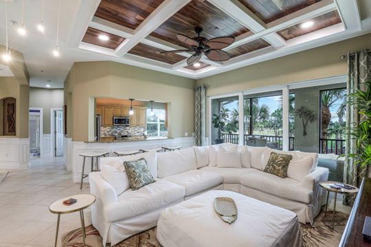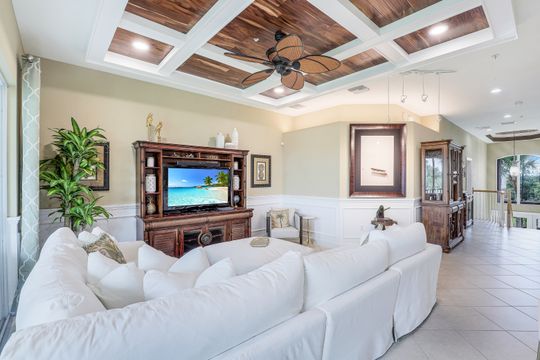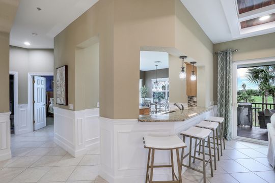 LIVE A VACATION LIFESTYLE IN A COUNTRY CLUB SETTING IN SOUGHT AFTER THE QUARRY! This pristine 2743 sq (under air) PARTIALLY FURNISHED Coach Home features 3 bedrooms, a Den and a Bonus Room and has 3 Full Baths. Many updates and fine appointments including IMPACT WINDOW,DOORS AND SLIDERS (2022) NEWER ROOF (2020), coffered wood ceilings in dining room, living room and entrance way, wainscoting throughout in main living areas , new tile on lanai, updated master shower, cafe appliances in kitchen and updated back splash, new carpeting on stairs(2023), upgraded light fixtures throughout, newly painted (2022), Rockstar custom cabinets and shelving in garage plus more! A "must see" to appreciate the finishing touches! The Quarry is a gated lakefront community offering over 500 acres of lakes for boating, water skiing, paddle boarding, jet skiing, kayaking, and fishing.The Beach Club includes Tennis, Pickleball, Bocce Ball, a Tiki Bar, Restaurant, Pool-Side food/drink service, Fitness Center, and a full-time activities director. The Beach Club is undergoing an $18 million Expansion and Renovation Project which is expected to be completed mid 2023.