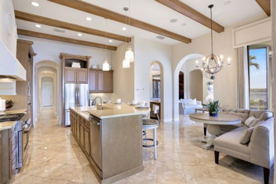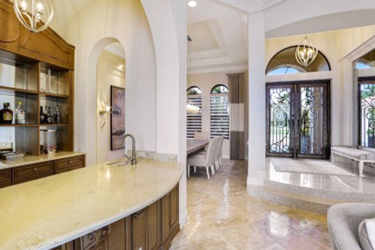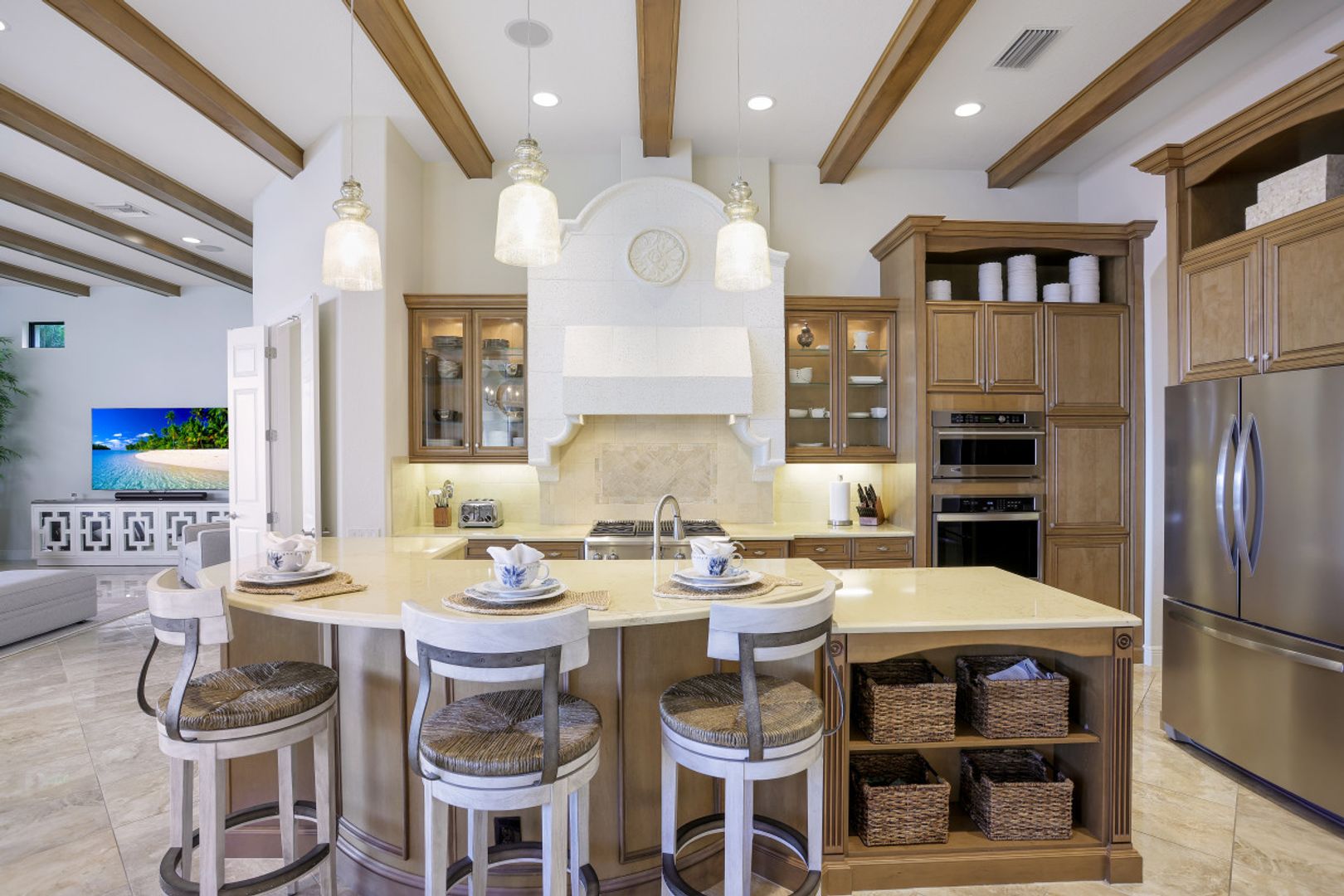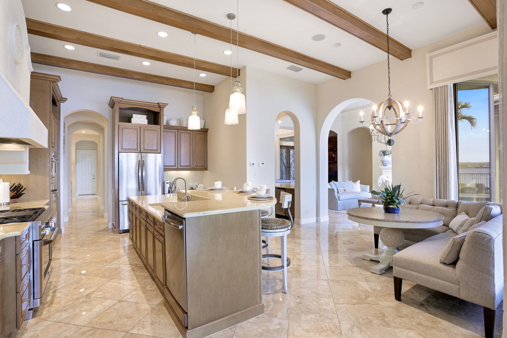 A ONE OF A KIND! This Arthur Rutenberg estate home is situated on a nearly half acre lot overlooking Stone Lake and the beach. Outfitted with a private dock and boat lift, you will enjoy 500 acres of navigable lakes and canals. From the moment you walk through the wrought iron front doors to the formal living room with wet bar and wine bar, luxurious kitchen with GAS range, exposed stained beams, multiple tray ceilings, rich moldings, pocket sliding glass doors to the lanai, and sweeping lake views, you are surrounded by pure elegance. Other fine appointments include: impact windows/doors; whole house water softener; garage AC; two gas fireplaces; tiki torches around the pool; hurricane & bug screen roll down shutters on the lanai; tile & wood floors throughout; and more! Furniture included. The Quarry is a lakefront community offering something for everyone: Boating, Golf, Tennis, Pickleball, Bocce Ball, Tiki Bar, Restaurant, Pool-Side Food/Drink Service, Gym, Social Activities including Full Time Social Director, and more! The Quarry offers a Private 18 hole Golf Club (Not Mandatory). An impressive $15M renovation and expansion of the Lake Lodge & Beach Club is under way.