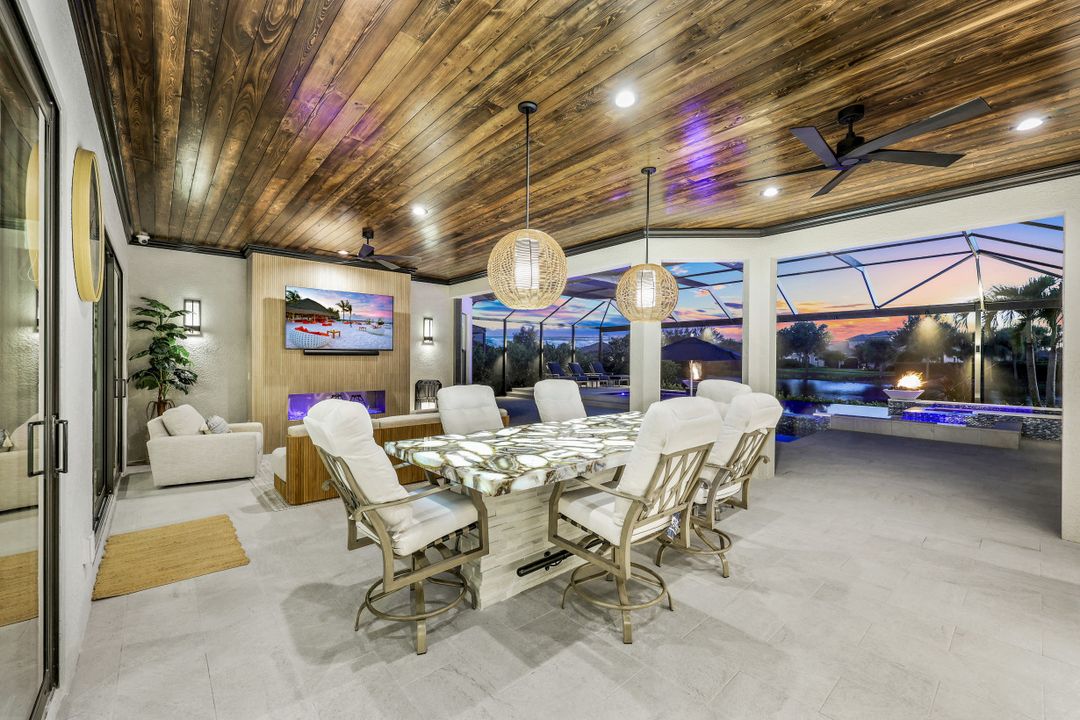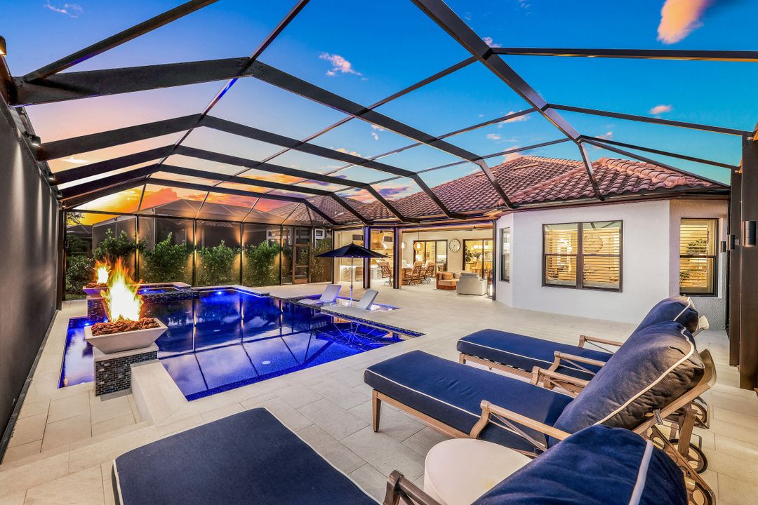 Welcome to 9223 Rialto Lane, where luxury and lifestyle come together in this stunning Pallazio open-concept home. Recently transformed with over $600K in upgrades, this residence offers an extraordinary blend of indoor elegance and resort-style outdoor living. The highlight of this home is the new oversized outdoor living oasis: infinity edge pool with sun shelf, large spa, outdoor fireplace, and state-of-the-art 16-foot summer kitchen. Entire outdoor area is porcelain tile flooring laid over a cement slab. Custom lighting on the picture frame screen cage, in and around the pool. This home offers one of the largest outdoor living areas in the community, making it truly exceptional. Perfect for entertaining or simply soaking in the sun and breathtaking western sunsets Naples is famous for. Inside, you’ll find 3 gracious bedrooms plus a den. Plantation shutters, and wide-plank luxury vinyl flooring throughout, except master bath with marble. The newly expanded kitchen shines with quartz countertops, upgraded cabinetry, custom backsplashes, and top-of-the-line appliances, including a Wolf professional gas range with double ovens. Bonus beverage center with wine cooler. The reimagined primary suite boasts a bay window overlooking the lanai, upgraded spa shower, expanded dressing area, and custom storage solutions. Additional upgrades include a Lutron lighting system, climate-controlled over-sized 2-car garage, tankless water heater, newly added electric storm screens on the lanai and lush, colorful landscaping surrounding the entire home. As a bonus, golf membership is included with this property. Esplanade’s resort lifestyle features a free-form pool with cabanas, poolside restaurant and bar, fitness center, tennis, pickleball, bocce, full-service salon and spa, a culinary center with wine tasting room and wine lockers, and a dog park, plus an 18-hole championship golf course. Perfectly located, Esplanade provides easy access to Naples’ renowned beaches, shopping, dining, and all the best the area has to offer.