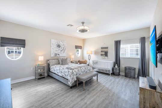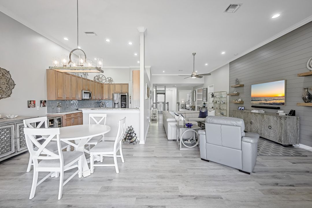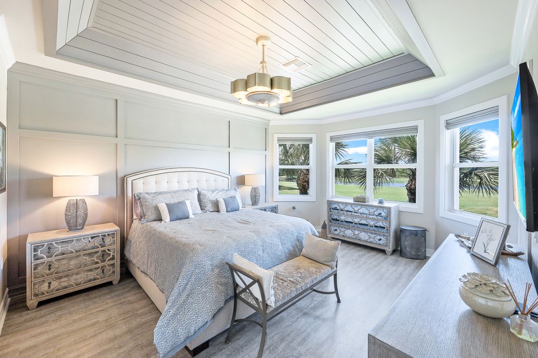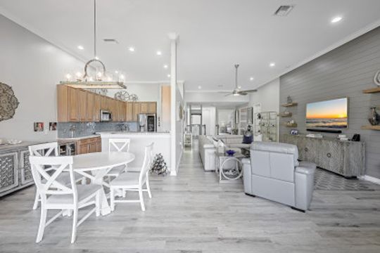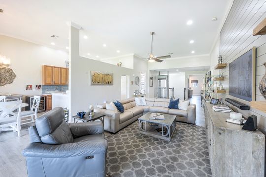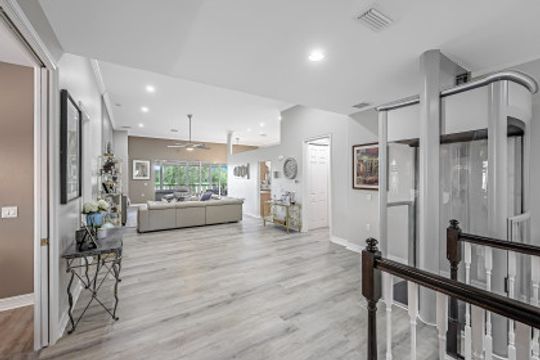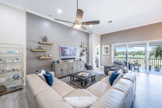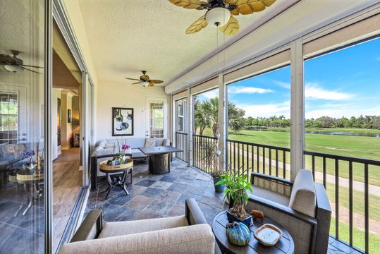 Welcome to this immaculate, furnished, 2nd floor Carriage Home located in the Triana neighborhood of Renaissance! Completely redesigned with coastal contemporary finishes. This home boasts an open interior that flows effortlessly between the living space and the generously sized screened lanai. Enjoy new luxury vinyl flooring throughout, beautiful matte finish granite kitchen countertops, new stainless steel appliances, 42” light wood kitchen cabinetry and a new stiltz custom elevator! Each bathroom has been thoroughly re-imagined with beautiful new tile flooring, new cabinetry, gorgeous fixtures, quartz countertops, and exquisite new shower tile. Additional notable features include gorgeous modern shiplap and feature wall, soaring high ceilings, TWO Primary Suites, and updated lighting fixtures. The outdoor space gives you the best of Florida living, with gorgeous views of the lake and Hole #1 of the Arthur Hills Championship Golf Course. The Renaissance lifestyle includes an Arthur Hills Championship Golf Course, resort style pool and pool pavilion, children’s play area, full service spa & fitness center, 6 red clay tennis courts, 2 pickle ball courts and 2 bocce courts.