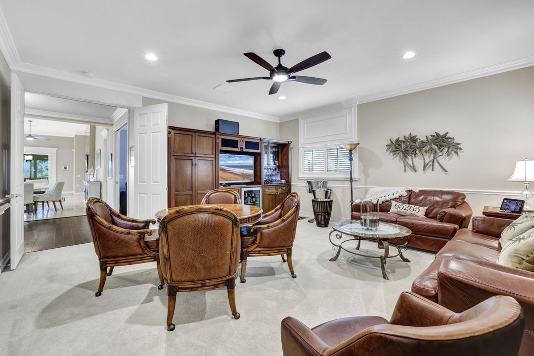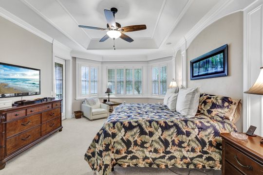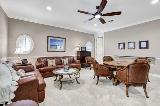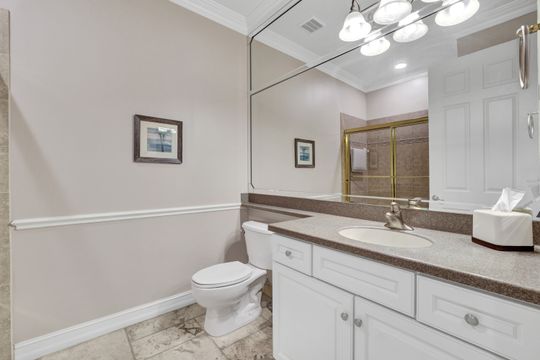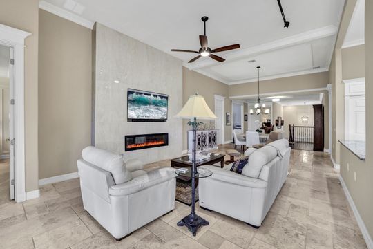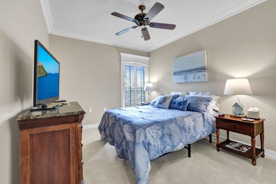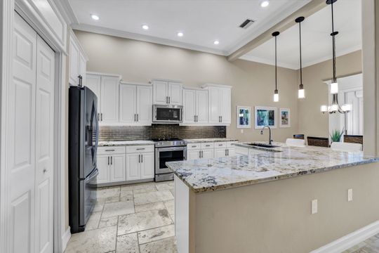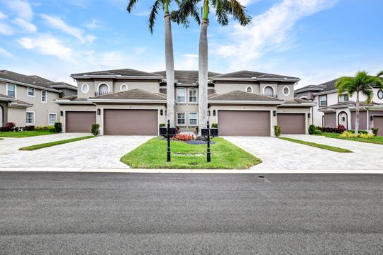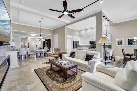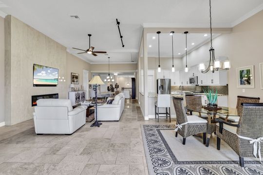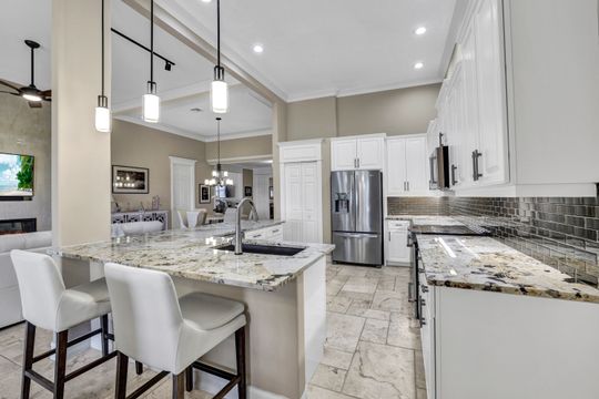 Discover your dream home in this beautifully redesigned Carriage Home, nestled in the highly desired Renaissance community. This extraordinary 2nd floor abode is a unique gem, boasting stunning vistas of the golf course, lake and mesmerizing sunrises. The home has been thoughtfully updated, offering a generous floor plan with 2 Owner's Suites, spacious guest room, three full bathrooms, and a flexible den space. The kitchen is a chef's paradise, outfitted with recently replaced sleek stainless steel appliances, sophisticated granite countertops, interactive design, and sparkling white cabinetry. Enhanced by remodeled bathrooms, a wide open lanai, newer hot water heater and AC, elegant travertine tile flooring, electric fireplace, high ceilings, and the convenience of two master suites, this property is a standout. Renaissance boasts an active lifestyle with top notch amenities like an 18-Hole Arthur Hills Championship Golf Course, a sumptuous resort-style pool and pavilion, a children's play area, a full-service spa and fitness center, six red clay tennis courts, two pickleball courts, and two bocce courts.