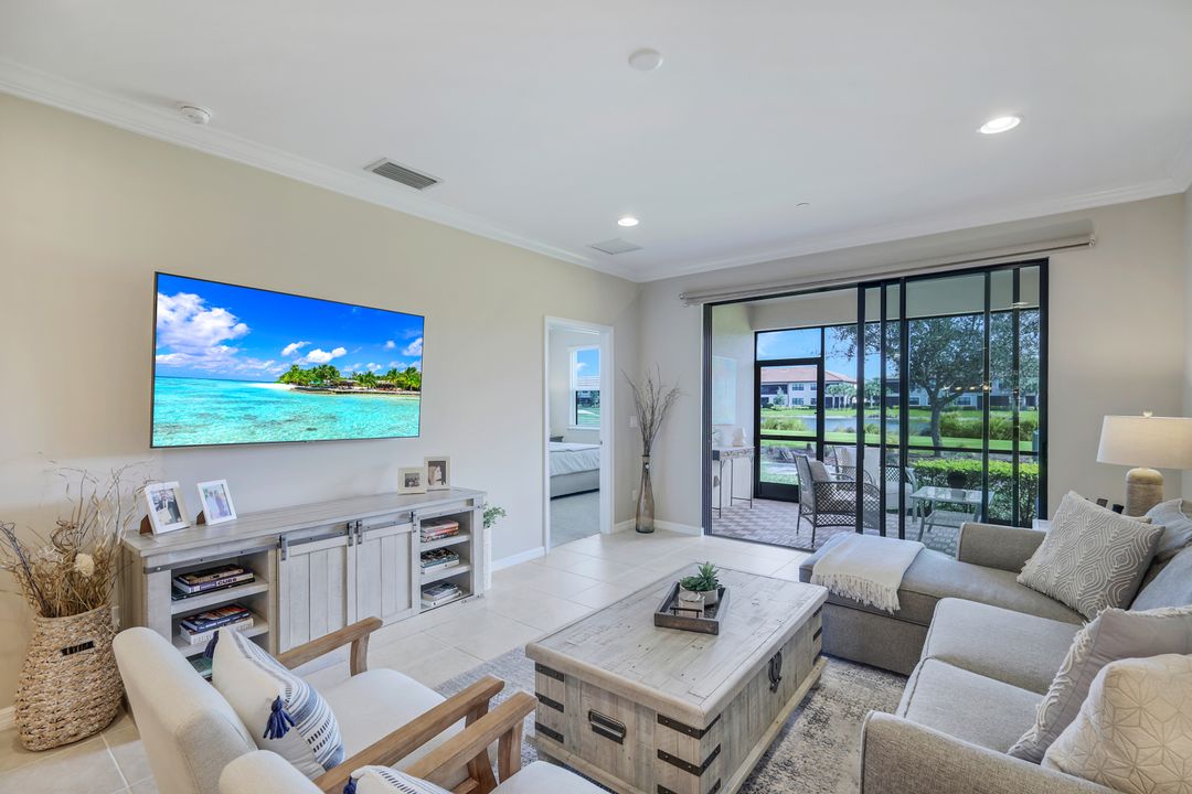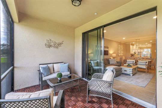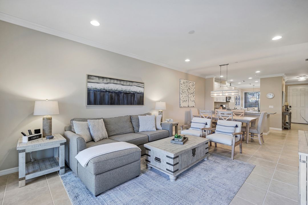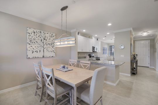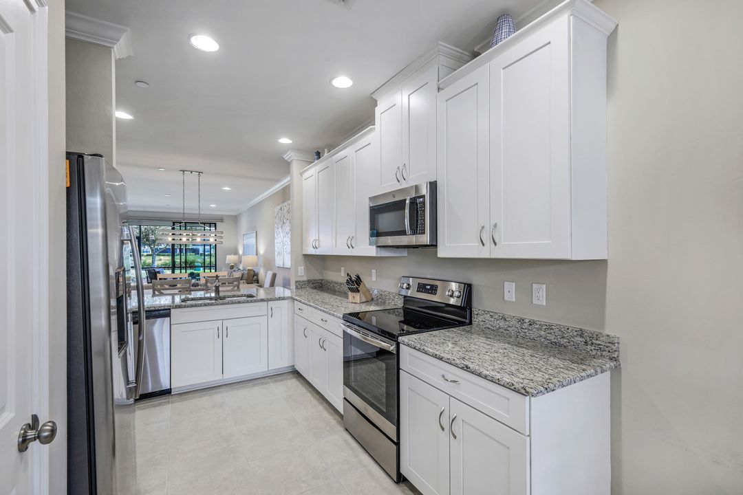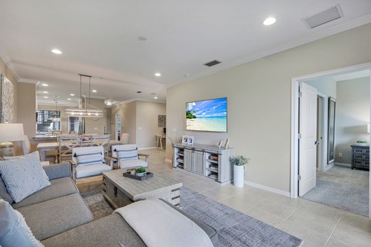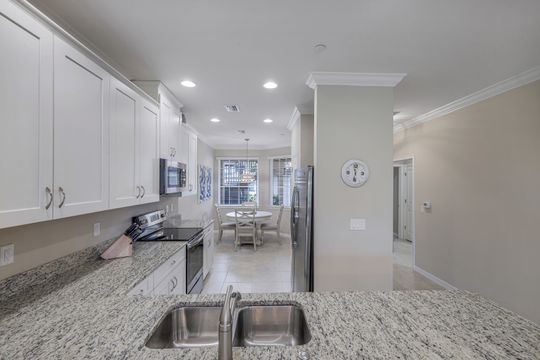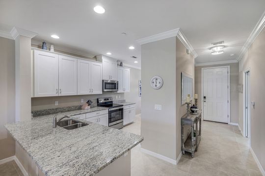 LIVE A VACATION LIFESTYLE IN ESPLANADE! Enjoy sunrise views overlooking the golf course and lake from this TURNKEY FIRST FLOOR 2+Den/2 Bath/1 car garage condo. Built in 2020, this lightly used condo is better than new and offers an open and airy floorplan making it perfect for entertaining. A long list of special features include white shaker cabinets, crown molding, stainless steel appliances, granite countertops, upgraded lights/fans, tasteful furniture & decor, and more! CLUB/SPORTS MEMBERSHIP INCLUDED! Esplanade is a true "Lifestyle Community" with something for everyone: resort pool complete with cabanas & poolside "Bahama Bar"; tennis; pickleball; bocce; Koquina Day Spa; fitness center; two dog parks; 14 miles of bike/walking trails; 18 hole private golf course; 15,000 Sq Ft clubhouse featuring restaurant, bar, wine tasting room, wine lockers, & Starbucks style cafe!