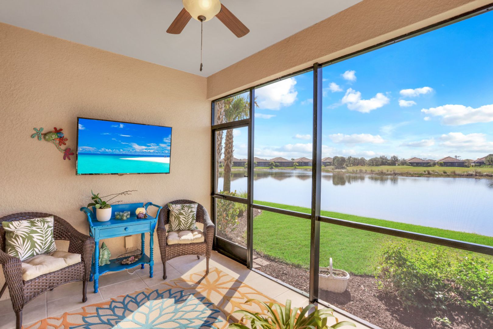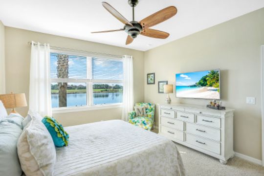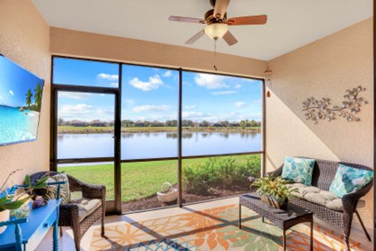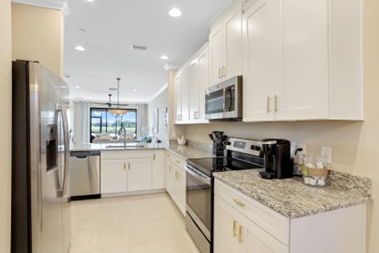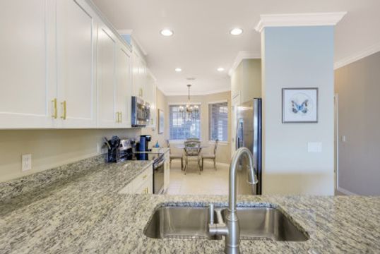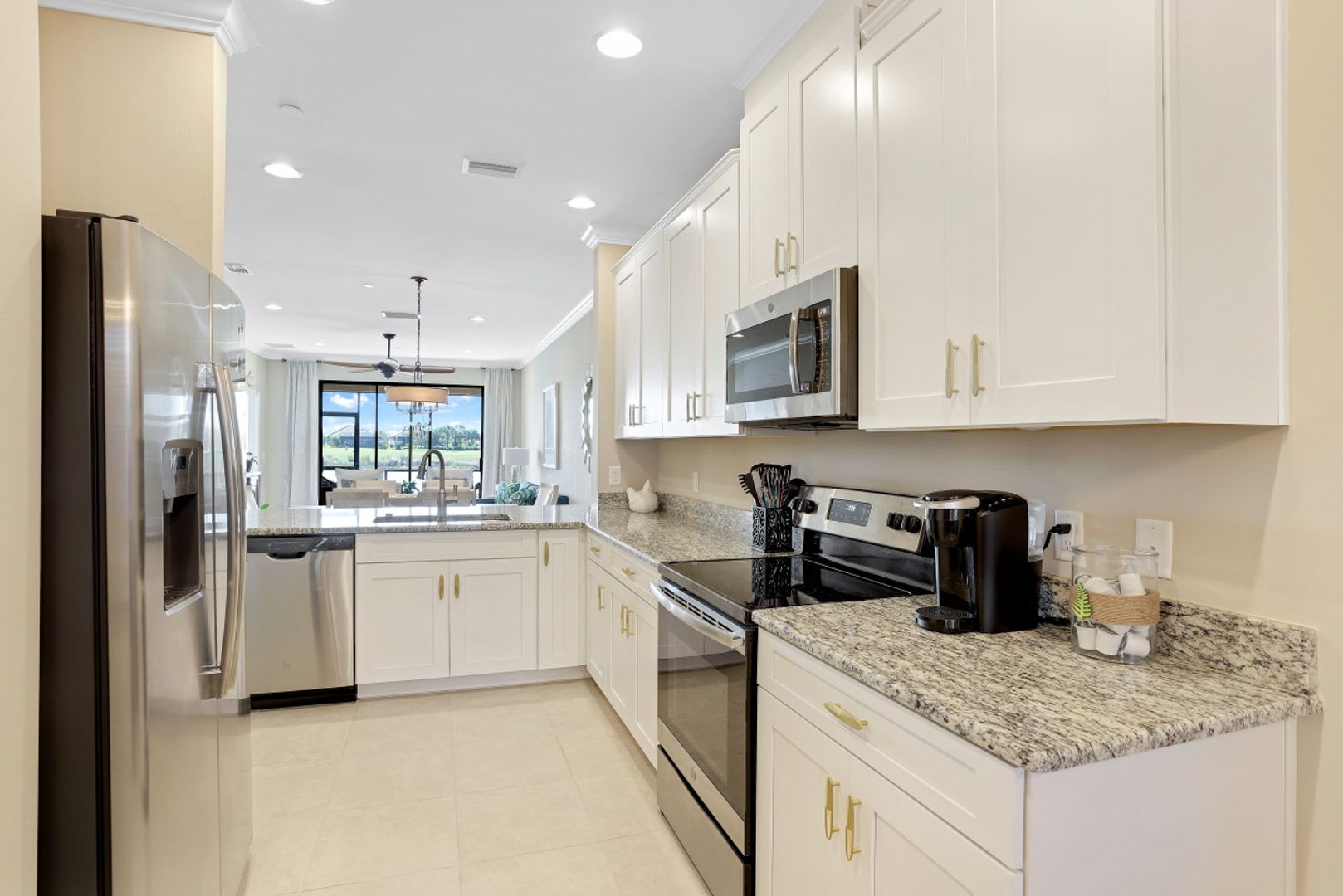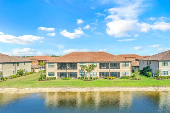LIVE A VACATION LIFESTYLE IN ESPLANADE! FIRST FLOOR CONDO. 2+DEN/2 BATH. Enjoy sunsets 365 days a year overlooking one of the BEST VIEWS within the community of the lake and 16th hole! An open and airy floorplan greets you when you walk in the door and features a long list of upgrades: tile floors throughout the common areas and den; crown molding; white shaker style cabinets with granite countertops; SS appliances; spacious laundry room; detached 1 car garage; and more! This condo comes with a CLUB/SPORTS MEMBERSHIP which gives you access to all amenities with the exception of in-season golf! Esplanade G&CC is a true "Lifestyle Community" with something for everyone: Resort Pool complete with cabanas and beach entrance; 6 tennis courts; 4 bocce balls courts; 4 pickleball courts; Koquina Day Spa offering hair, nail, facial, and spa treatments; Techno Gym with Aerobics Room; Gated Dog Park; Poolside Bahama Bar; 14 miles of bike/walking trails; 18 hole private golf course; 15,000 Sq Ft Culinary Center featuring restaurant, bars, wine tasting room, wine lockers, & Starbucks style cafe! DUES $8,980/yr including water/sewer, insurance, building maintanence, and all club amenities!