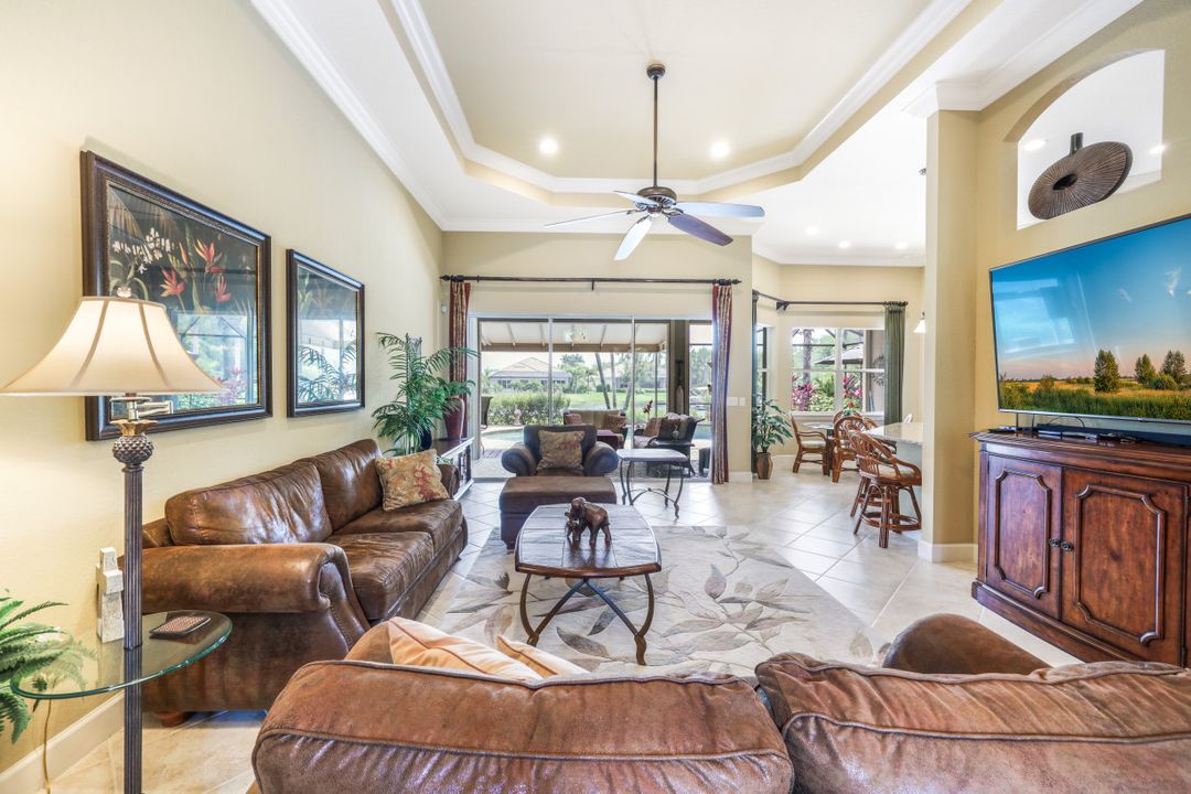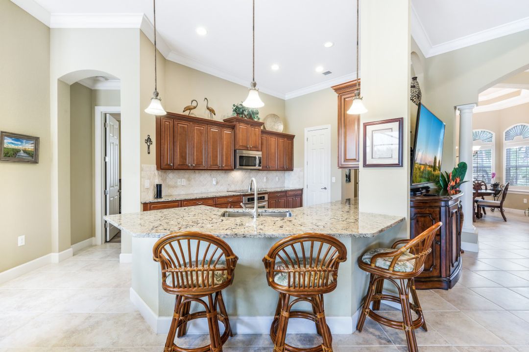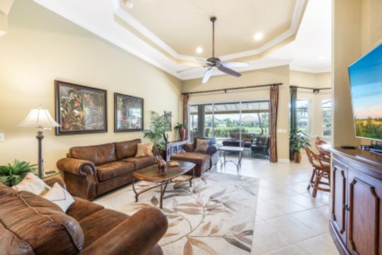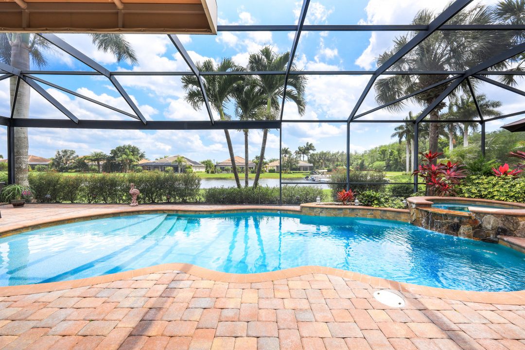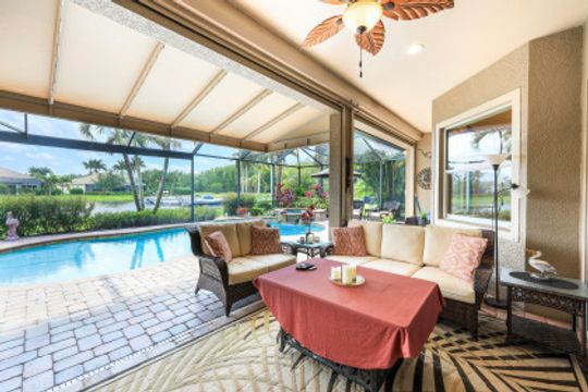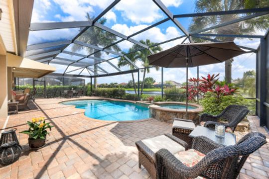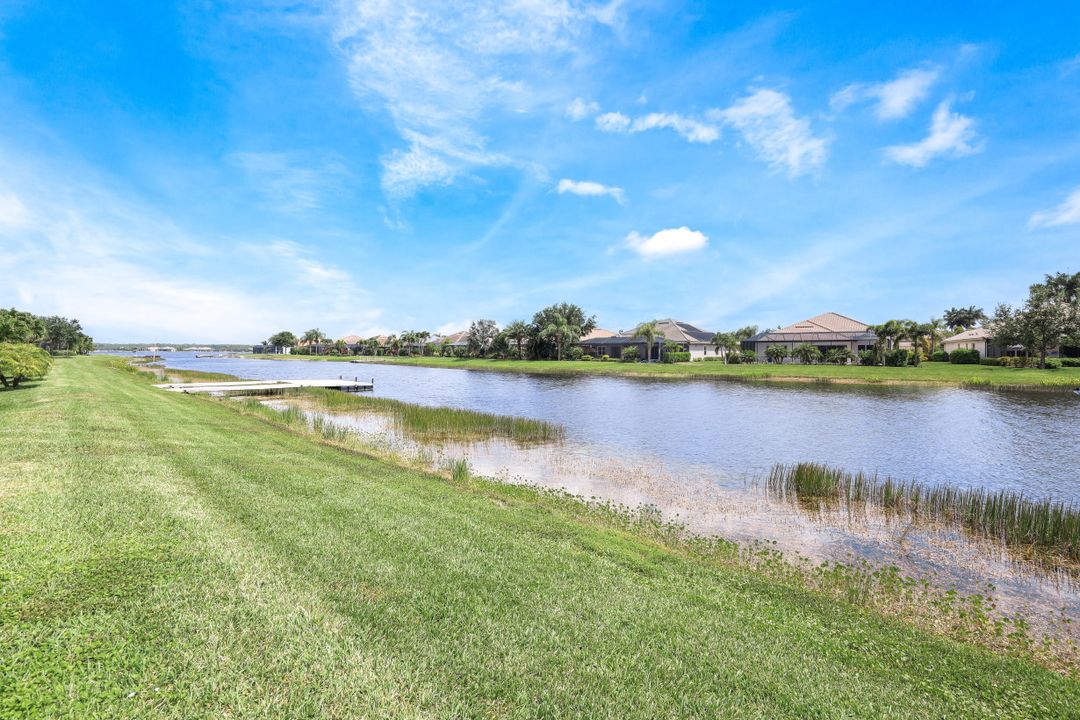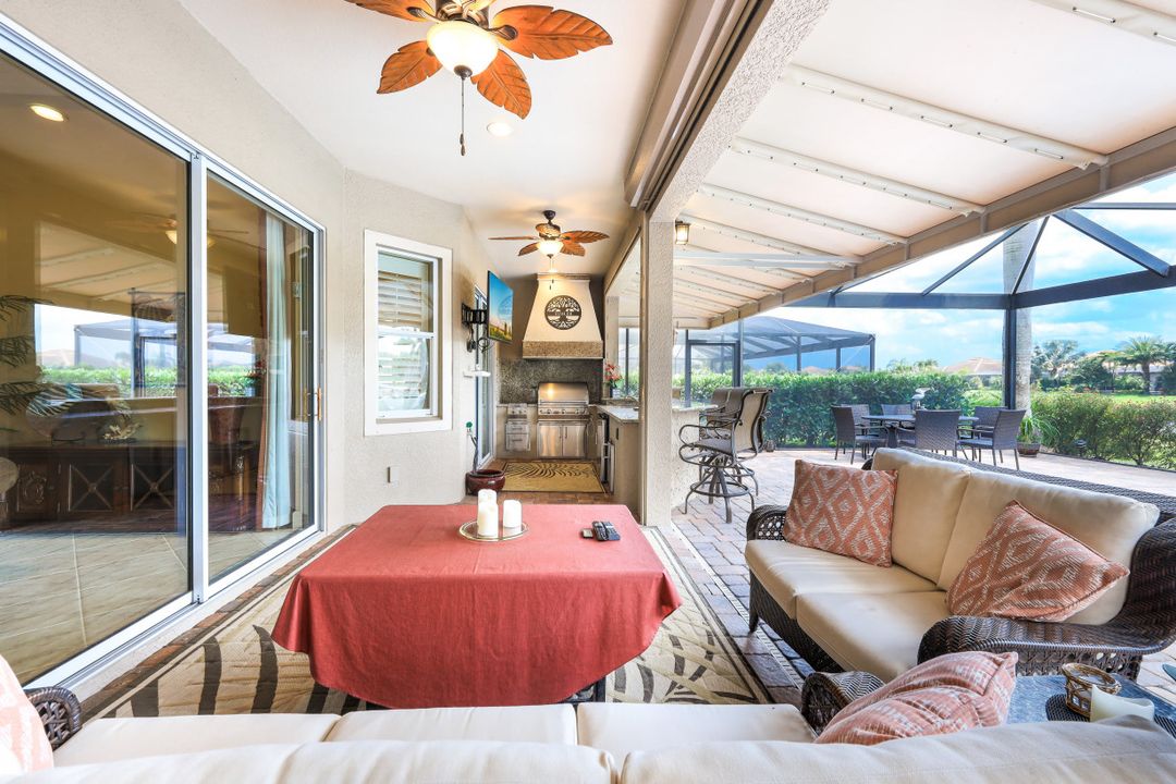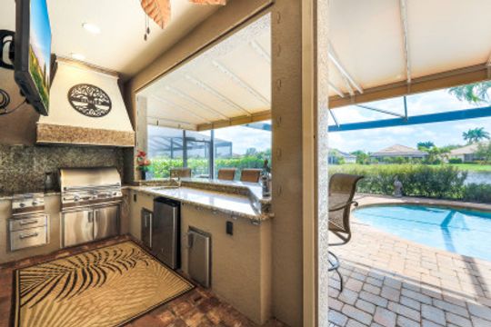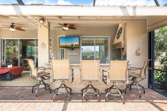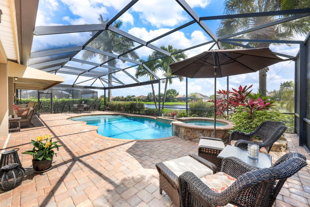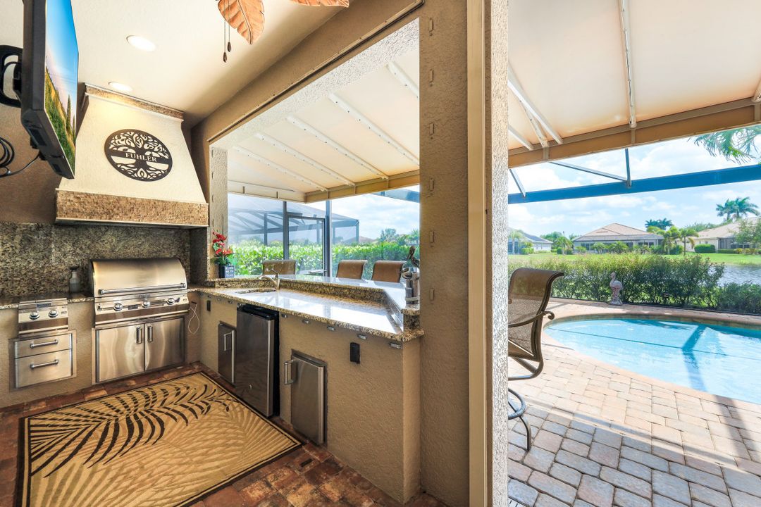 LAKE AND RESORT LIVING IN THE QUARRY! This FURNISHED LAKEFRONT PROPERTY features 3 bedrooms plus a den, two full baths, one half bath and an extended two car garage and has SOUTHERN EXPOSURE! Enjoy relaxing by the pool and spa on your lanai featuring a custom outdoor kitchen and large bar with an extended awning to provide ample shade while entertaining. Other fine appointments include tile in main living areas, luxury laminate in bedrooms, granite countertops, stainless steel appliances and an eat-in kitchen overlooking the pool/spa and lake. Newer AC in 2022 and Storm Smart shutters on the lanai. Also, not to be missed - a grand and EXPANSIVE MAIN BATHROOM featuring two separate shower heads and soaking tub. The Quarry is an amenity-rich gated, lakefront community offering over 500 acres of lakes for boating, water skiing, paddle boarding, jet skiing, kayaking and fishing. The NEWLY RENOVATED Beach Club includes Tennis, Pickleball, Bocce, a Tiki Bar, Restaurant, Poolside Food and Drink Service, a Wellness Center, and a full-time activities director. The Quarry Golf Lodge and Golf Club offers an 18 hole PGA Level Hurdzan-Frye Golf Course. GOLF MEMBERSHIP IS OPTIONAL.