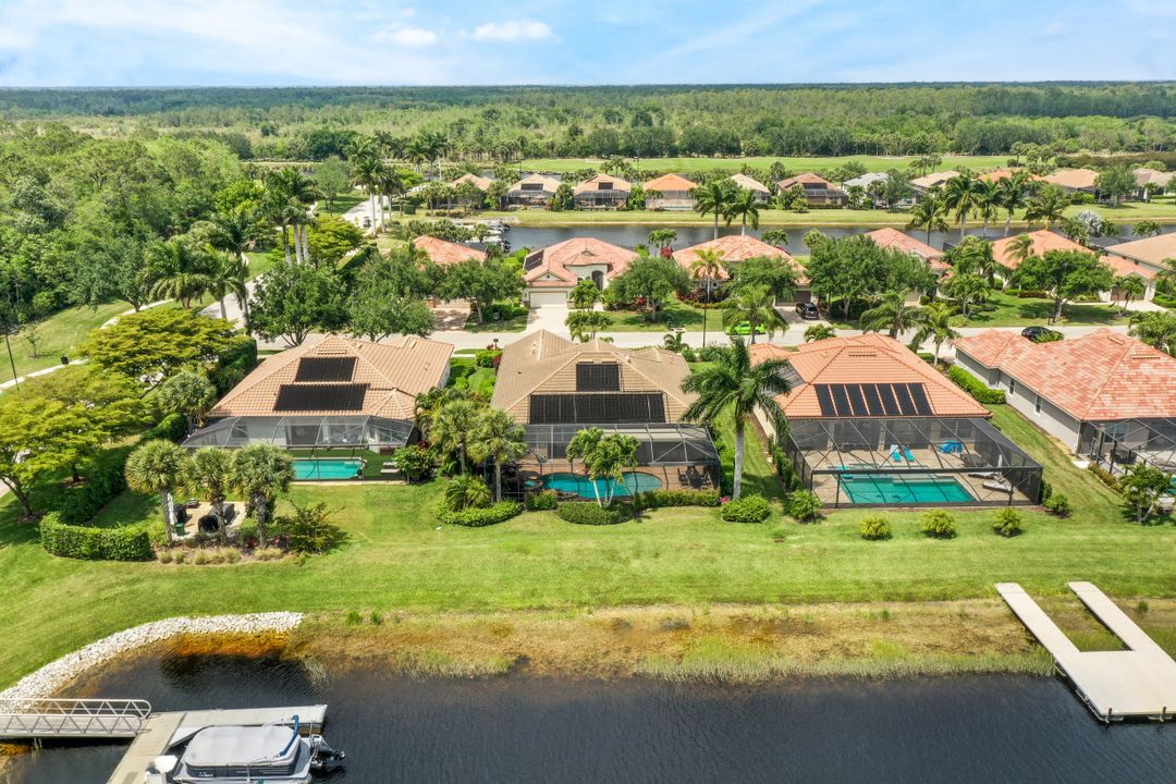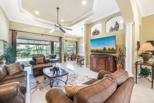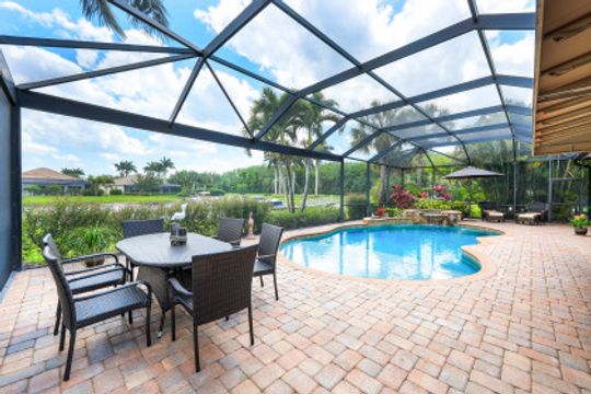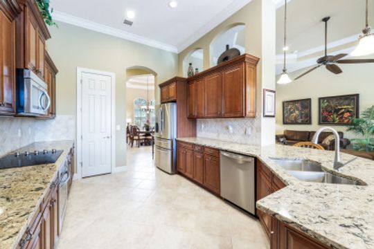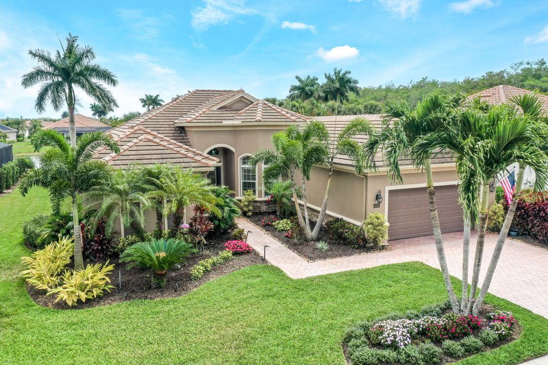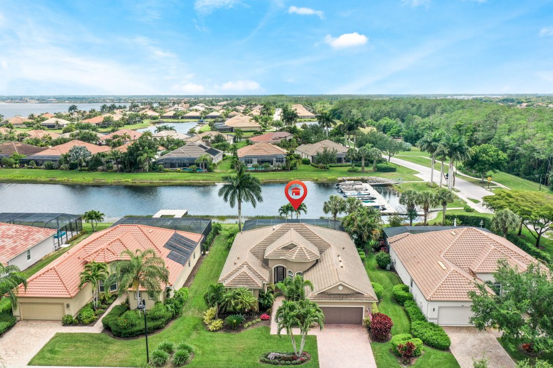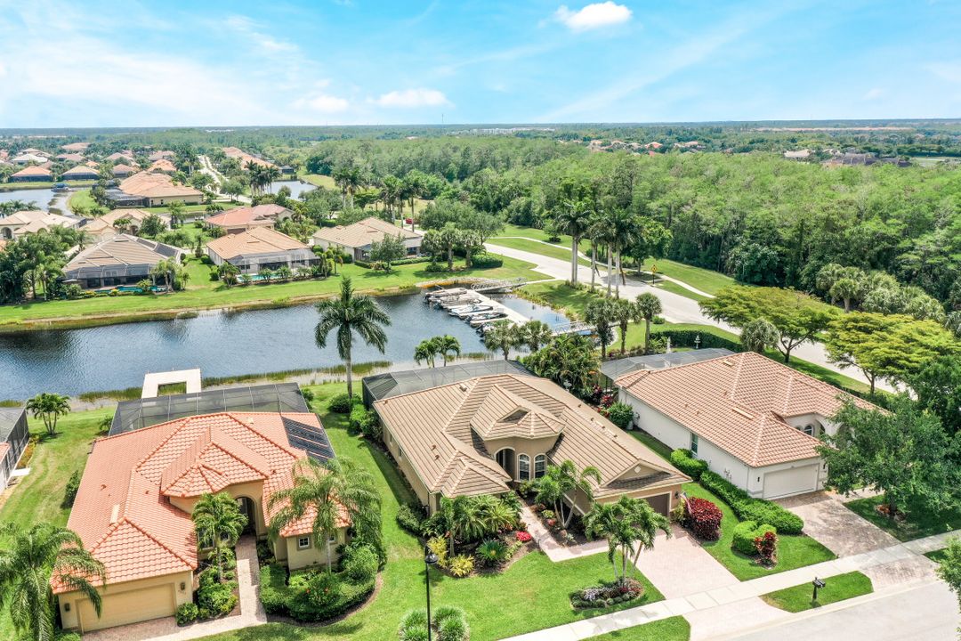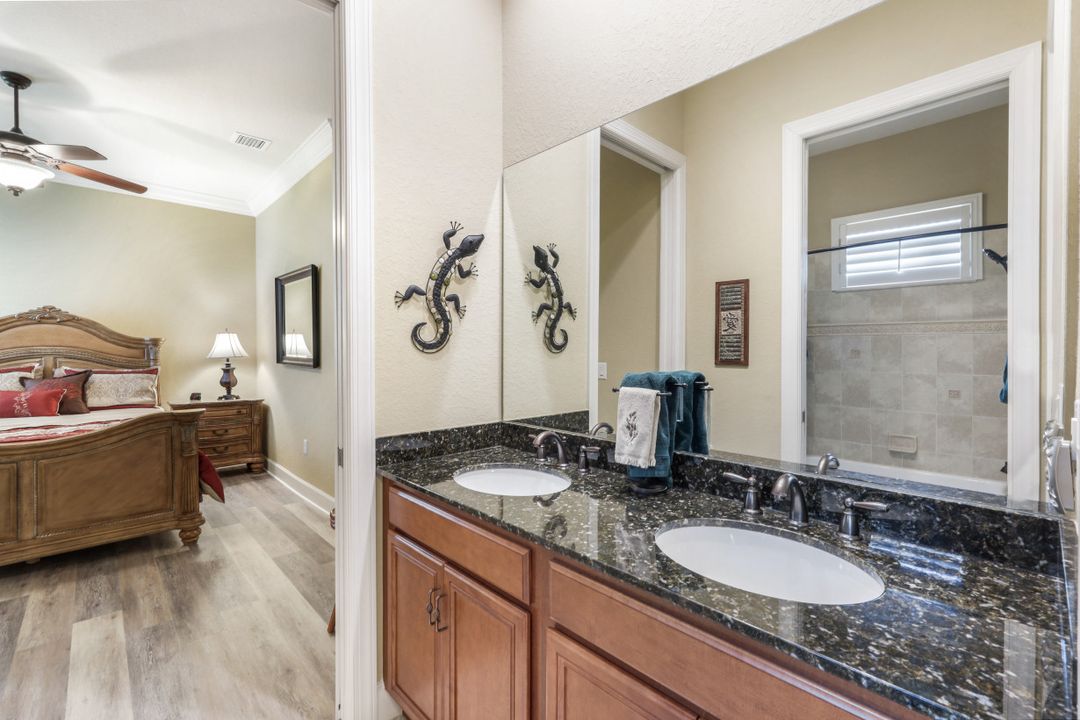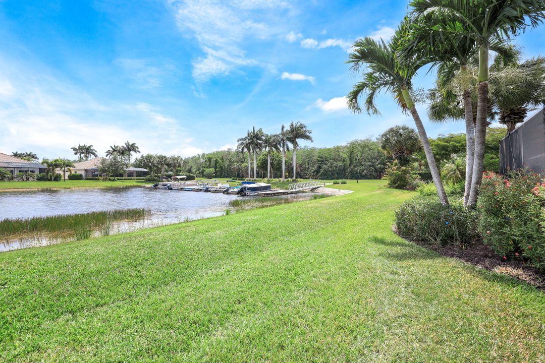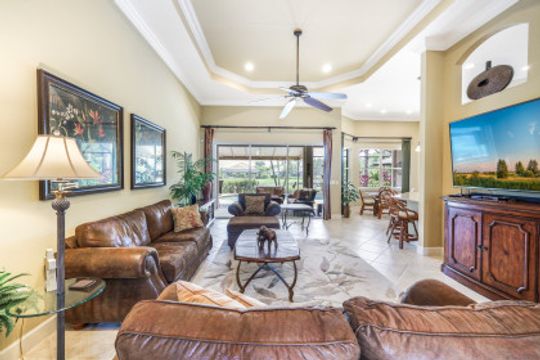 LAKE AND RESORT LIVING IN THE QUARRY! This FURNISHED LAKEFRONT PROPERTY features 3 bedrooms plus a den, two full baths, one half bath and an extended two car garage and has SOUTHERN EXPOSURE! Enjoy relaxing by the pool and spa on your lanai featuring a custom outdoor kitchen and large bar with an extended awning to provide ample shade while entertaining. Other fine appointments include tile in main living areas, luxury laminate in bedrooms, granite countertops, stainless steel appliances and an eat-in kitchen overlooking the pool/spa and lake. Newer AC in 2022 and Storm Smart shutters on the lanai. Also, not to be missed - a grand and EXPANSIVE MAIN BATHROOM featuring two separate shower heads and soaking tub. The Quarry is an amenity-rich gated, lakefront community offering over 500 acres of lakes for boating, water skiing, paddle boarding, jet skiing, kayaking and fishing. The NEWLY RENOVATED Beach Club includes Tennis, Pickleball, Bocce, a Tiki Bar, Restaurant, Poolside Food and Drink Service, a Wellness Center, and a full-time activities director. The Quarry Golf Lodge and Golf Club offers an 18 hole PGA Level Hurdzan-Frye Golf Course. GOLF MEMBERSHIP IS OPTIONAL.