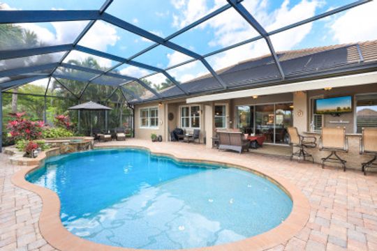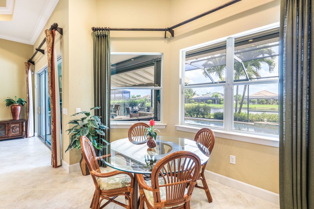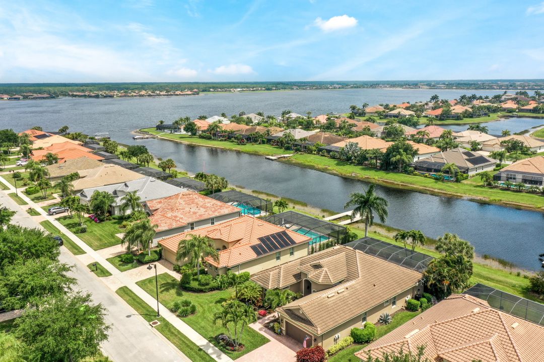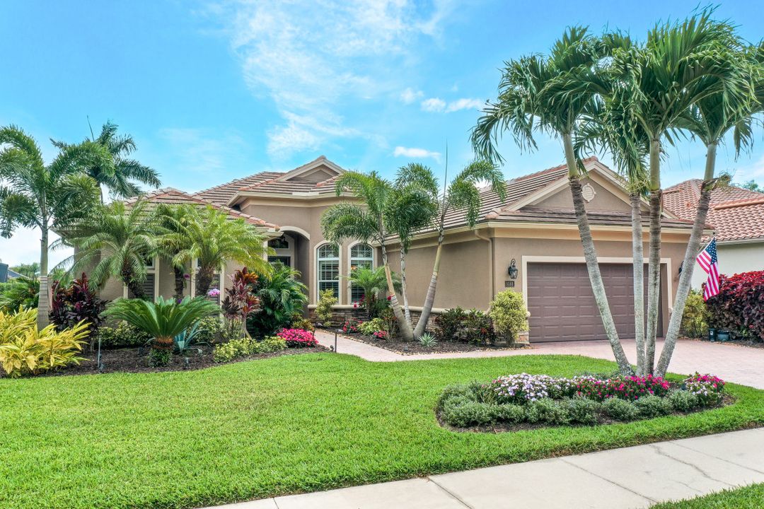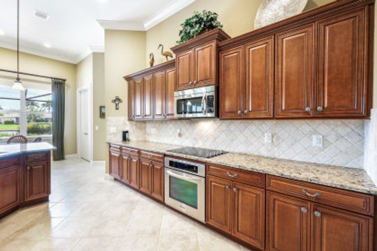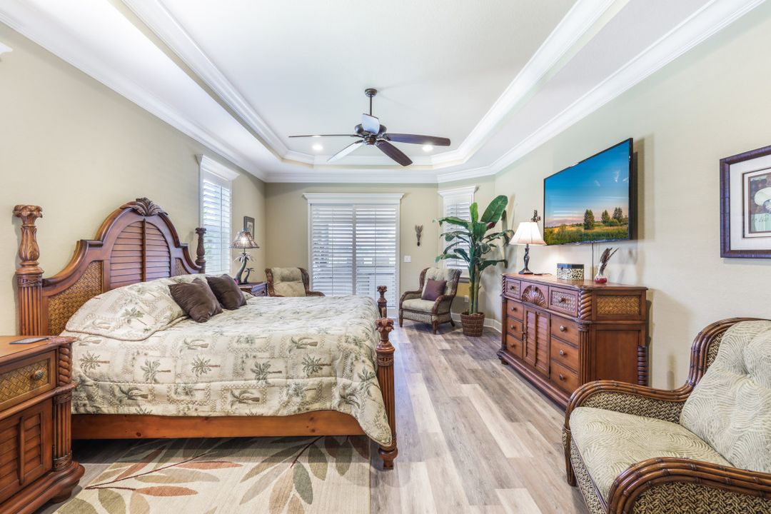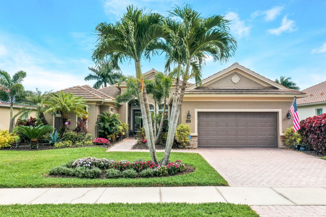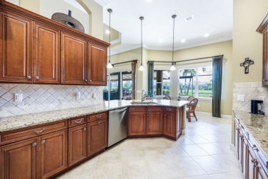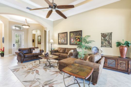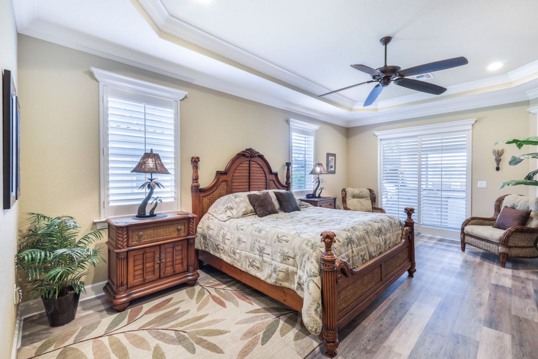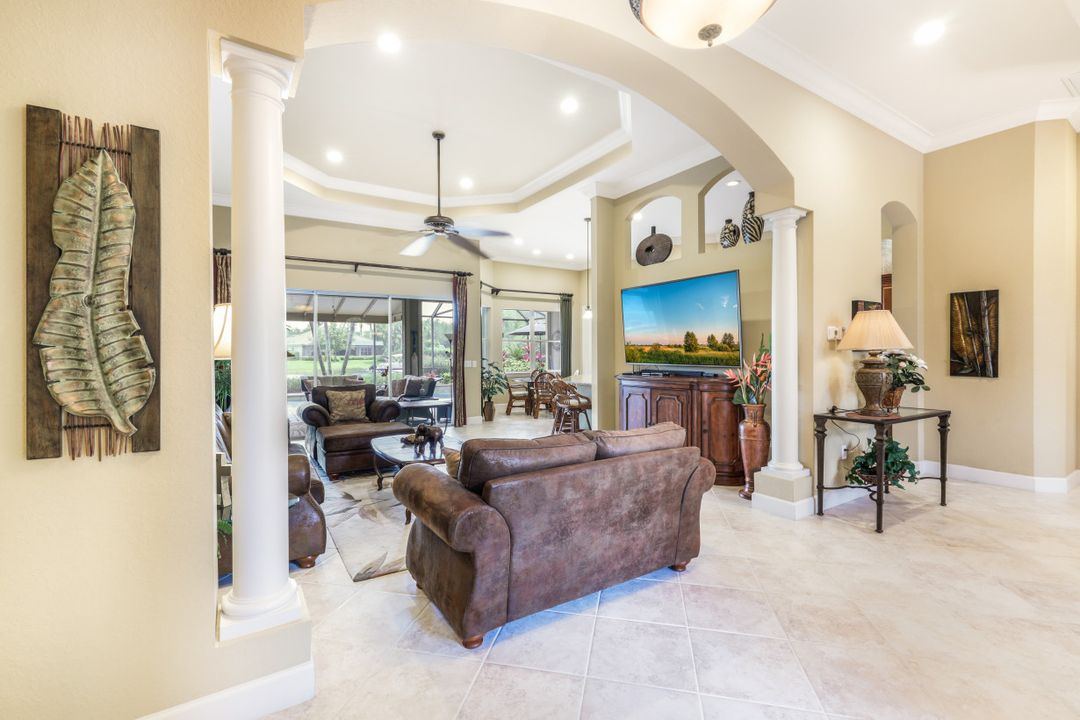 LAKE AND RESORT LIVING IN THE QUARRY! This FURNISHED LAKEFRONT PROPERTY features 3 bedrooms plus a den, two full baths, one half bath and an extended two car garage and has SOUTHERN EXPOSURE! Enjoy relaxing by the pool and spa on your lanai featuring a custom outdoor kitchen and large bar with an extended awning to provide ample shade while entertaining. Other fine appointments include tile in main living areas, luxury laminate in bedrooms, granite countertops, stainless steel appliances and an eat-in kitchen overlooking the pool/spa and lake. Newer AC in 2022 and Storm Smart shutters on the lanai. Also, not to be missed - a grand and EXPANSIVE MAIN BATHROOM featuring two separate shower heads and soaking tub. The Quarry is an amenity-rich gated, lakefront community offering over 500 acres of lakes for boating, water skiing, paddle boarding, jet skiing, kayaking and fishing. The NEWLY RENOVATED Beach Club includes Tennis, Pickleball, Bocce, a Tiki Bar, Restaurant, Poolside Food and Drink Service, a Wellness Center, and a full-time activities director. The Quarry Golf Lodge and Golf Club offers an 18 hole PGA Level Hurdzan-Frye Golf Course. GOLF MEMBERSHIP IS OPTIONAL.