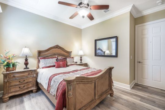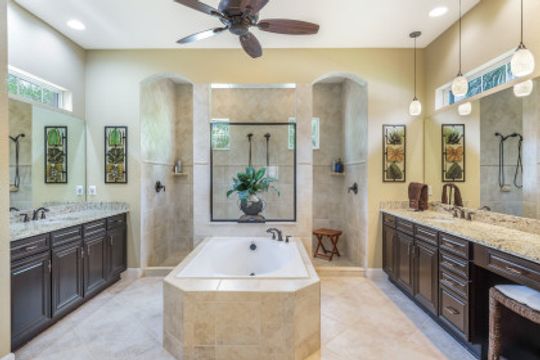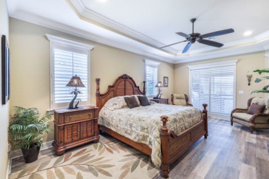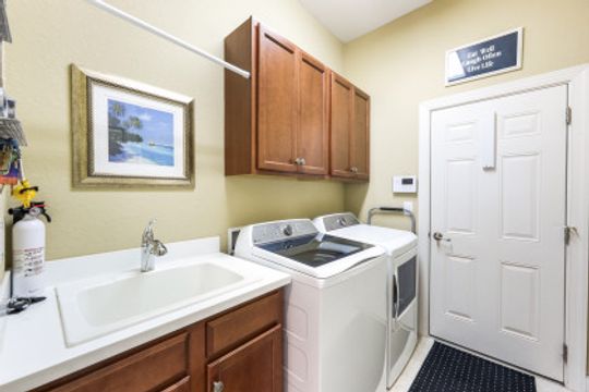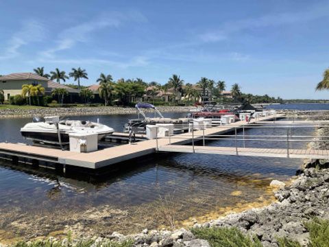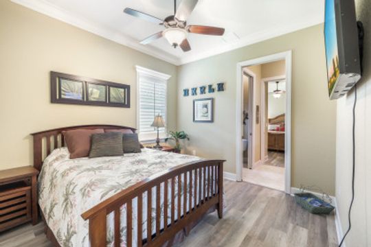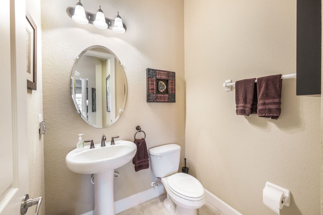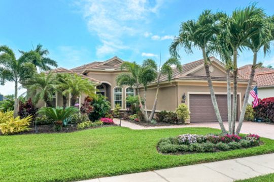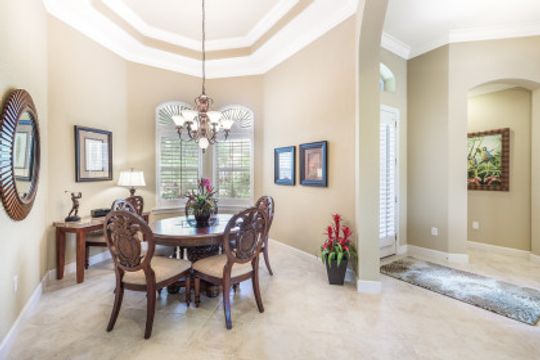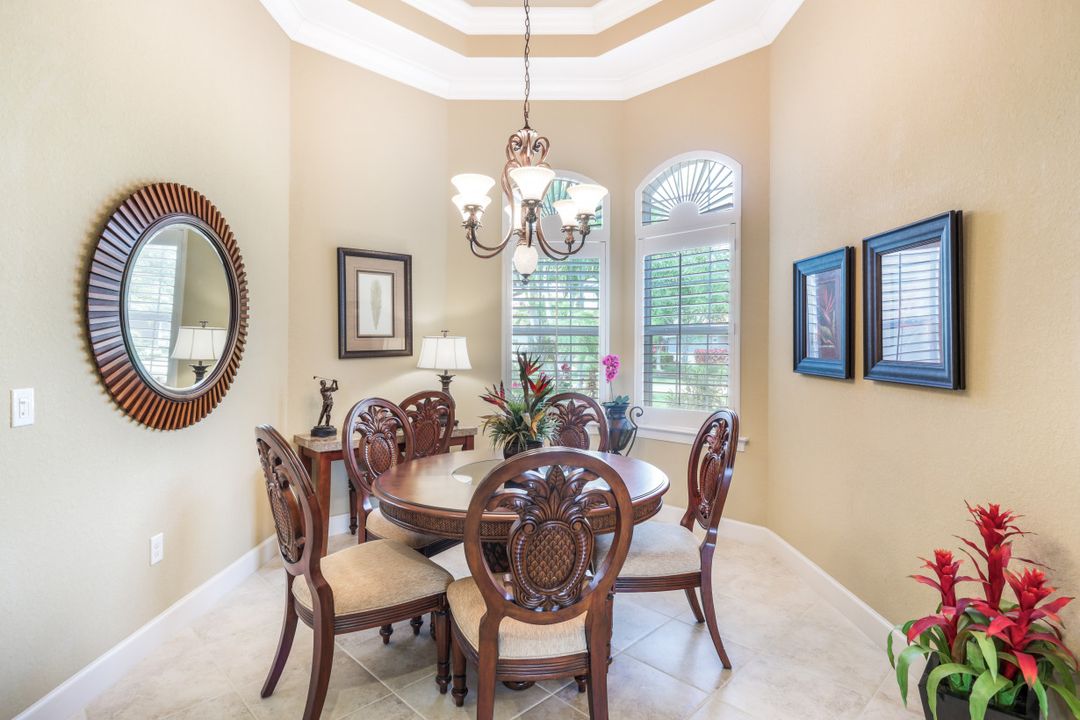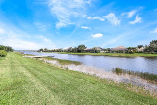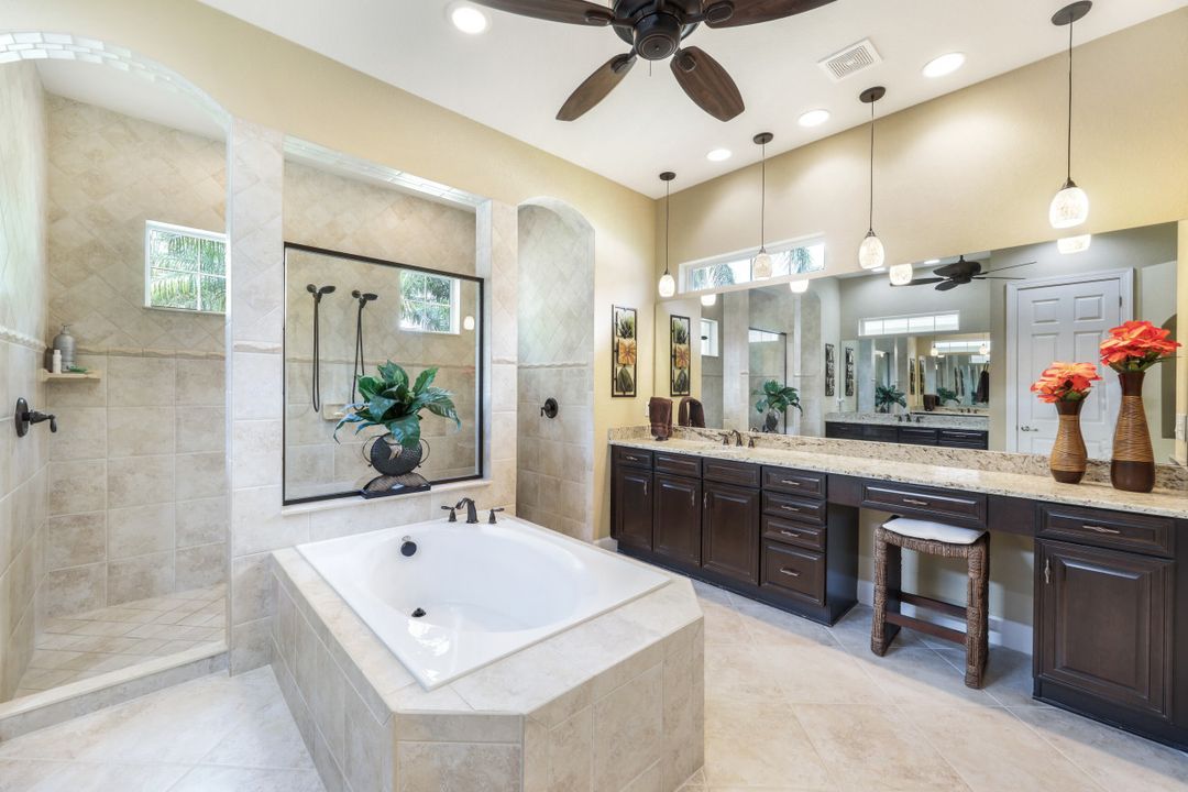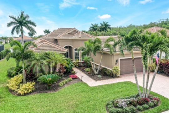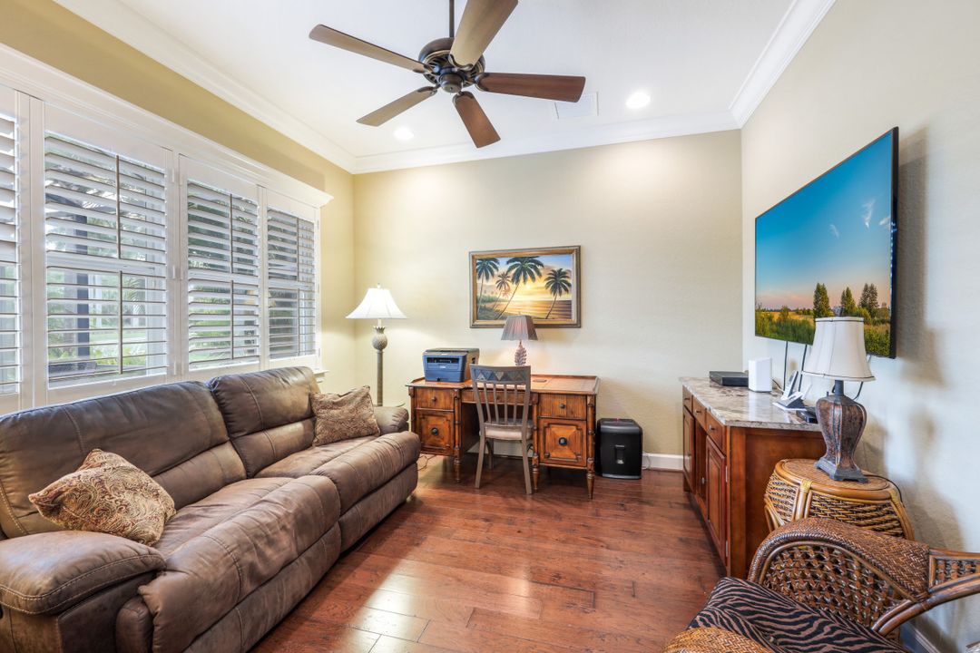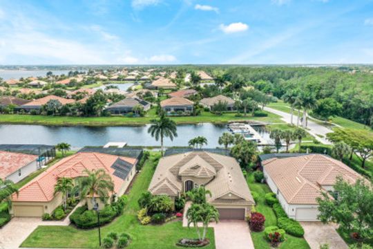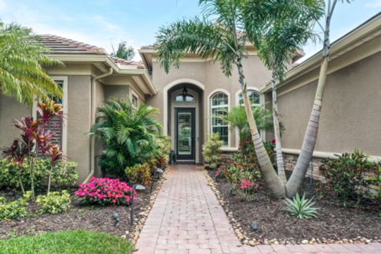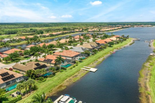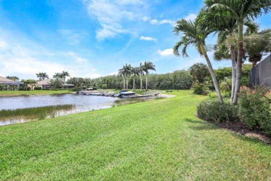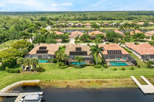 LAKE AND RESORT LIVING IN THE QUARRY! This FURNISHED LAKEFRONT PROPERTY features 3 bedrooms plus a den, two full baths, one half bath and an extended two car garage and has SOUTHERN EXPOSURE! Enjoy relaxing by the pool and spa on your lanai featuring a custom outdoor kitchen and large bar with an extended awning to provide ample shade while entertaining. Other fine appointments include tile in main living areas, luxury laminate in bedrooms, granite countertops, stainless steel appliances and an eat-in kitchen overlooking the pool/spa and lake. Newer AC in 2022 and Storm Smart shutters on the lanai. Also, not to be missed - a grand and EXPANSIVE MAIN BATHROOM featuring two separate shower heads and soaking tub. The Quarry is an amenity-rich gated, lakefront community offering over 500 acres of lakes for boating, water skiing, paddle boarding, jet skiing, kayaking and fishing. The NEWLY RENOVATED Beach Club includes Tennis, Pickleball, Bocce, a Tiki Bar, Restaurant, Poolside Food and Drink Service, a Wellness Center, and a full-time activities director. The Quarry Golf Lodge and Golf Club offers an 18 hole PGA Level Hurdzan-Frye Golf Course. GOLF MEMBERSHIP IS OPTIONAL.