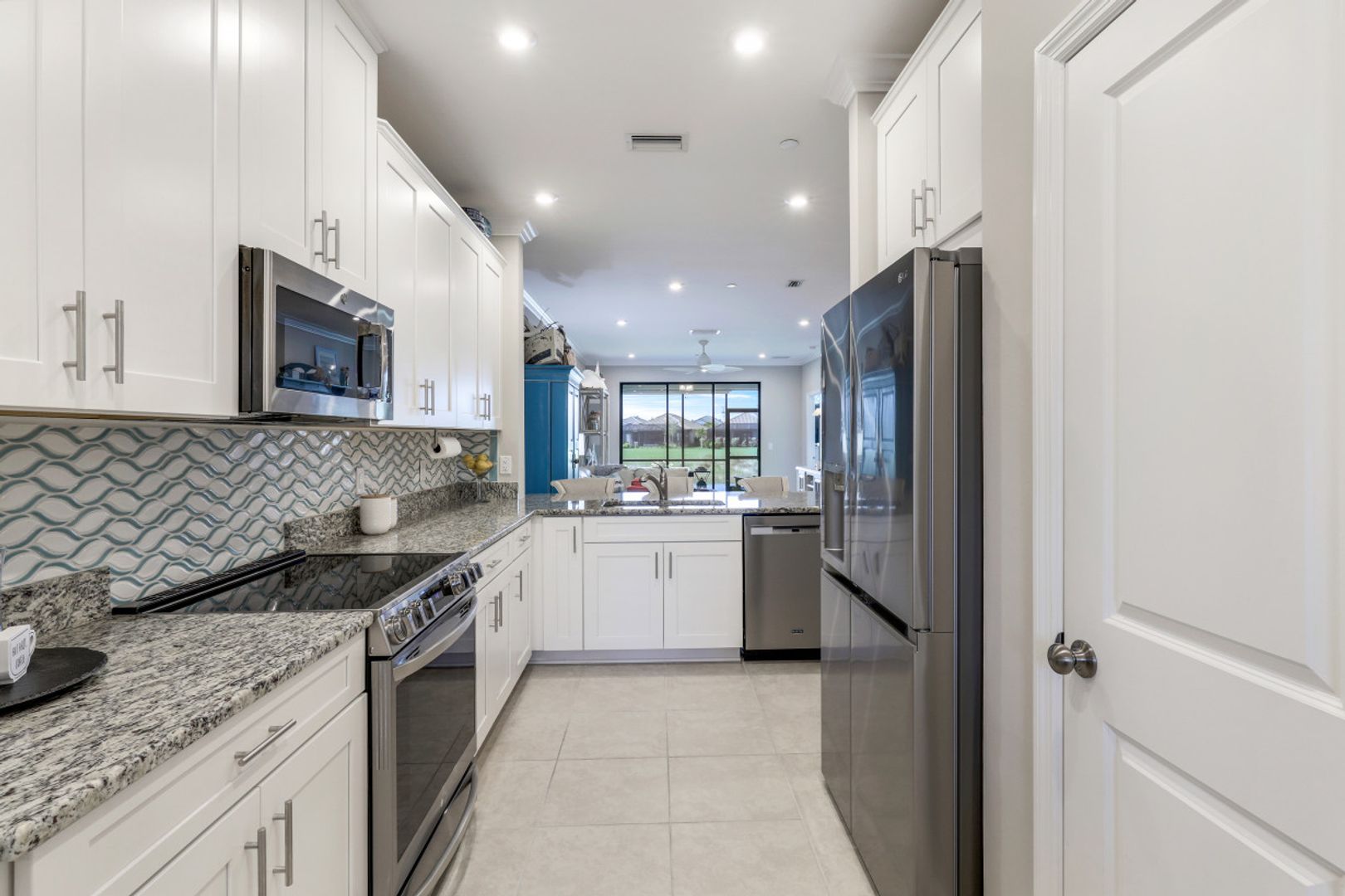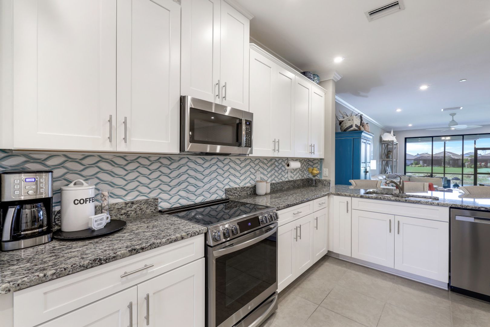 LIVE A VACATION LIFESTYLE IN ESPLANADE! Enjoy sunsets 365 days a year from this first floor 2+Den/2 Bath/1 car garage condo overlooking the lake & 16th fairway! A long list of upgrades: tile floors throughout the common areas and luxury laminate flooring in the bedrooms; crown molding throughout; white shaker style cabinets with granite countertops; extra built in cabinets in the kitchen, bath, and laundry room; upgraded kitchen backsplash; plantation shutters; special order lights & fans; SS appliances including backless stove & french door refrigerator; spacious laundry room; and more! This home comes with a CLUB/SPORTS MEMBERSHIP which gives you access to all amenities with the exception of in-season golf! Esplanade is a true "Lifestyle Community" with something for everyone: Resort Pool complete with cabanas; 6 tennis courts; 4 bocce balls courts; 4 pickleball courts; Koquina Day Spa offering hair, nail, facial, and spa treatments; Techno Gym with Aerobics Room; Gated Dog Park; Poolside Bahama Bar; 14 miles of bike/walking trails; 18 hole private golf course; 15,000 Sq Ft Culinary Center featuring restaurant, bars, wine tasting room, wine lockers, & Starbucks style cafe!