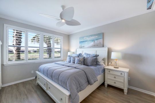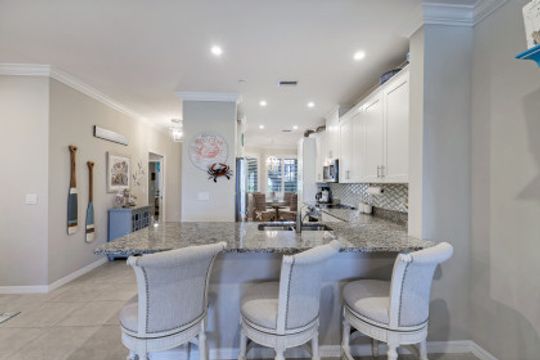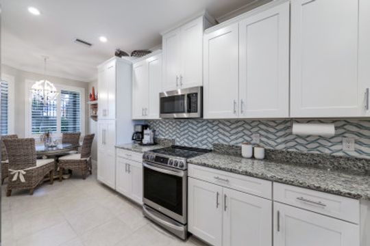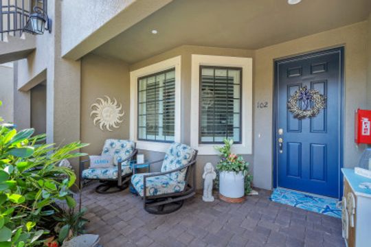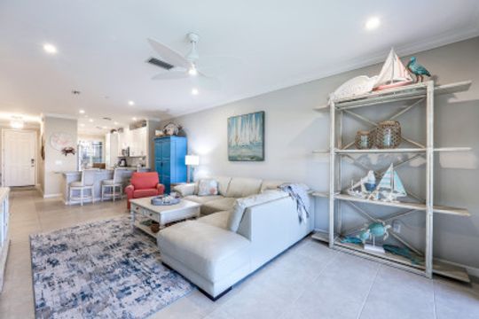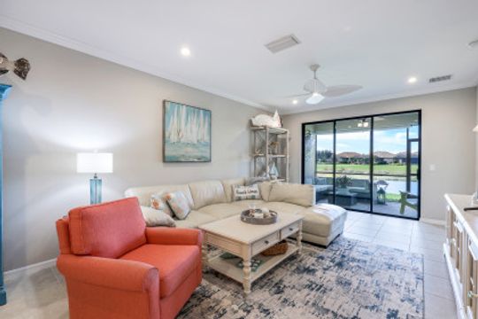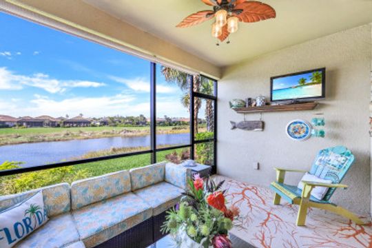 LIVE A VACATION LIFESTYLE IN ESPLANADE! Enjoy sunsets 365 days a year from this first floor 2+Den/2 Bath/1 car garage condo overlooking the lake & 16th fairway! A long list of upgrades: tile floors throughout the common areas and luxury laminate flooring in the bedrooms; crown molding throughout; white shaker style cabinets with granite countertops; extra built in cabinets in the kitchen, bath, and laundry room; upgraded kitchen backsplash; plantation shutters; special order lights & fans; SS appliances including backless stove & french door refrigerator; spacious laundry room; and more! This home comes with a CLUB/SPORTS MEMBERSHIP which gives you access to all amenities with the exception of in-season golf! Esplanade is a true "Lifestyle Community" with something for everyone: Resort Pool complete with cabanas; 6 tennis courts; 4 bocce balls courts; 4 pickleball courts; Koquina Day Spa offering hair, nail, facial, and spa treatments; Techno Gym with Aerobics Room; Gated Dog Park; Poolside Bahama Bar; 14 miles of bike/walking trails; 18 hole private golf course; 15,000 Sq Ft Culinary Center featuring restaurant, bars, wine tasting room, wine lockers, & Starbucks style cafe!