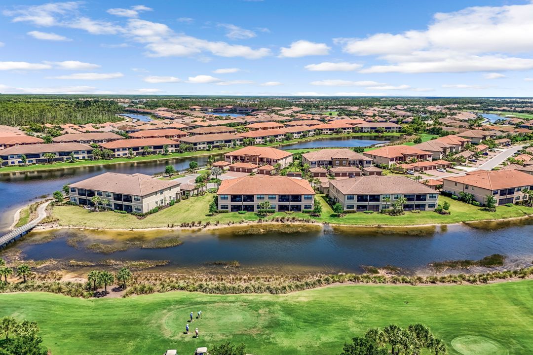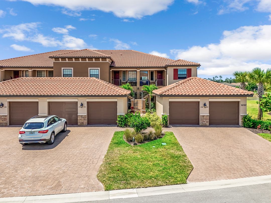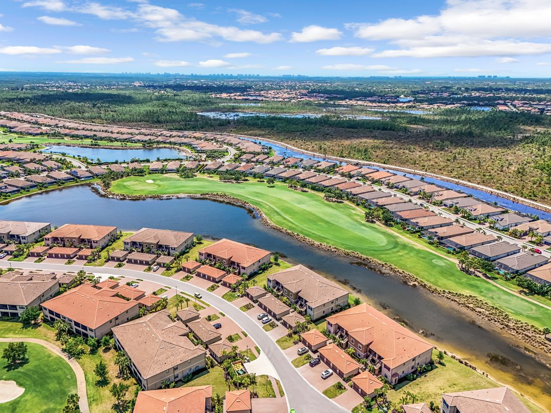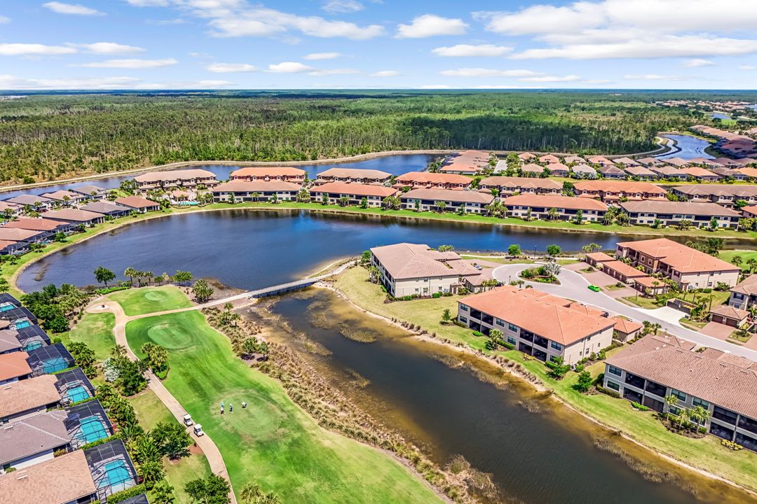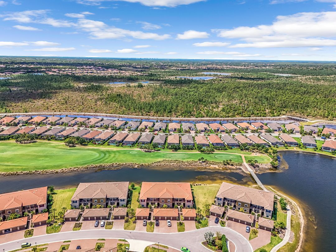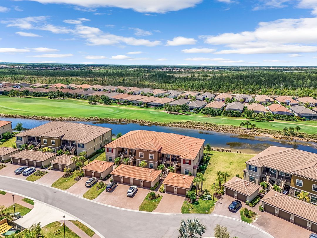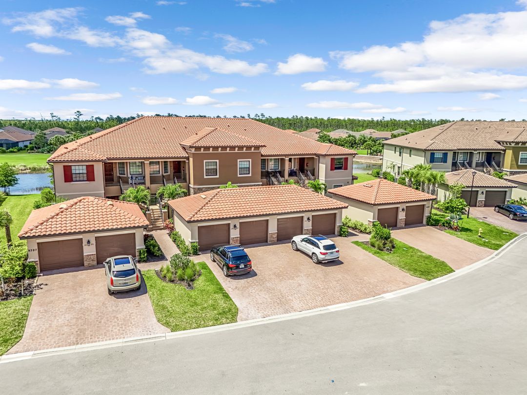 LIVE A VACATION LIFESTYLE IN ESPLANADE! This immaculate FIRST FLOOR END UNIT condo is situated at the end of a quiet cul-de-sac street with extra space between the neighboring building. From the moment you walk in the door you are greeted with a light and airy floorplan that leads you straight to the screened lanai overlooking the lake and golf course. Catch the Naples sunset 365 days a year from the lanai. There are 3 additional windows (Den & both bathrooms) compared to an interior unit. Notable features of this property include: tile floors throughout with carpeted bedrooms; crown molding throughout the living area/kitchen; white shaker style kitchen cabinets; GE stainless steel appliances; upgraded chandelier & fans; detached 1 car garage; and more! This property is being offered PARTLY FURNISHED. This property comes with a CLUB/SPORTS MEMBERSHIP which offers full access to all of Esplanade G&CC amenities including limited golf opportunities (2 day advanced tee times throughout the year). Esplanade is a true "Lifestyle Community" with something for everyone: resort pool complete with cabanas & poolside "Bahama Bar"; tennis; pickleball; bocce; Koquina Day Spa; fitness center; dog park; 14 miles of trails; 18 hole private golf course; restaurant, bar, wine tasting room, wine lockers, & Starbucks style cafe! Total monthly HOA/Club/Condo dues include water/sewer, building insurance, building maintenance, and access to all of Esplanade's resort style living amenities! Add this property and Esplanade Golf & Country Club of Naples to your list today!