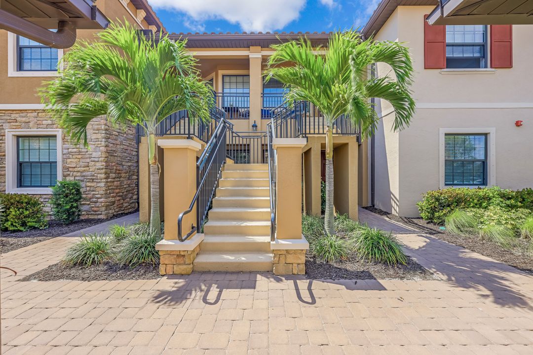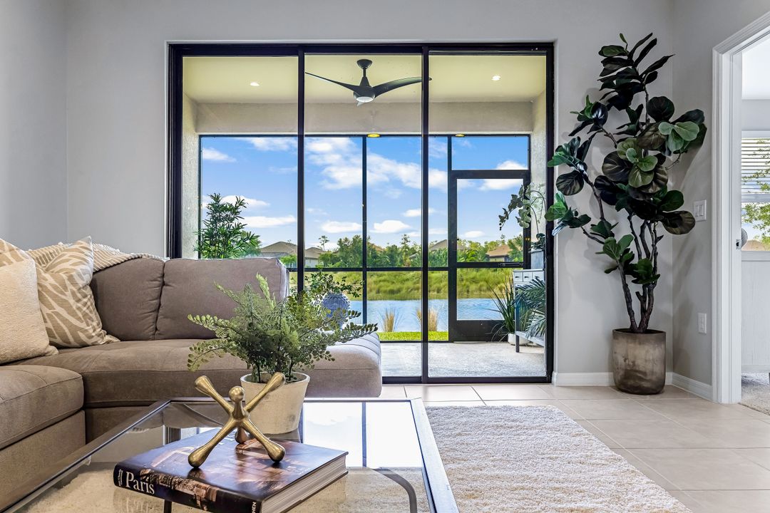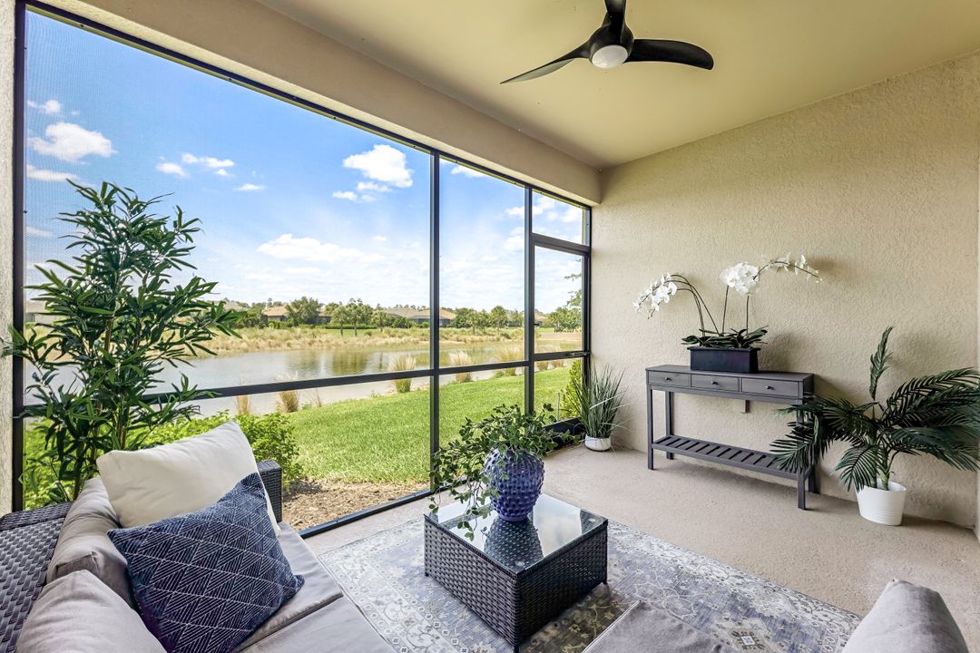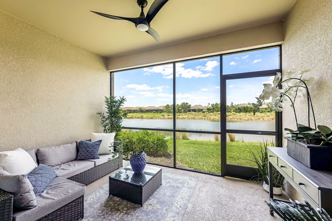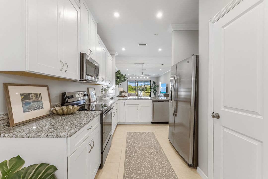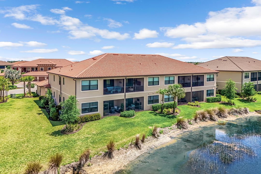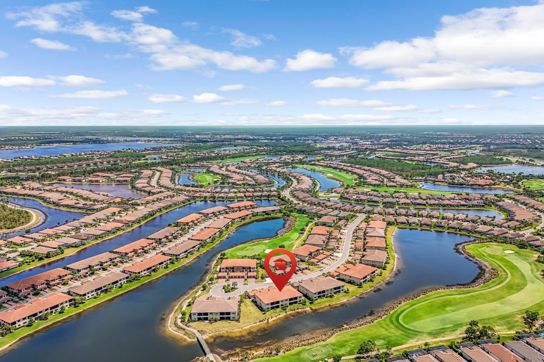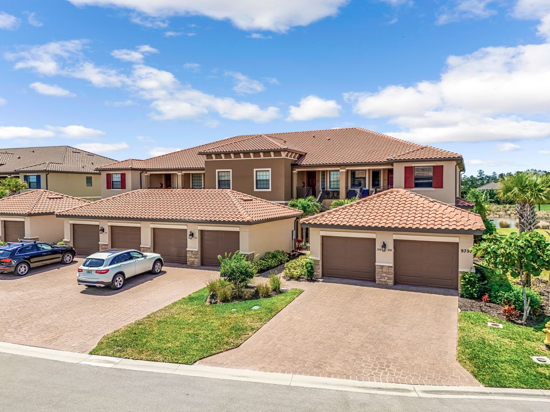 LIVE A VACATION LIFESTYLE IN ESPLANADE! This immaculate FIRST FLOOR END UNIT condo is situated at the end of a quiet cul-de-sac street with extra space between the neighboring building. From the moment you walk in the door you are greeted with a light and airy floorplan that leads you straight to the screened lanai overlooking the lake and golf course. Catch the Naples sunset 365 days a year from the lanai. There are 3 additional windows (Den & both bathrooms) compared to an interior unit. Notable features of this property include: tile floors throughout with carpeted bedrooms; crown molding throughout the living area/kitchen; white shaker style kitchen cabinets; GE stainless steel appliances; upgraded chandelier & fans; detached 1 car garage; and more! This property is being offered PARTLY FURNISHED. This property comes with a CLUB/SPORTS MEMBERSHIP which offers full access to all of Esplanade G&CC amenities including limited golf opportunities (2 day advanced tee times throughout the year). Esplanade is a true "Lifestyle Community" with something for everyone: resort pool complete with cabanas & poolside "Bahama Bar"; tennis; pickleball; bocce; Koquina Day Spa; fitness center; dog park; 14 miles of trails; 18 hole private golf course; restaurant, bar, wine tasting room, wine lockers, & Starbucks style cafe! Total monthly HOA/Club/Condo dues include water/sewer, building insurance, building maintenance, and access to all of Esplanade's resort style living amenities! Add this property and Esplanade Golf & Country Club of Naples to your list today!