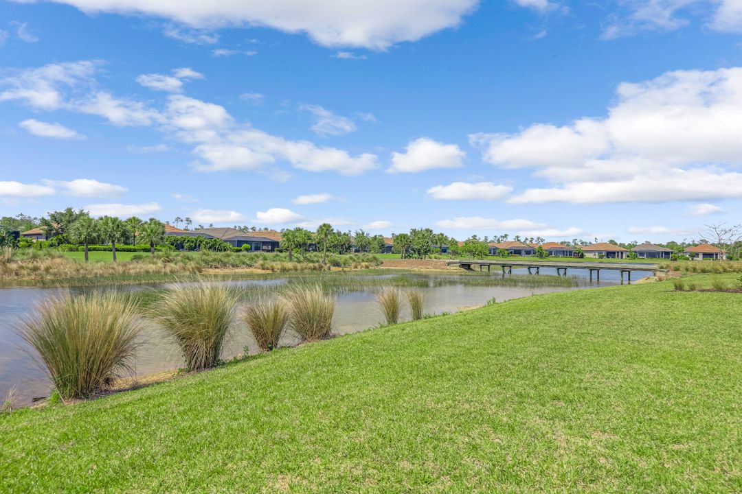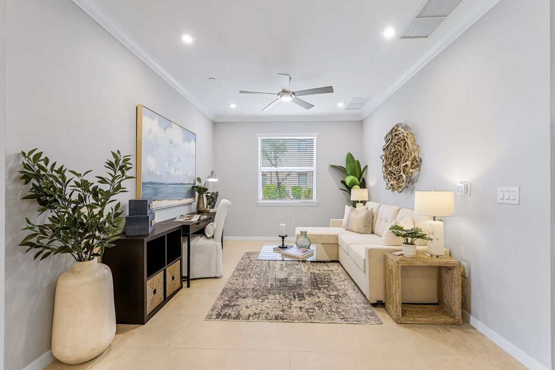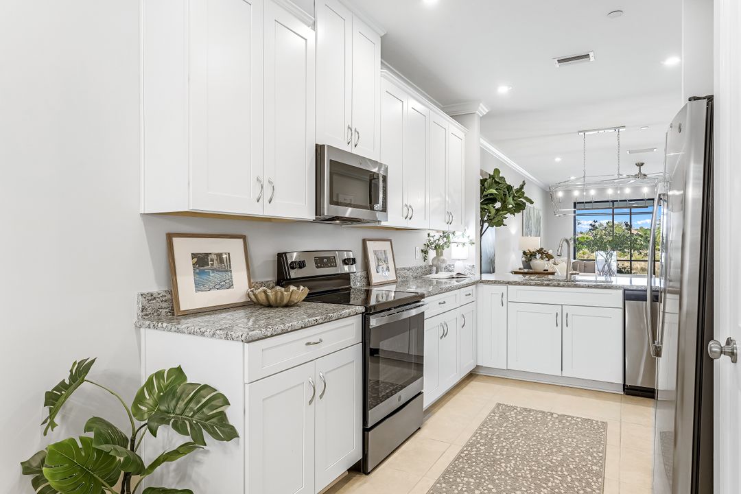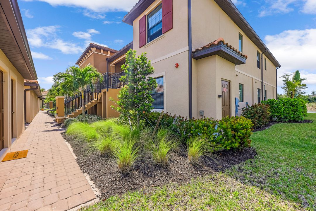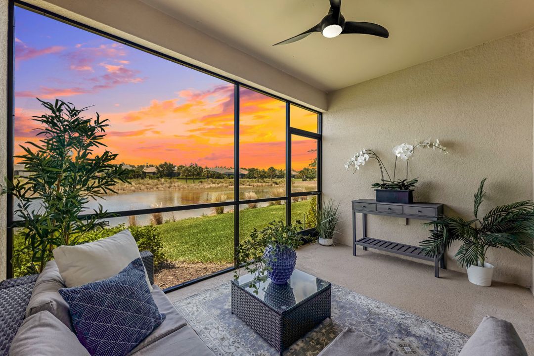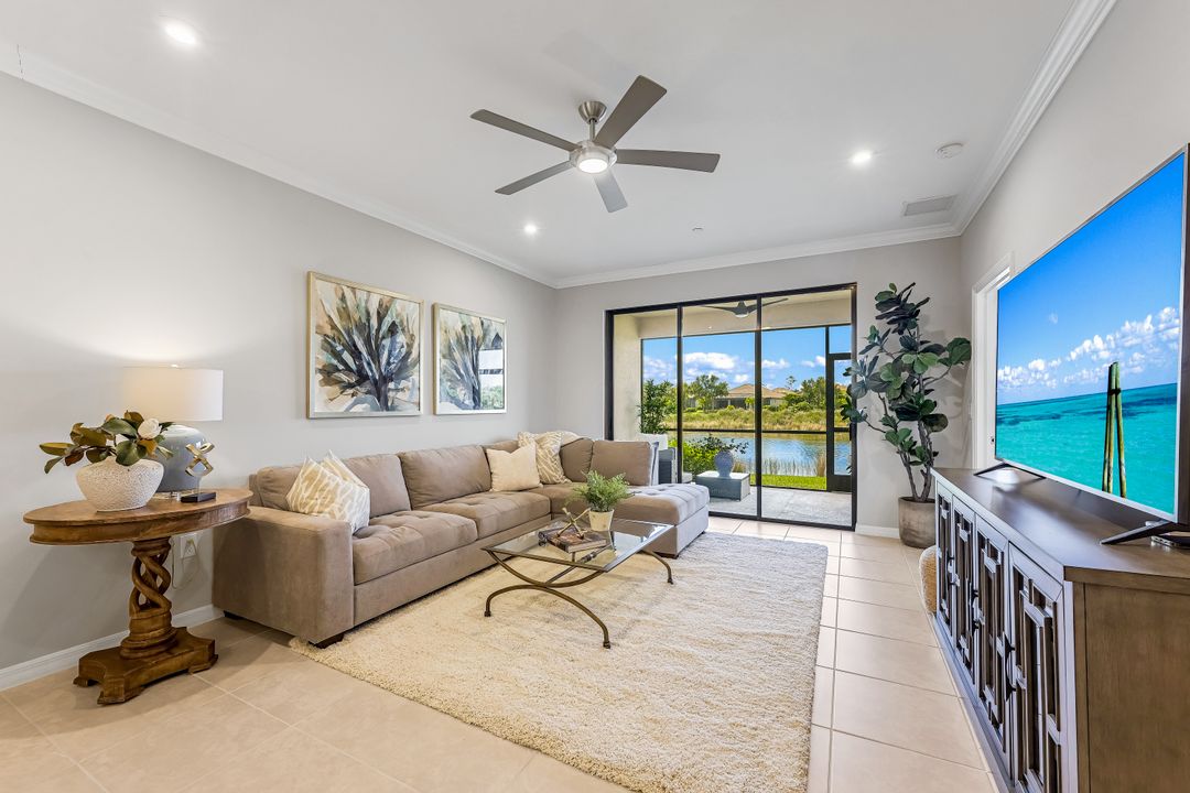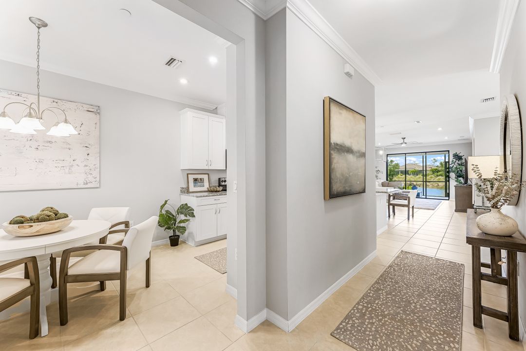 LIVE A VACATION LIFESTYLE IN ESPLANADE! This immaculate FIRST FLOOR END UNIT condo is situated at the end of a quiet cul-de-sac street with extra space between the neighboring building. From the moment you walk in the door you are greeted with a light and airy floorplan that leads you straight to the screened lanai overlooking the lake and golf course. Catch the Naples sunset 365 days a year from the lanai. There are 3 additional windows (Den & both bathrooms) compared to an interior unit. Notable features of this property include: tile floors throughout with carpeted bedrooms; crown molding throughout the living area/kitchen; white shaker style kitchen cabinets; GE stainless steel appliances; upgraded chandelier & fans; detached 1 car garage; and more! This property is being offered PARTLY FURNISHED. This property comes with a CLUB/SPORTS MEMBERSHIP which offers full access to all of Esplanade G&CC amenities including limited golf opportunities (2 day advanced tee times throughout the year). Esplanade is a true "Lifestyle Community" with something for everyone: resort pool complete with cabanas & poolside "Bahama Bar"; tennis; pickleball; bocce; Koquina Day Spa; fitness center; dog park; 14 miles of trails; 18 hole private golf course; restaurant, bar, wine tasting room, wine lockers, & Starbucks style cafe! Total monthly HOA/Club/Condo dues include water/sewer, building insurance, building maintenance, and access to all of Esplanade's resort style living amenities! Add this property and Esplanade Golf & Country Club of Naples to your list today!