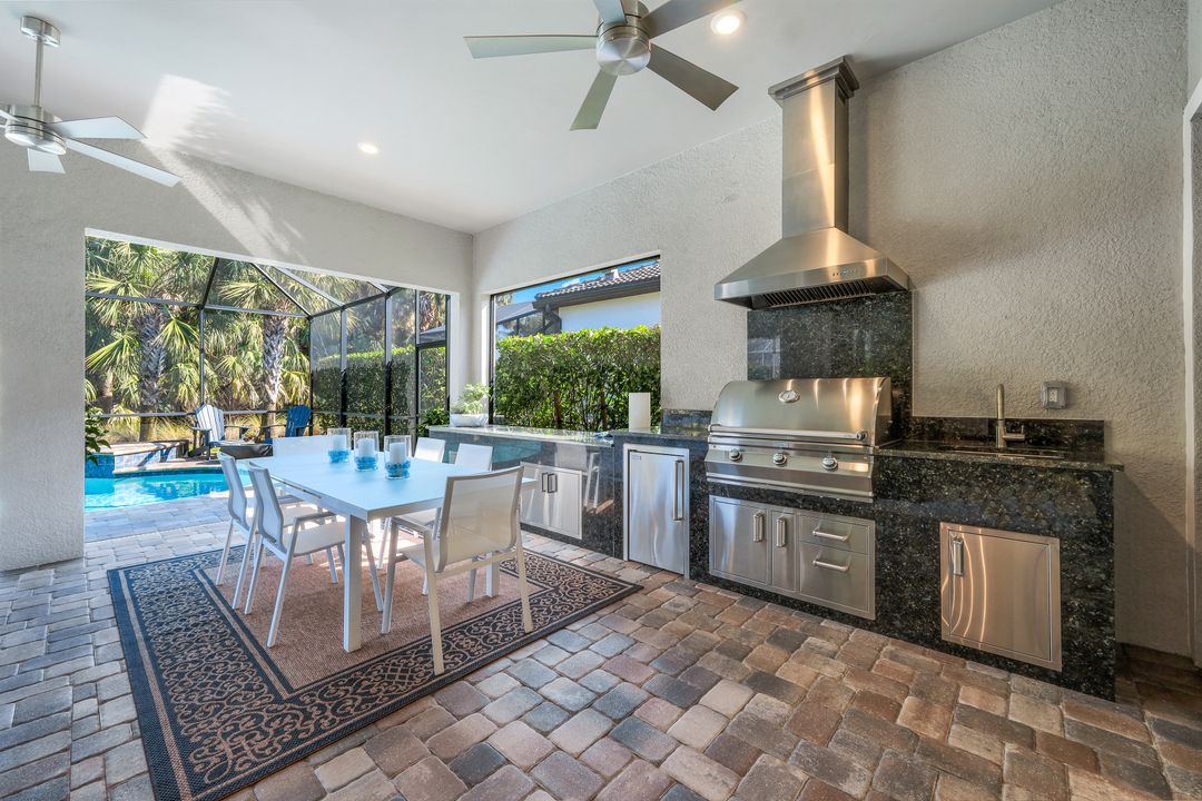 Pool – Impact Resistant Windows & Doors – Tile & Wood Floors (No Carpet, No Vinyl) – Whole House Generator – Outdoor Kitchen – Water Treatment System – and More. Designed for seamless indoor-outdoor living, the open-concept layout features a coffered ceiling and zero-corner sliders that fully open to a sprawling screened lanai. The outdoor space is a private oasis with a heated pool and water feature, custom outdoor kitchen, dining and lounging areas, and a fire pit—perfect for entertaining or relaxing year-round. Inside, enjoy a gourmet kitchen with upgraded appliances, abundant cabinetry, and generous quartz countertops, along with a tranquil primary suite boasting wood floors, tray ceiling, a custom walk-in closet, and a spa-style bath. Two guest bedrooms, a sizable den, and a well-equipped laundry room add comfort and convenience. Premium upgrades, designer features, and two-car garage with epoxy floor and built-in storage. Resort-style amenities. Low HOA fees. No CDD. Exceptional value—don’t miss this luxurious, move-in-ready home in Greyhawk at Golf Club of the Everglades, one of Naples’ most prestigious gated communities.
