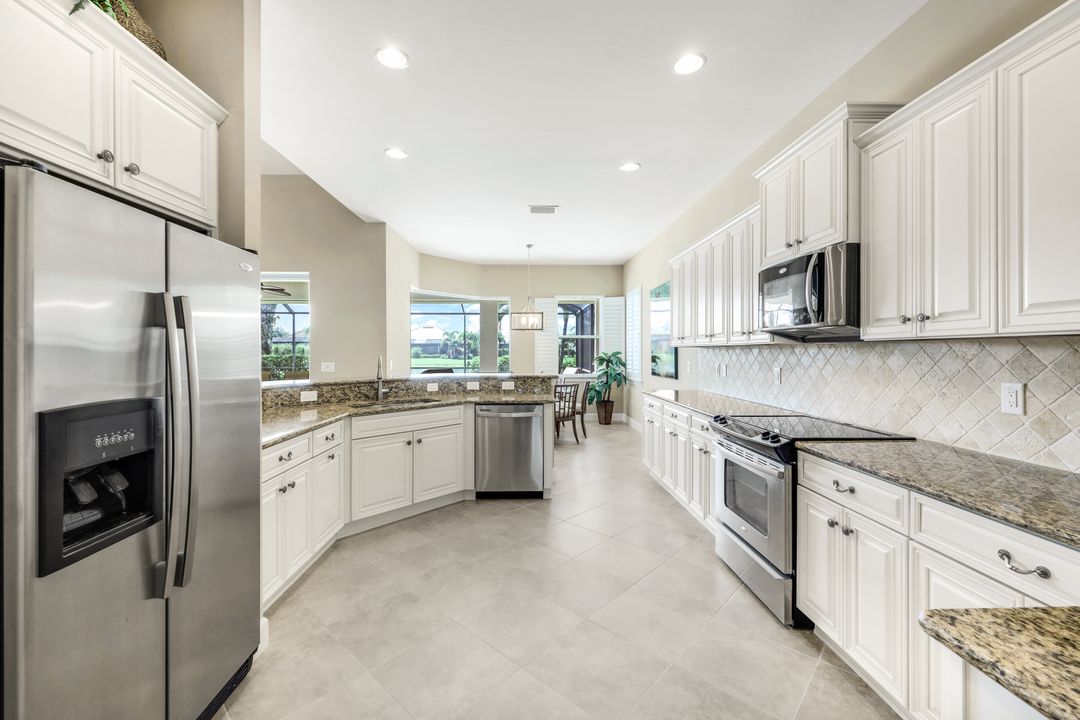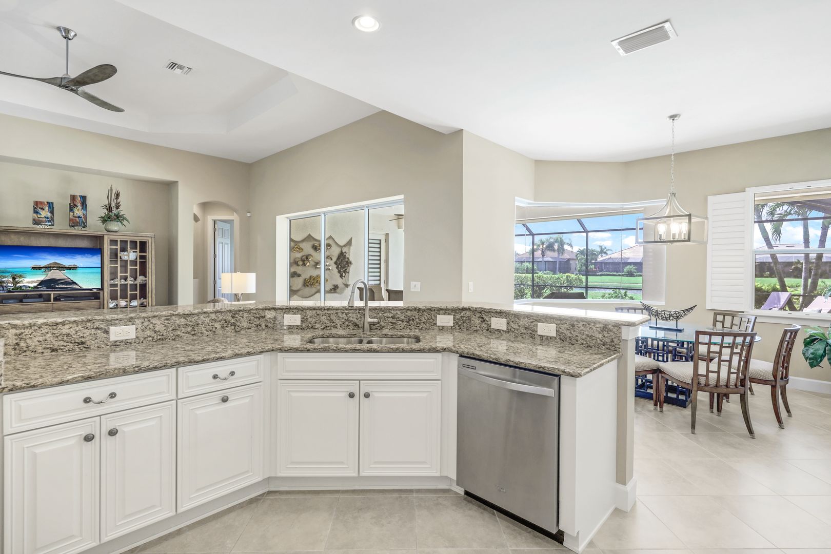 Live the Vacation Lifestyle in a Country Club Setting! This pristine 2-bedroom, 2-bath home with a den (perfect for a 3rd bedroom) offers southern exposure and direct lake access, nestled on a quiet cul-de-sac. With 2,153 square feet of living space under air, this residence is filled with fine details, including diagonal tile, tray ceilings, white cabinets, and stainless steel appliances. Enjoy the convenience of plantation shutters throughout, Storm Smart shutters on the lanai, and solar panels for the pool. Plus, a new AC system was installed in 2023! The Quarry is an amenity-rich, gated lakefront community boasting over 500 acres of lakes ideal for boating, water skiing, paddleboarding, jet skiing, kayaking, and fishing. The newly renovated Beach Club features tennis, pickleball, bocce ball, a Tiki bar, a restaurant, poolside food and drink service, a wellness center, and a full-time activities director to keep you engaged.