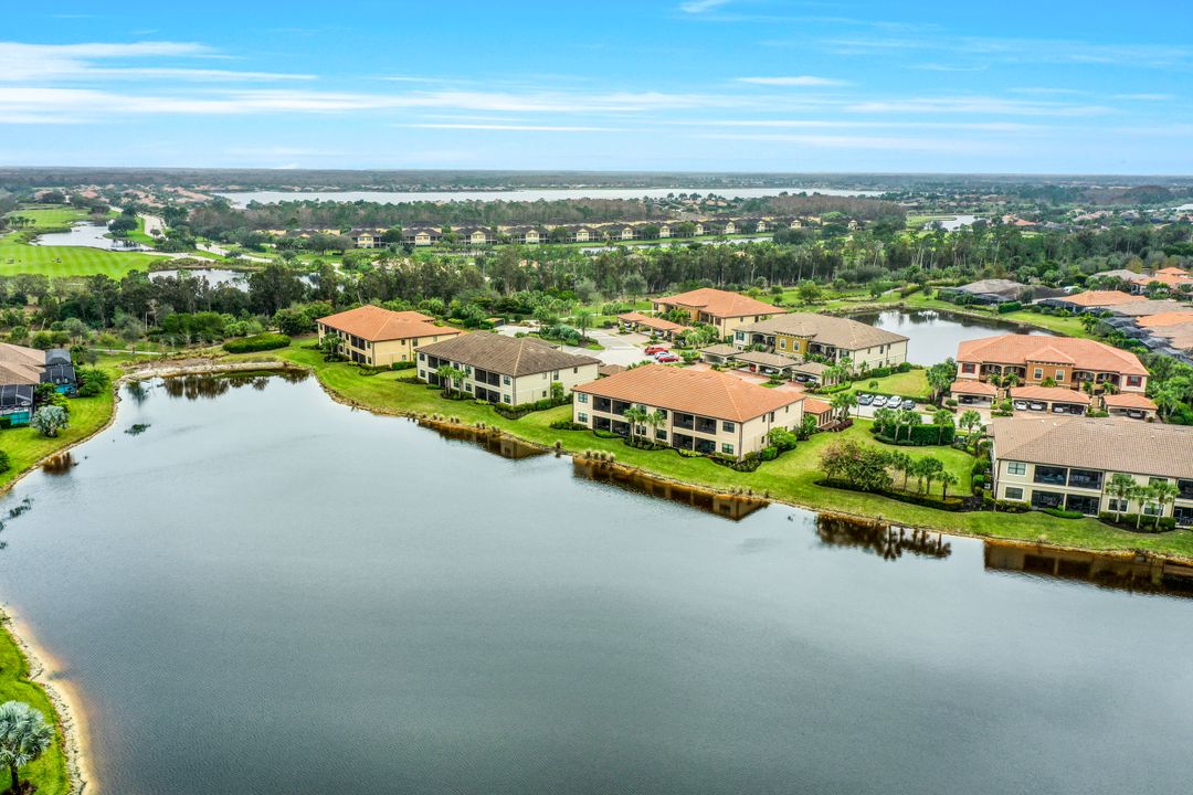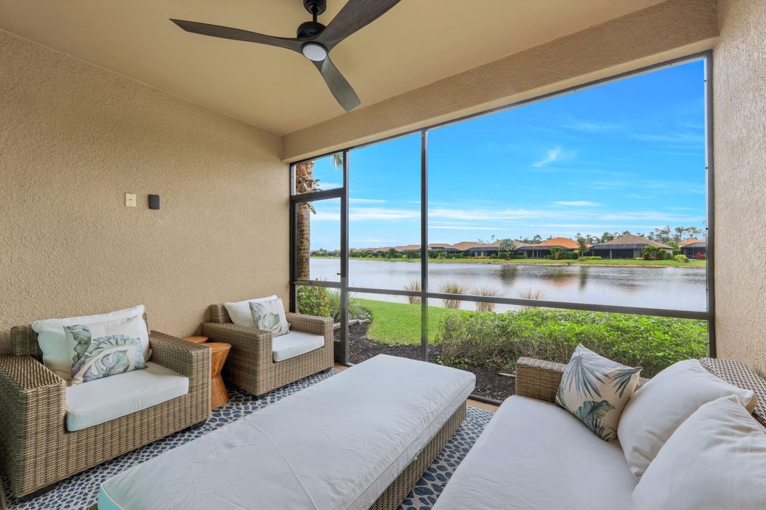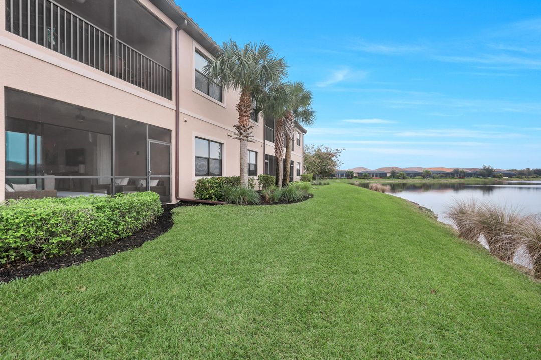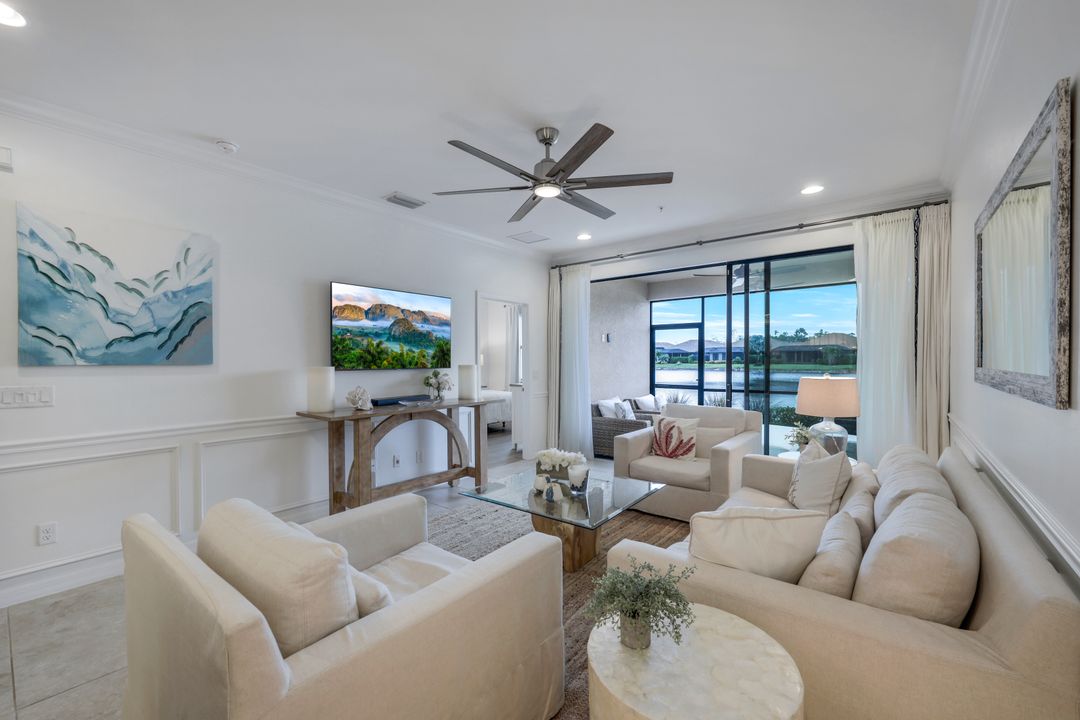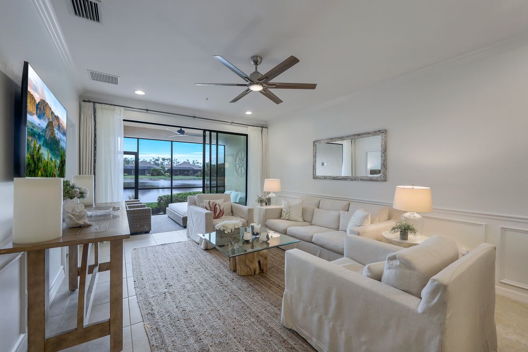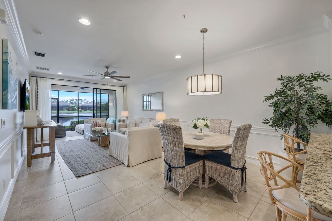 Live like you're on vacation every day at Esplanade Golf & CC. Welcome to this perfect, maintenance-free, 1st floor retreat that offers a fun-filled resort lifestyle combined with fresh coastal style. This open & airy home greets you with a sparkling lake view which can also be enjoyed from the screened lanai. There is plenty of space in the main great room/dining room for guests to mingle. The kitchen features upgraded 42” cabinetry, granite counters, stainless appliances & dining nook. Take in the lake view from the primary suite which includes 2 walk-in closets & ensuite bath. A pocket door to closes off the guest bed & bath for privacy & glass French doors close off the den. The high ceilings are set off with crown molding & the walls with wainscoting. Main living areas are tiled & new LVP added to the bedrooms. New white paint, ceiling fans & designer lighting polish off this beautiful home. This incredible property includes social membership to Esplanade where residents enjoy a 15,000 sq. ft. clubhouse, resort pool, lap pool, wellness center, salon & spa, tennis & pickleball courts, bocce, dog park, and multiple dining options including tiki bar & grill with poolside service.