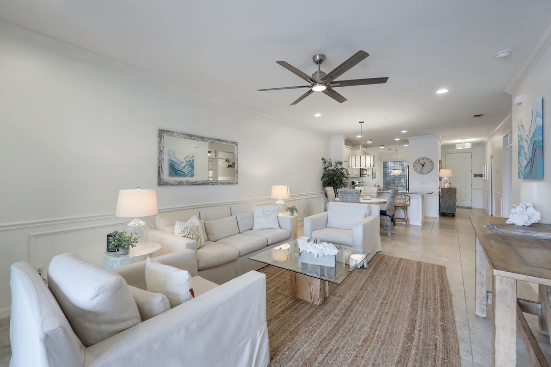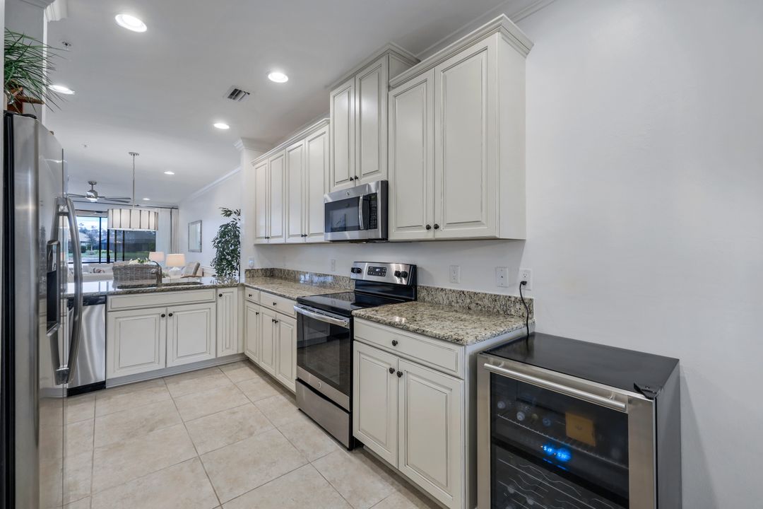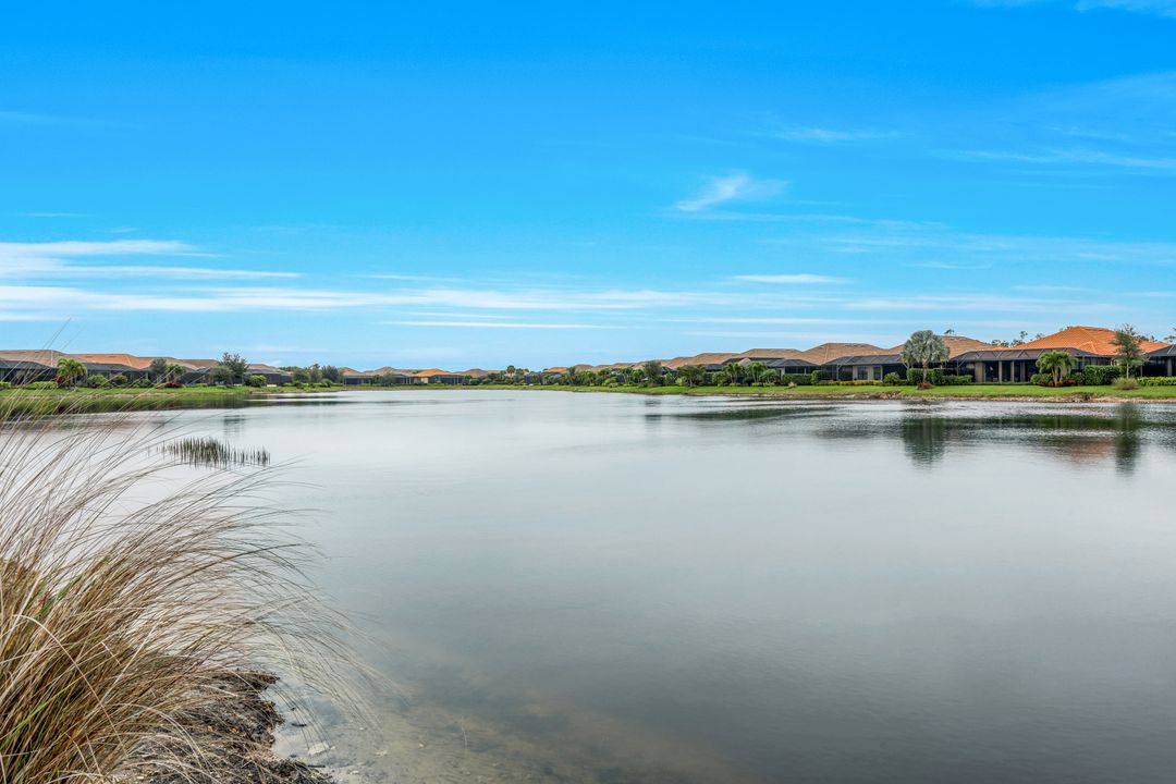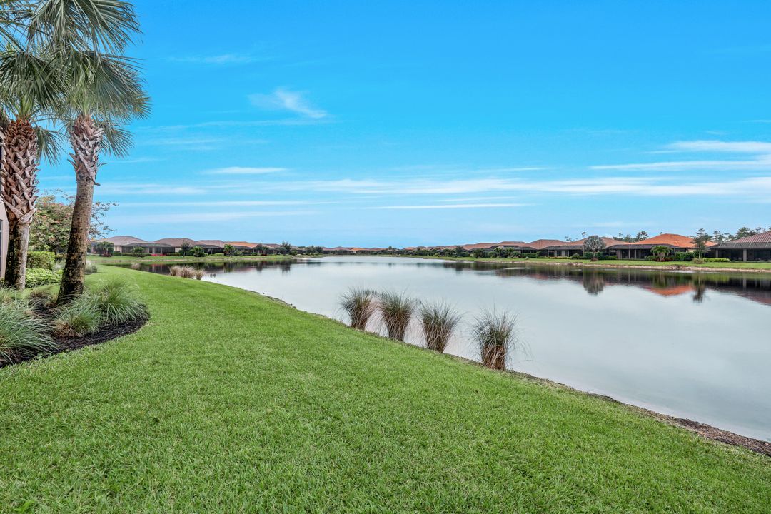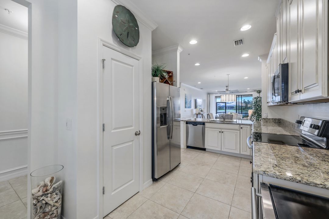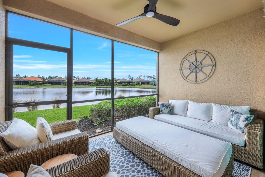 Live like you're on vacation every day at Esplanade Golf & CC. Welcome to this perfect, maintenance-free, 1st floor retreat that offers a fun-filled resort lifestyle combined with fresh coastal style. This open & airy home greets you with a sparkling lake view which can also be enjoyed from the screened lanai. There is plenty of space in the main great room/dining room for guests to mingle. The kitchen features upgraded 42” cabinetry, granite counters, stainless appliances & dining nook. Take in the lake view from the primary suite which includes 2 walk-in closets & ensuite bath. A pocket door to closes off the guest bed & bath for privacy & glass French doors close off the den. The high ceilings are set off with crown molding & the walls with wainscoting. Main living areas are tiled & new LVP added to the bedrooms. New white paint, ceiling fans & designer lighting polish off this beautiful home. This incredible property includes social membership to Esplanade where residents enjoy a 15,000 sq. ft. clubhouse, resort pool, lap pool, wellness center, salon & spa, tennis & pickleball courts, bocce, dog park, and multiple dining options including tiki bar & grill with poolside service.