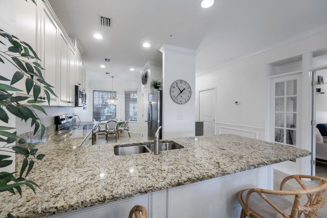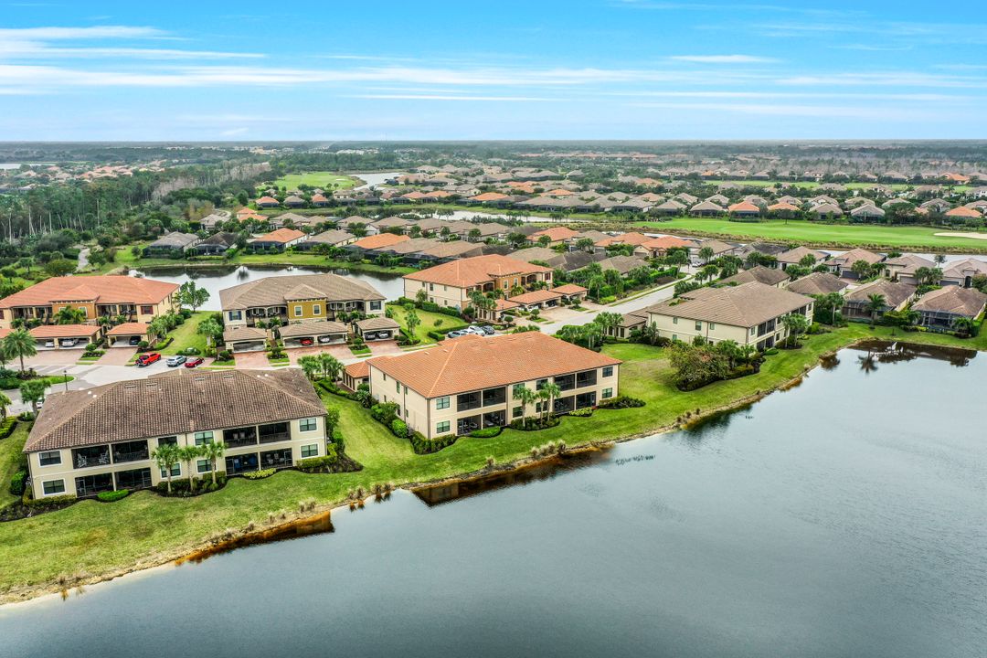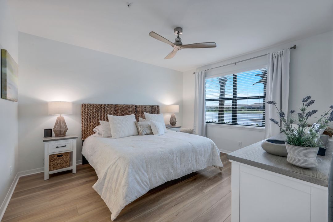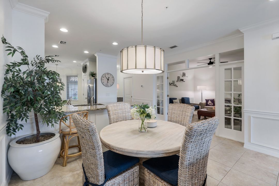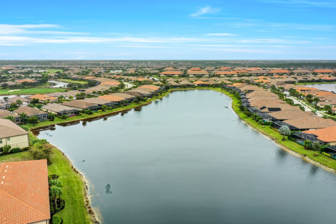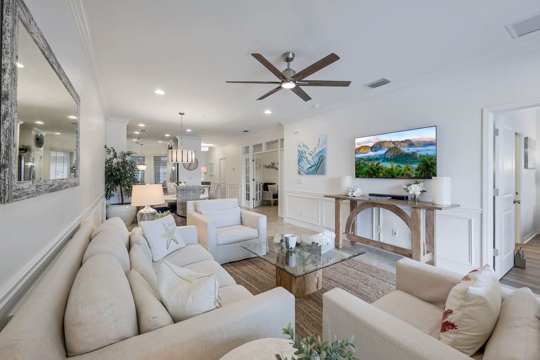 Live like you're on vacation every day at Esplanade Golf & CC. Welcome to this perfect, maintenance-free, 1st floor retreat that offers a fun-filled resort lifestyle combined with fresh coastal style. This open & airy home greets you with a sparkling lake view which can also be enjoyed from the screened lanai. There is plenty of space in the main great room/dining room for guests to mingle. The kitchen features upgraded 42” cabinetry, granite counters, stainless appliances & dining nook. Take in the lake view from the primary suite which includes 2 walk-in closets & ensuite bath. A pocket door to closes off the guest bed & bath for privacy & glass French doors close off the den. The high ceilings are set off with crown molding & the walls with wainscoting. Main living areas are tiled & new LVP added to the bedrooms. New white paint, ceiling fans & designer lighting polish off this beautiful home. This incredible property includes social membership to Esplanade where residents enjoy a 15,000 sq. ft. clubhouse, resort pool, lap pool, wellness center, salon & spa, tennis & pickleball courts, bocce, dog park, and multiple dining options including tiki bar & grill with poolside service.