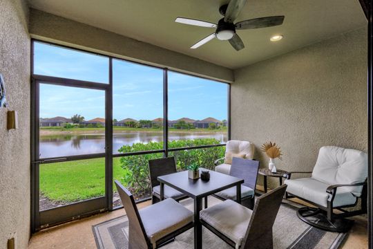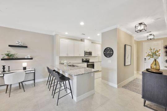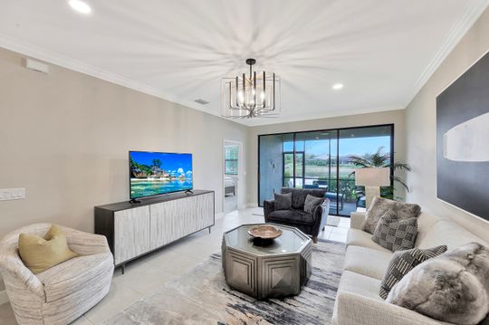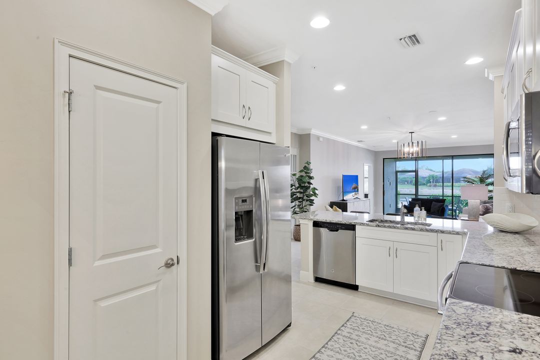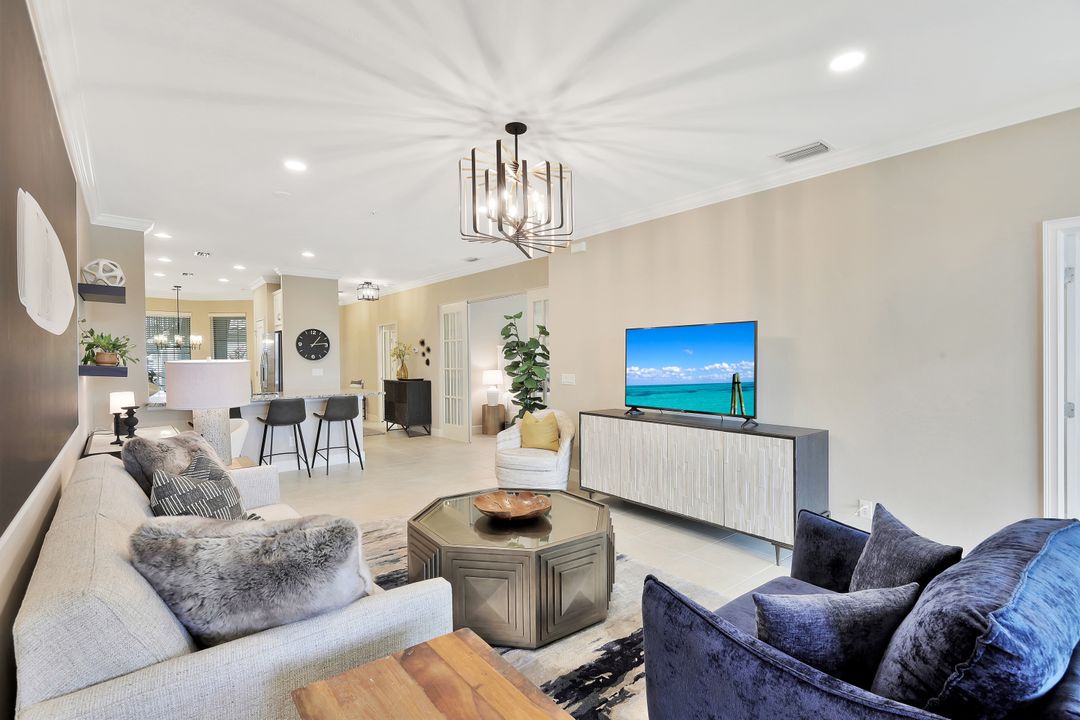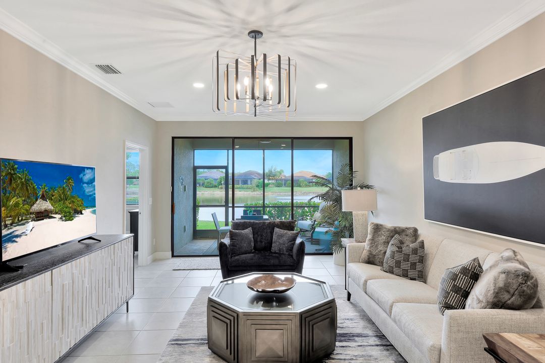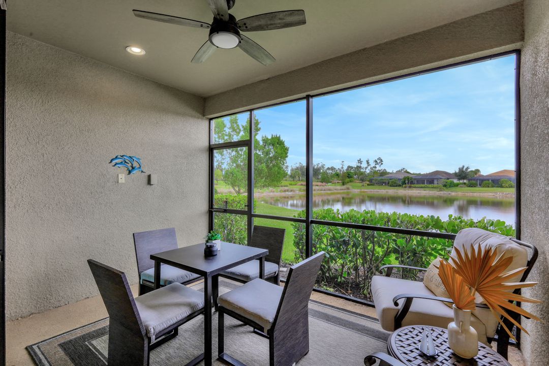 LIVE A VACATION LIFESTYLE IN ESPLANADE! This immaculate FURNISHED 2+Den/2 Bath FIRST FLOOR END UNIT condo is situated overlooking a tranquil lake on a quiet cul-de-sac street. Southern exposure and additional side windows make this condo light & bright 365 days a year! A long list of special features include: tile floors throughout the common areas and new sculpted carpet in the bedrooms; upgraded lights & fans; crown molding; white shaker cabinets; enclosed den with glass pocket doors; covered parking spot & storage closet; and more! This condo is being offered furnished which includes a long list of high end furniture & decor. This property comes with a SOCIAL/SPORTS MEMBERSHIP (ability to play golf with 2 day tee times throughout the year)! Esplanade is a true "Lifestyle Community" with something for everyone: resort pool complete with cabanas & poolside "Bahama Bar"; tennis; pickleball; bocce; Koquina Day Spa; fitness center; dog park; 14 miles of trails; 18 hole private golf course; restaurant, bar, wine tasting room, wine lockers, & Starbucks style cafe!