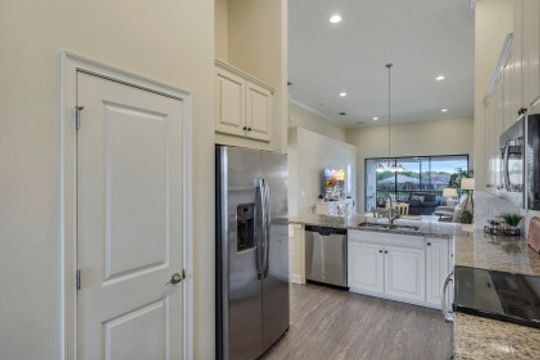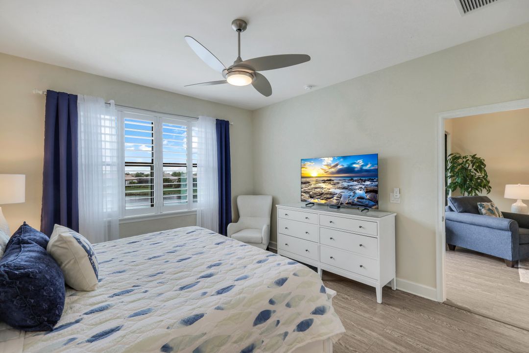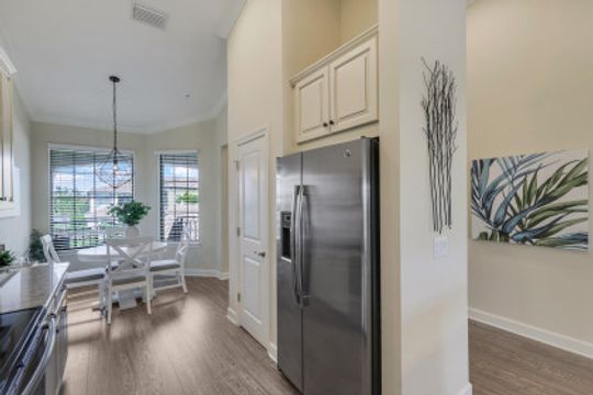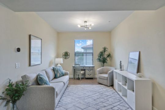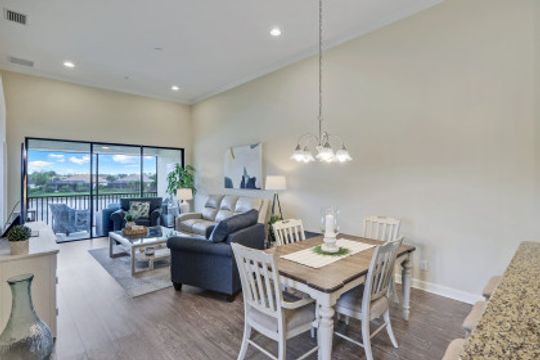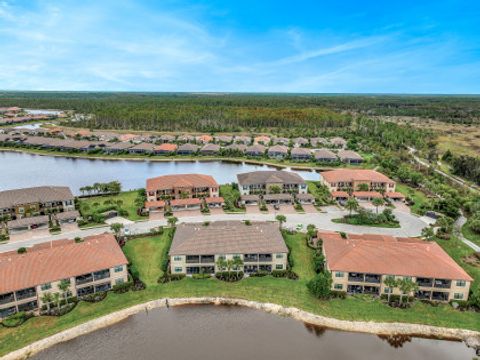 LIVE A VACATION LIFESTYLE IN ESPLANADE! This immaculate and tastefully FURNISHED 2+Den/2 Bath SECOND FLOOR END UNIT condo is situated overlooking a tranquil lake on a quiet cul-de-sac street. Southern exposure and additional side windows make this condo light & bright 365 days a year! A long list of special features include: 14' volume ceilings throughout the common areas; luxury laminate wood floors throughout & tiled baths (no carpet anywhere); upgraded lights & fans; crown molding; raised panel cabinets; plantation shutters; covered parking spot & storage closet; and more! This condo is being offered furnished which includes a long list of furniture & decor. This property comes with a CLUB/SPORTS MEMBERSHIP with limited golf opportunities with 2 day advanced tee times throughout the year. Esplanade is a true "Lifestyle Community" with something for everyone: resort pool complete with cabanas & poolside "Bahama Bar"; tennis; pickleball; bocce; Koquina Day Spa; fitness center; dog park; 14 miles of trails; 18 hole private golf course; restaurant, bar, wine tasting room, wine lockers, & Starbucks style cafe! Add this property and Esplanade Golf & Country Club of Naples to your list today!