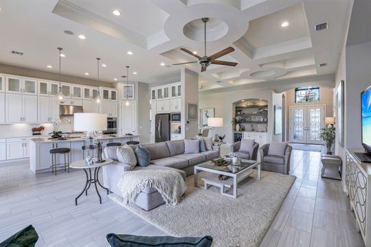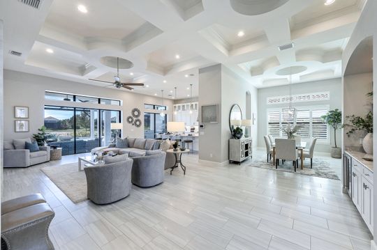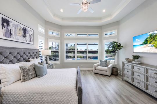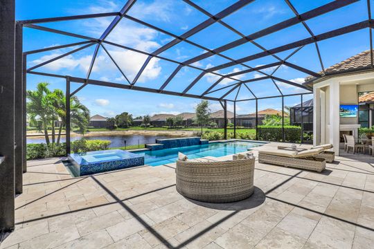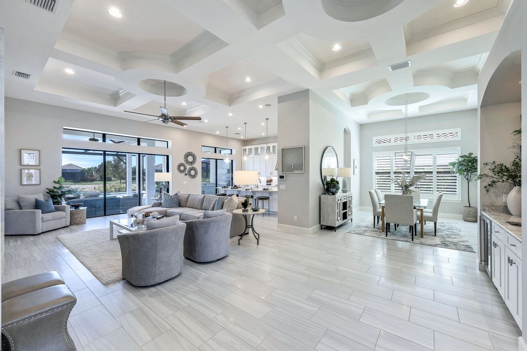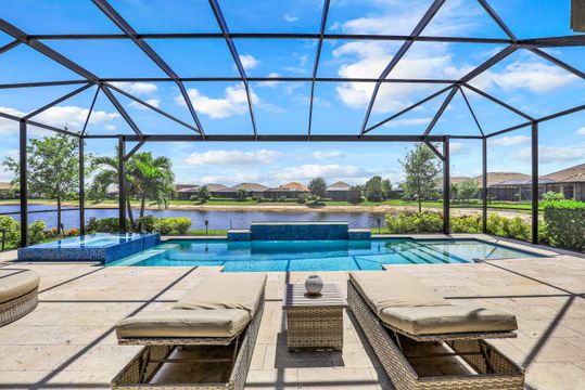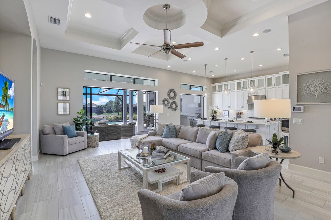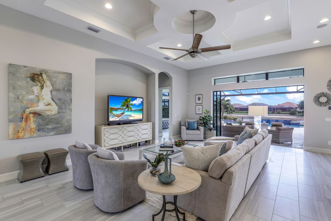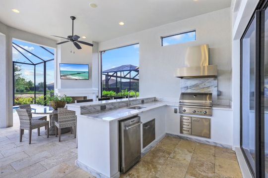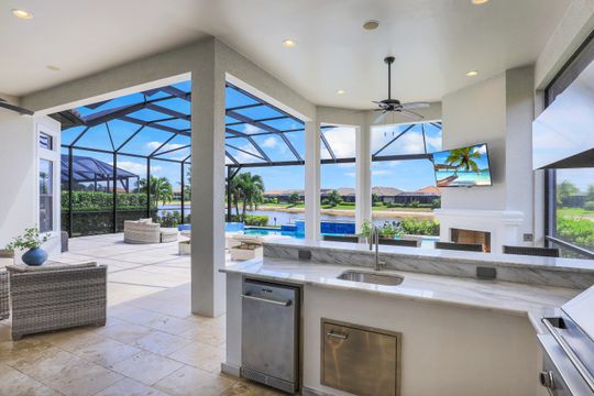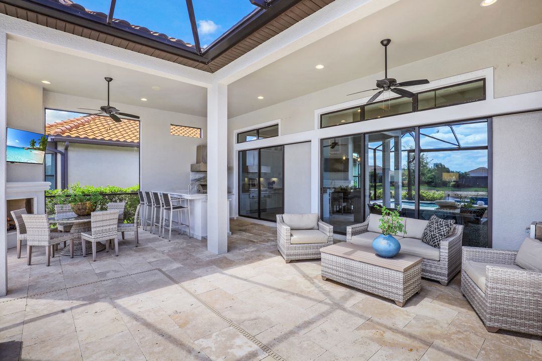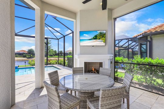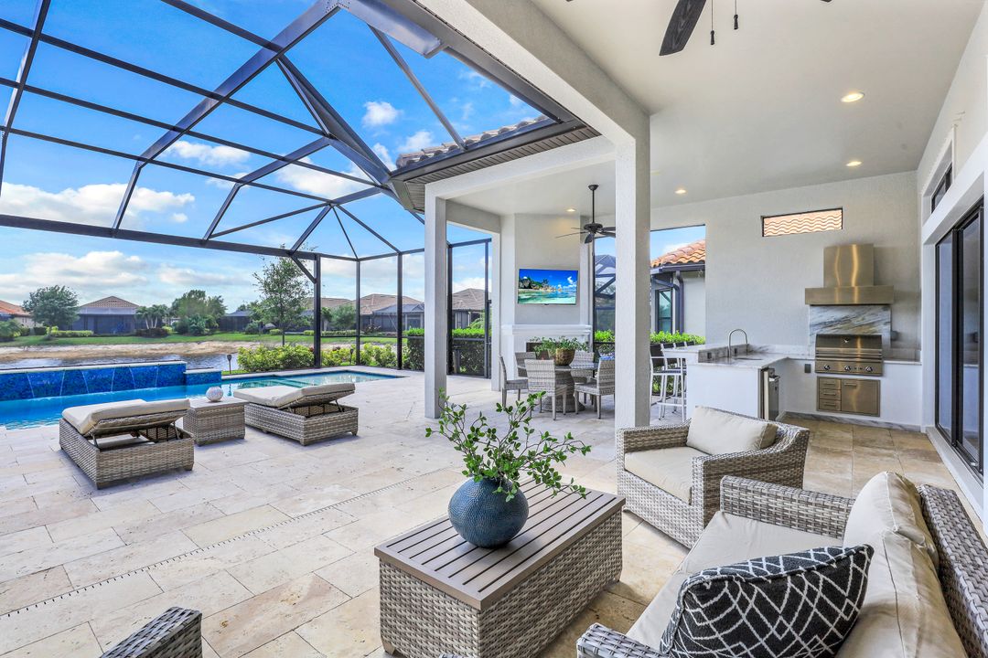 Step inside this FULL GOLF MEMBERSHIP INCLUDED "Francesco" (3+Den/3.5BA) and be greeted with 12' ceilings throughout, impressive coffered ceiling details, and spacious kitchen complete with GAS cooktop, double wall ovens, double stack cabinets, and quartz countertops. Two sets of sliding glass doors lead you to the extended covered lanai and pool deck with a massive GAS heated salt water pool/spa/sunshelf, outdoor kitchen, & GAS fireplace all overlooking the lake! Other features include: SOUTHERN EXPOSURE; fresh exterior paint; new plantation shutters (being installed mid April); Level VII tile; new solid flooring in the bedrooms. Esplanade is a true "Lifestyle Community" with something for everyone: Resort Pool complete with cabanas and beach entrance; 6 tennis courts; 4 bocce balls courts; 4 pickleball courts; Koquina Day Spa offering hair, nail, facial, and spa treatments; Techno Gym with Aerobics Room; Gated Dog Park; Poolside Bahama Bar; 14 miles of bike/walking trails; 18 hole private golf course (Can use your own cart); 15,000 Sq Ft Culinary Center featuring restaurant, bars, wine tasting room, wine lockers, & Starbucks style cafe! Total dues just $2,932/qtr including GOLF!