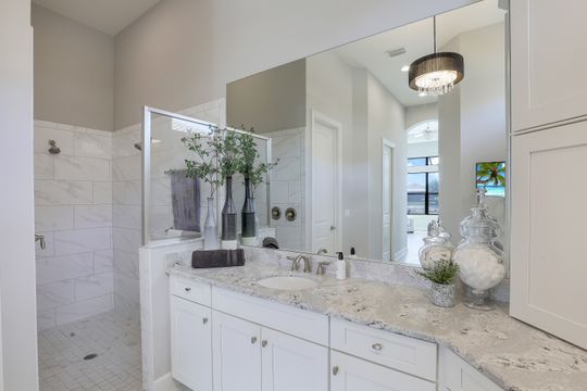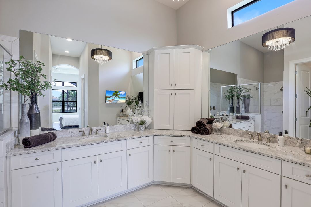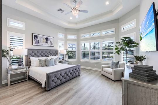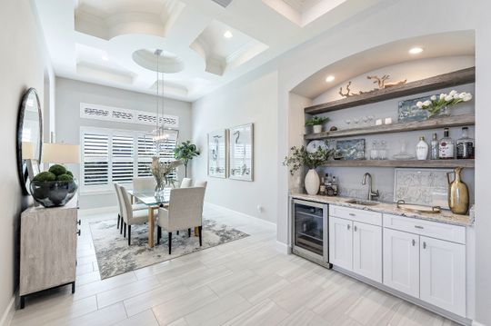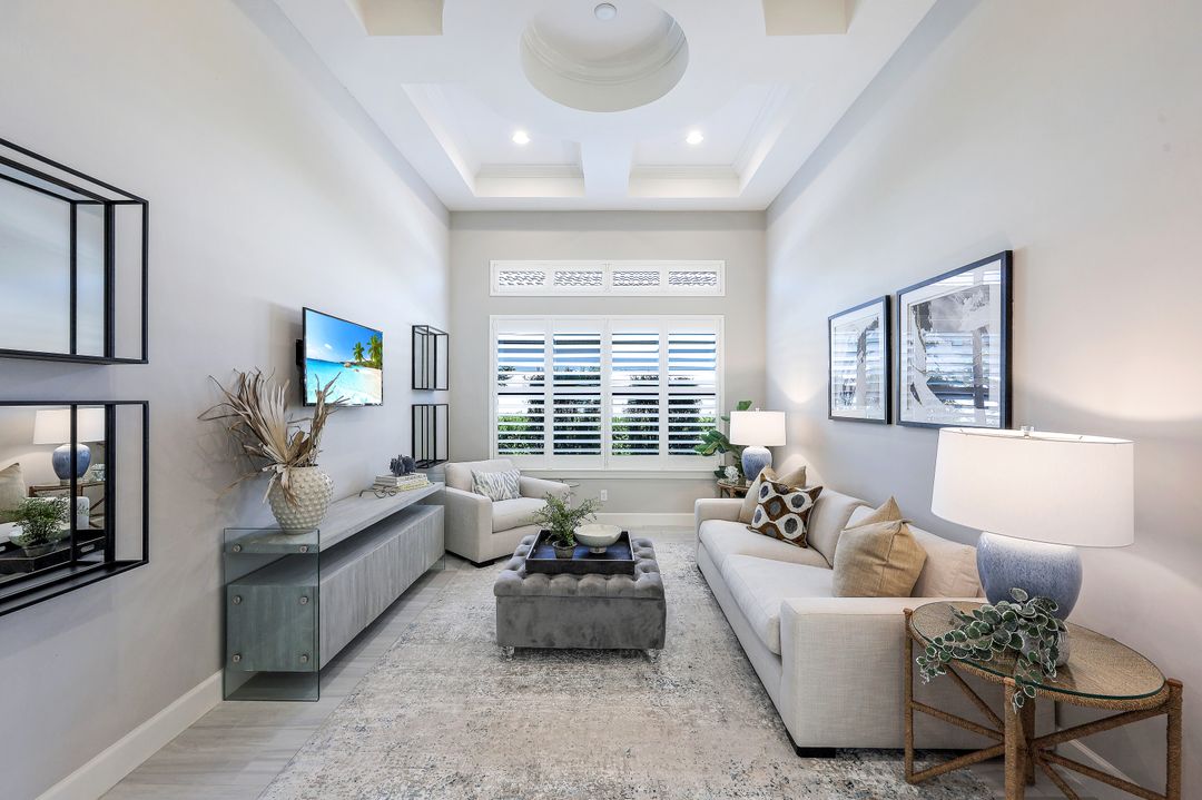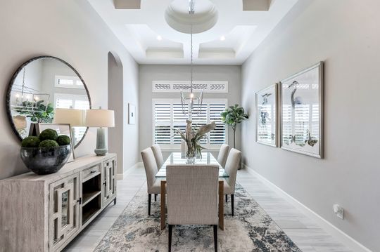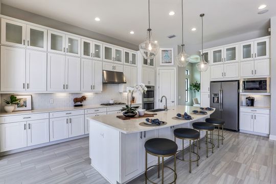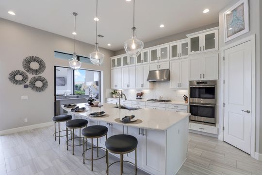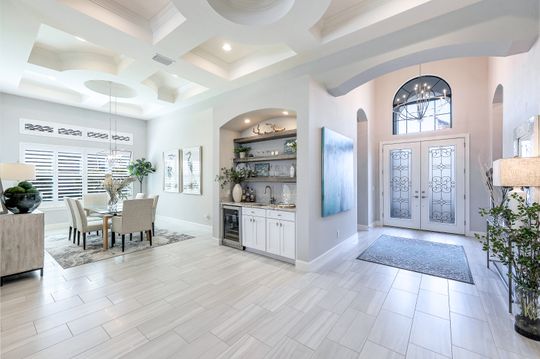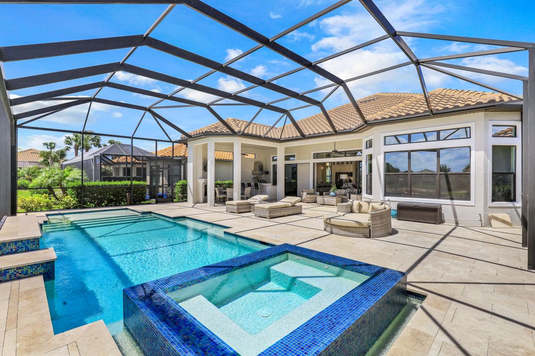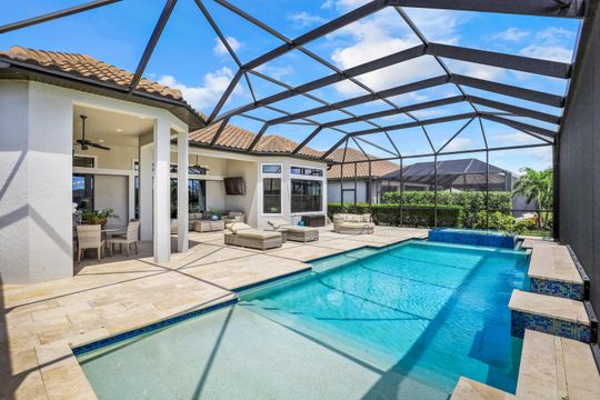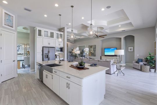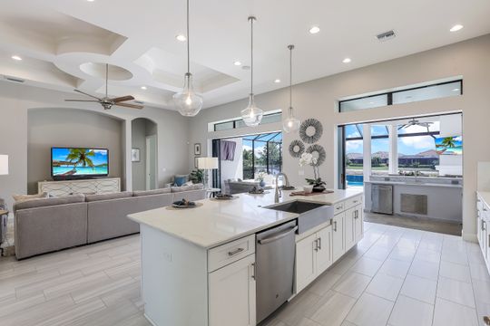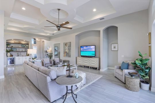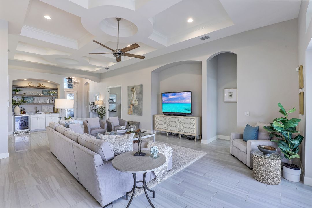 Step inside this FULL GOLF MEMBERSHIP INCLUDED "Francesco" (3+Den/3.5BA) and be greeted with 12' ceilings throughout, impressive coffered ceiling details, and spacious kitchen complete with GAS cooktop, double wall ovens, double stack cabinets, and quartz countertops. Two sets of sliding glass doors lead you to the extended covered lanai and pool deck with a massive GAS heated salt water pool/spa/sunshelf, outdoor kitchen, & GAS fireplace all overlooking the lake! Other features include: SOUTHERN EXPOSURE; fresh exterior paint; new plantation shutters (being installed mid April); Level VII tile; new solid flooring in the bedrooms. Esplanade is a true "Lifestyle Community" with something for everyone: Resort Pool complete with cabanas and beach entrance; 6 tennis courts; 4 bocce balls courts; 4 pickleball courts; Koquina Day Spa offering hair, nail, facial, and spa treatments; Techno Gym with Aerobics Room; Gated Dog Park; Poolside Bahama Bar; 14 miles of bike/walking trails; 18 hole private golf course (Can use your own cart); 15,000 Sq Ft Culinary Center featuring restaurant, bars, wine tasting room, wine lockers, & Starbucks style cafe! Total dues just $2,932/qtr including GOLF!