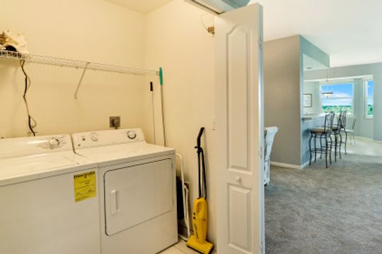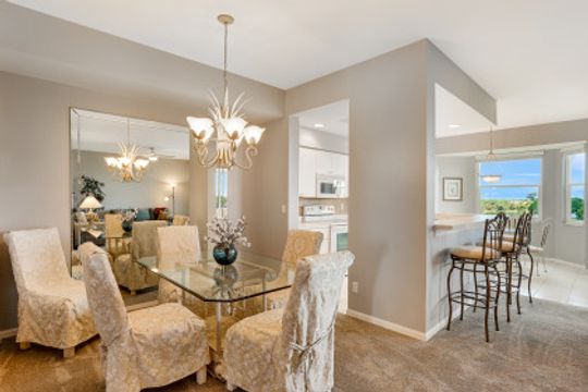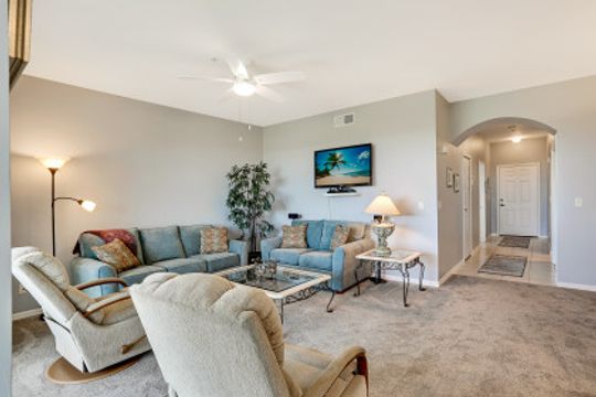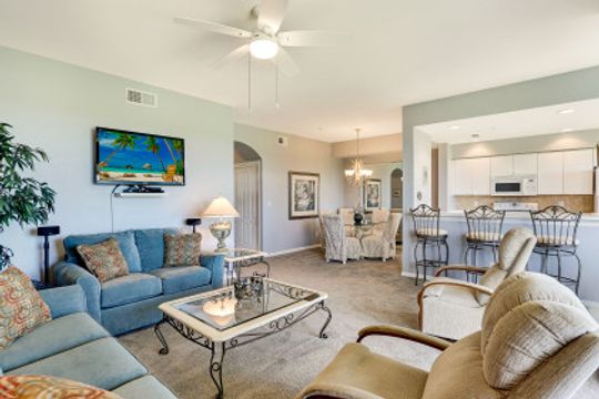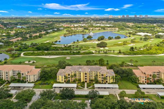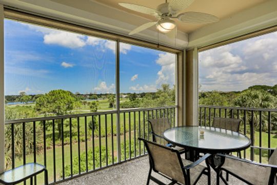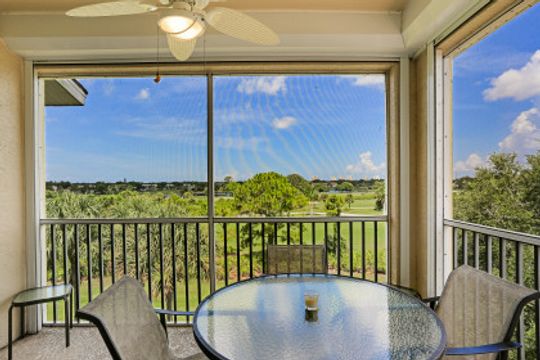 BRAND NEW AC AND IMPACT WINDOWS - rarely available "penthouse" corner unit with so much light! Enjoy the best of both worlds -- golf on site and Bonita Beach only a short drive away. Bright and spacious unit overlooking 18-hole golf course. This home awaits your personal touch -- so much room, a blank canvas where you can be creative. Large, open living/dining/kitchen area, lanai overlooking golf course perfect for observing the western sky, a master bedroom suite and a spacious guest bedroom. There is also a lovely foyer/entrance area, which helps to make the unit feel more like a home! Highland Woods is a preferred community with amenities that include clubhouse with both formal and casual dining, outdoor patio with fire pits, 18 hole course designed by Gordon Lewis, Fitness Center with a multitude of classes, Bocce Ball, heated clubhouse pool/spa, 4 lighted tennis courts and SO many club activities and events to choose from. Hurry, as corner units with views like this are rarely available in Highland Woods.