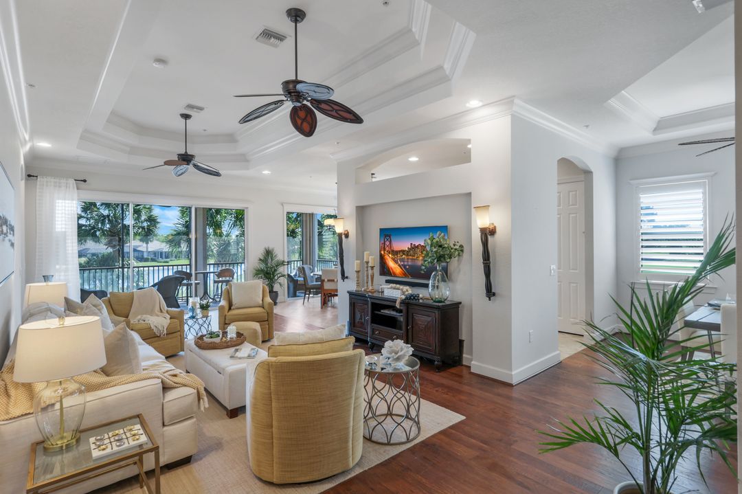 LIVE A VACATION LIFESTYLE IN THE QUARRY! This freshly painted FURNISHED 2nd floor corner unit coach home (3+Den/2.5Baths/2Car Garage) is situated on the end of the cul-de-sac offering sweeping views of the lake and golf course. Southern exposure makes this condo light & bright! A long list of special features include: rich wood floors throughout the common areas; oversized crown molding; plantation shutters on all windows; electric roll down hurricane screens on the lanai; upgraded lights & fans; BRAND NEW AC; double tray ceiling in the great room; 8' doors & 10' ceilings; and more! The Quarry is a lakefront community offering something for everyone: Boating, Golf, Tennis, Pickleball, Bocce Ball, Tiki Bar, Restaurant, Pool-Side Food/Drink Service, Gym, Social Activities, and more! The Quarry offers a lifestyle like no other including the BRAND NEW "Lake Lodge & Beach Club", over 500 acres of navigable lakes (boat slips available for lease), & a private separate 18 hole Golf Club with optional memberships. The fully renovated Beach Club & Lake Lodge just underwent a $18M renovation and is OPEN THIS MONTH! HOA dues include access to ALL community amenities within The Quarry.