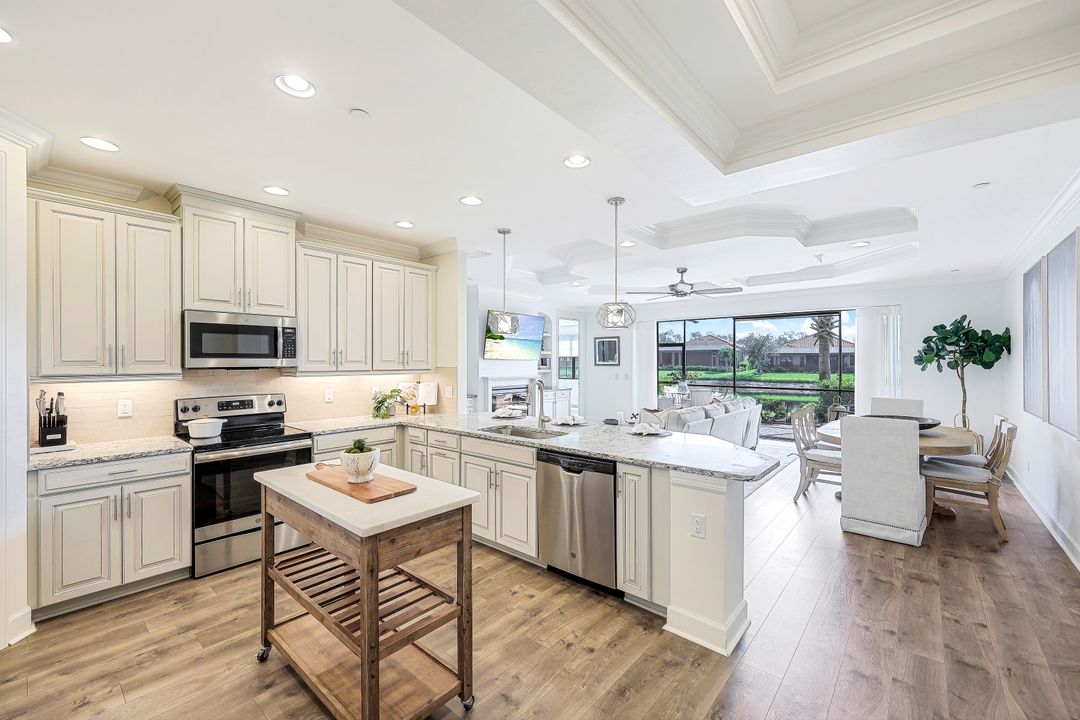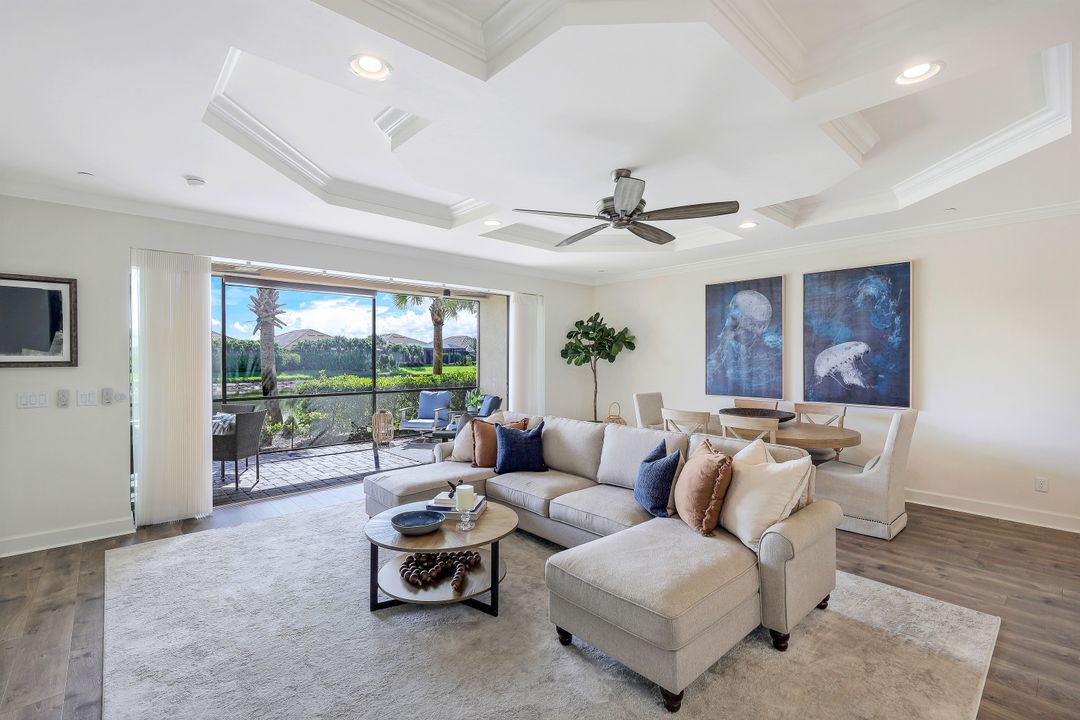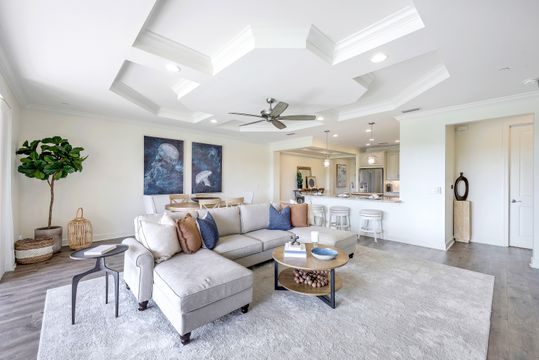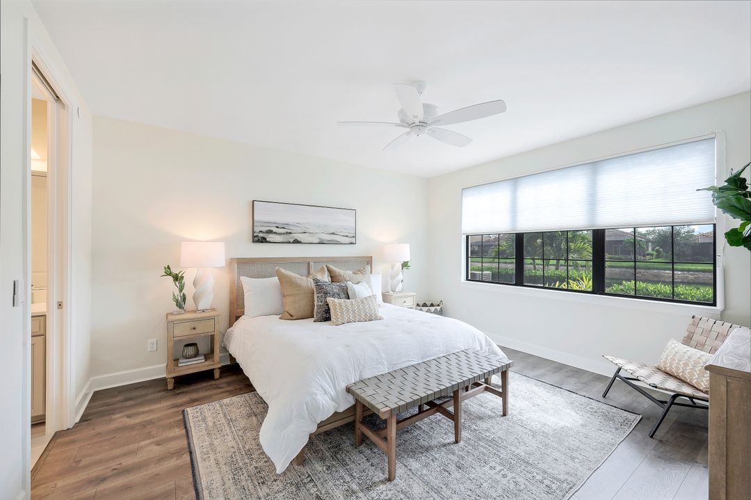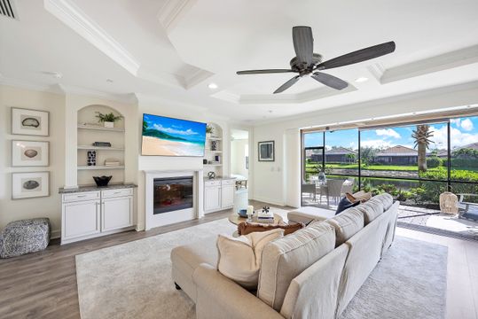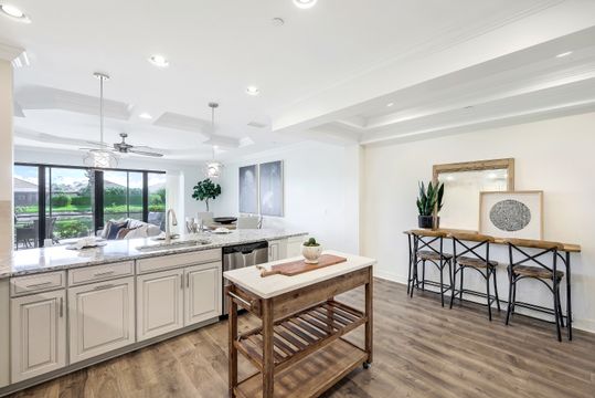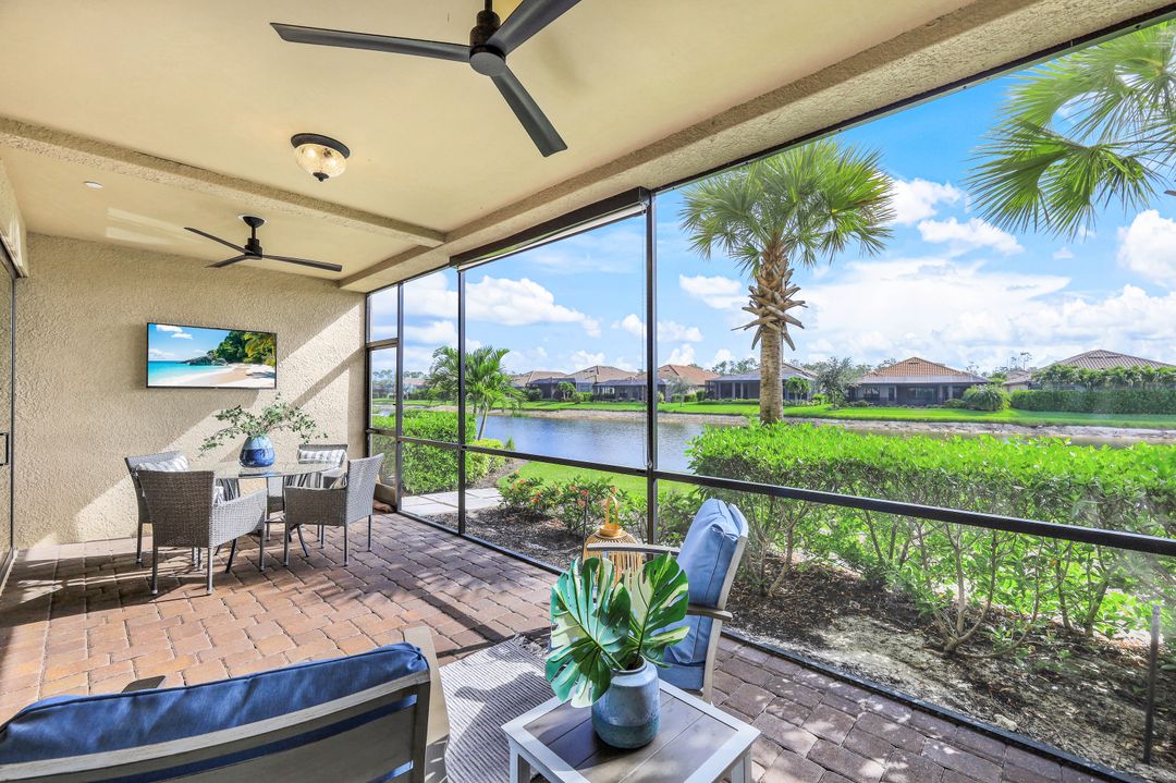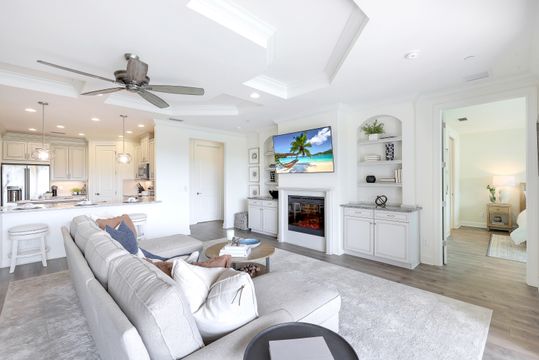LIVE A VACATION LIFESTYLE IN ESPLANADE! This 2 bed/2 bath/1 car attached garage condo lives big with an open great room style floorplan, 16' pocket sliding glass door to a 23'x10' covered & screened lanai overlooking a tranquil lake. Fine appointments include: luxury laminate flooring throughout (no carpeting); electric blinds; closet built-ins; quartz countertops throughout; electric fireplace; frameless shower doors; IMPACT WINDOWS/DOORS; and more! This condo includes a CLUB/SPORTS MEMBERSHIP which gives you access to all amenities with the exception of in-season golf! Esplanade G&CC is a true "Lifestyle Community" with something for everyone: Resort Pool complete with cabanas and beach entrance; 6 tennis courts; 4 bocce balls courts; 4 pickleball courts; Koquina Day Spa offering hair, nail, facial, and spa treatments; Techno Gym with Aerobics Room; Gated Dog Park; Poolside Bahama Bar; 14 miles of bike/walking trails; 18 hole private golf course; 15,000 Sq Ft Culinary Center featuring restaurant, bars, wine tasting room, wine lockers, & Starbucks style cafe! Total dues just $833/month and includes water/sewer, insurance, building maintenance, & ALL club amenities!